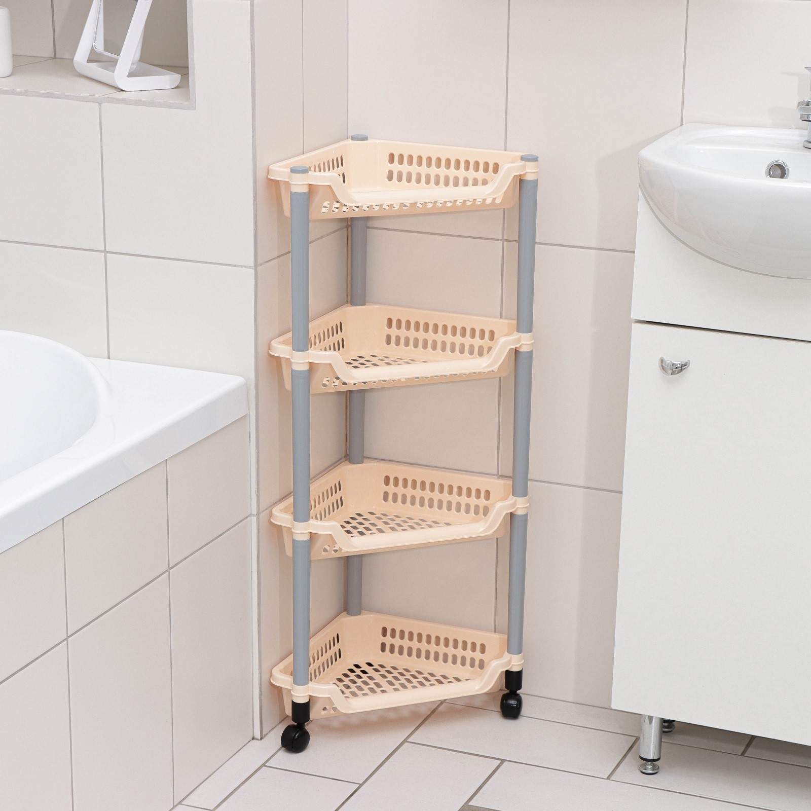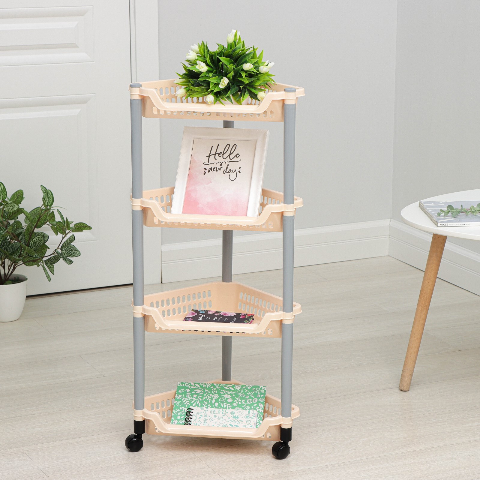 Этажерка угловая 4-х секционная, на колёсиках, цвет микс.   Прочный пластмассовый корпус стеллажа выдерживает высокую нагрузку, а колёсики обеспечивают мобильность изделия. Удобная, компактная, но в то же время вместительная, она прекрасно впишется в пространство любого помещения. Изделие можно расположить на кухне, в прихожей, ванной, гостиной, детской или спальне.  Этажерка найдёт своё применение: дома — для хранения обуви, одежды, хозтоваров, посуды, принадлежностей для душа или игрушек;в гараже — для рабочих приспособлений, таких как отвёртки, молотки, шурупы, гайки и прочие мелкие вещи;на даче — для садового инструмента или предметов в домике.  Цвет: МИКС Ширина, мм: 380 Глубина, мм: 300 Высота, мм: 820 Количество секций: 4 На колёсиках: Да Материал: Пластик  развернуть описание ▼
