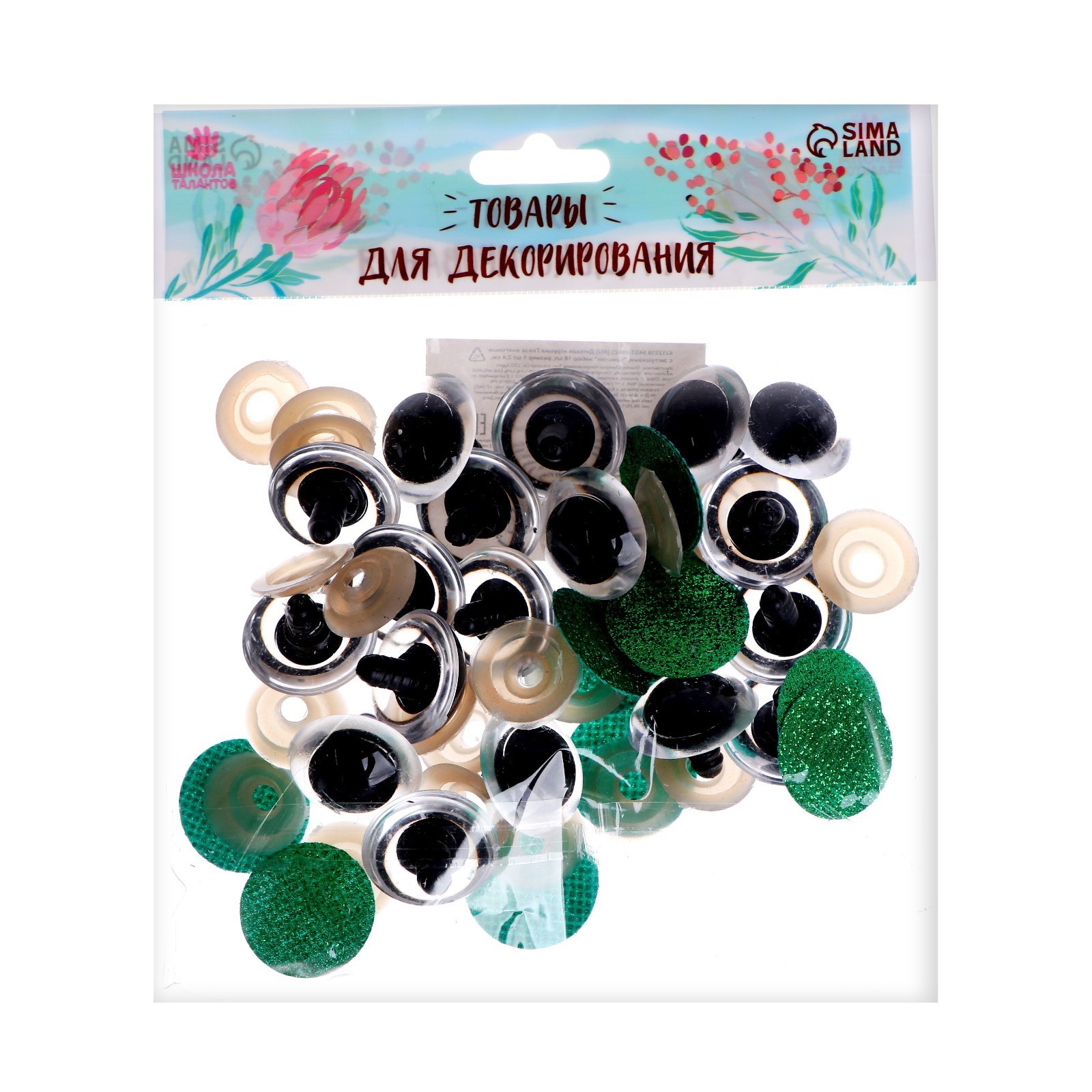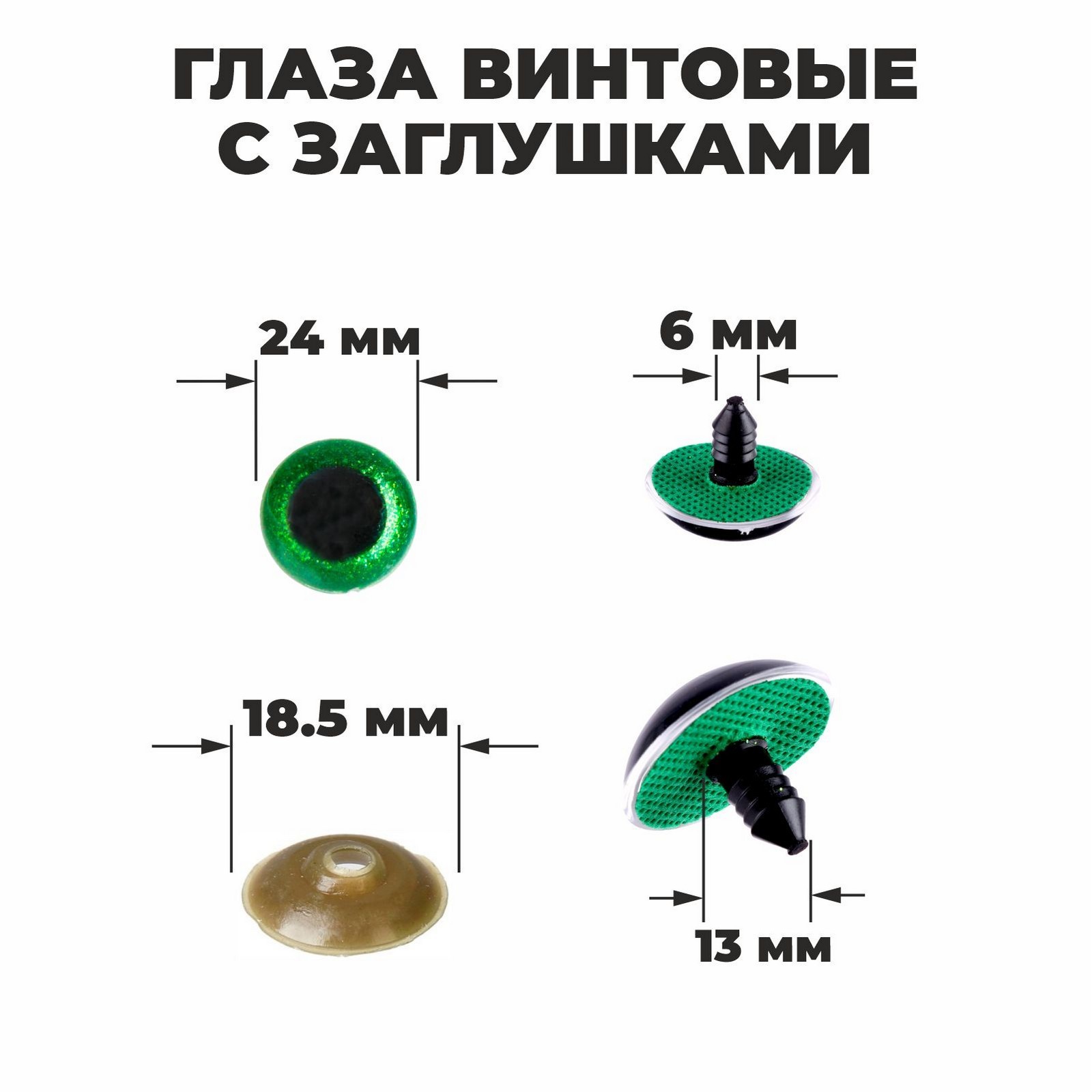 Глаза винтовые с заглушками, «блёстки» набор 18 шт., размер 1 шт.: 2.4 см, зелёные