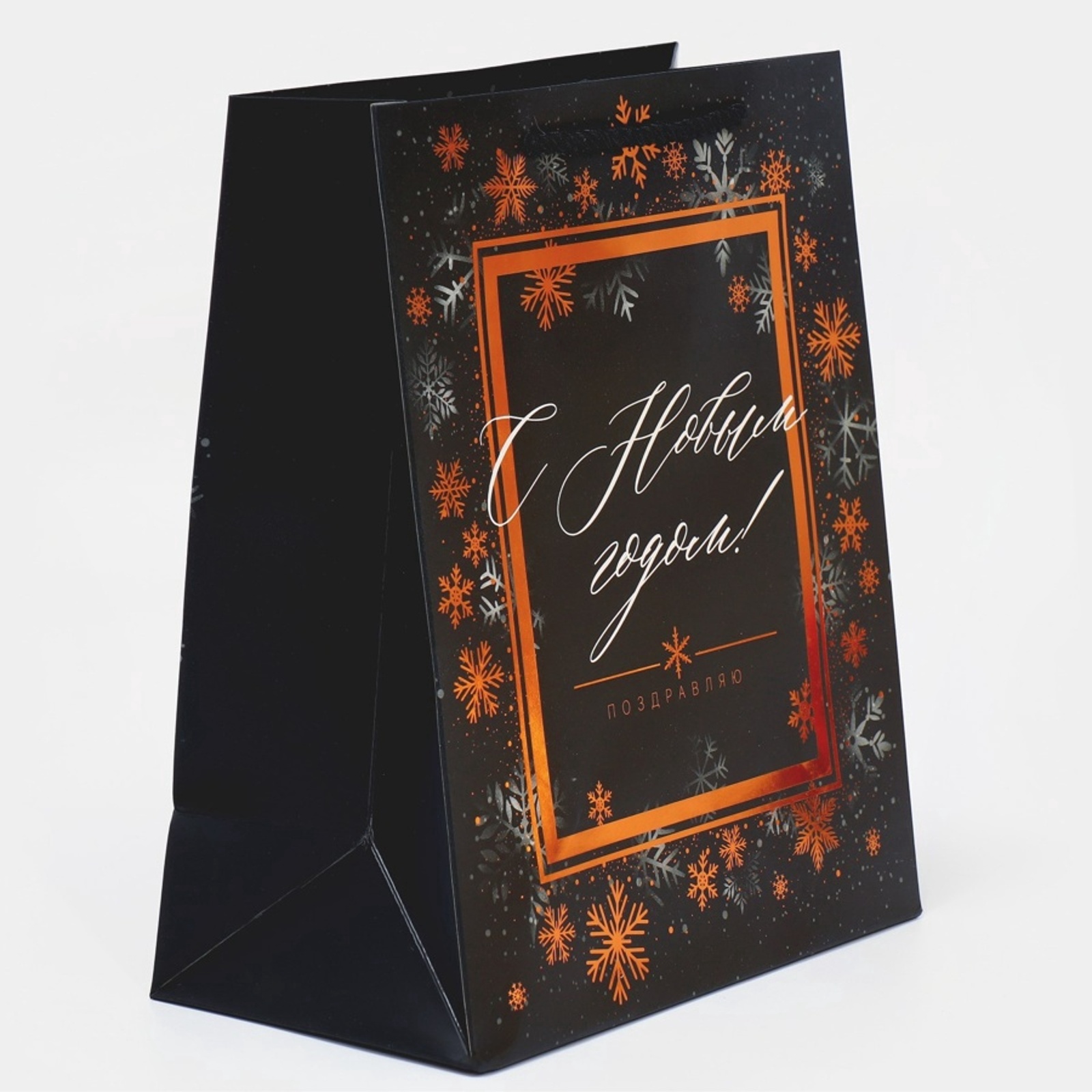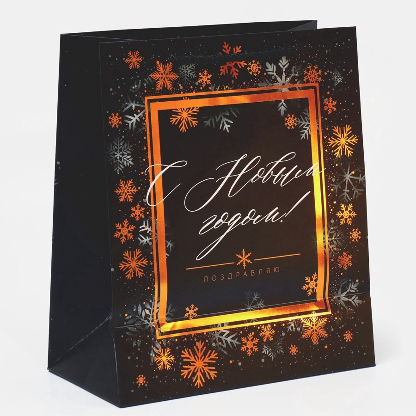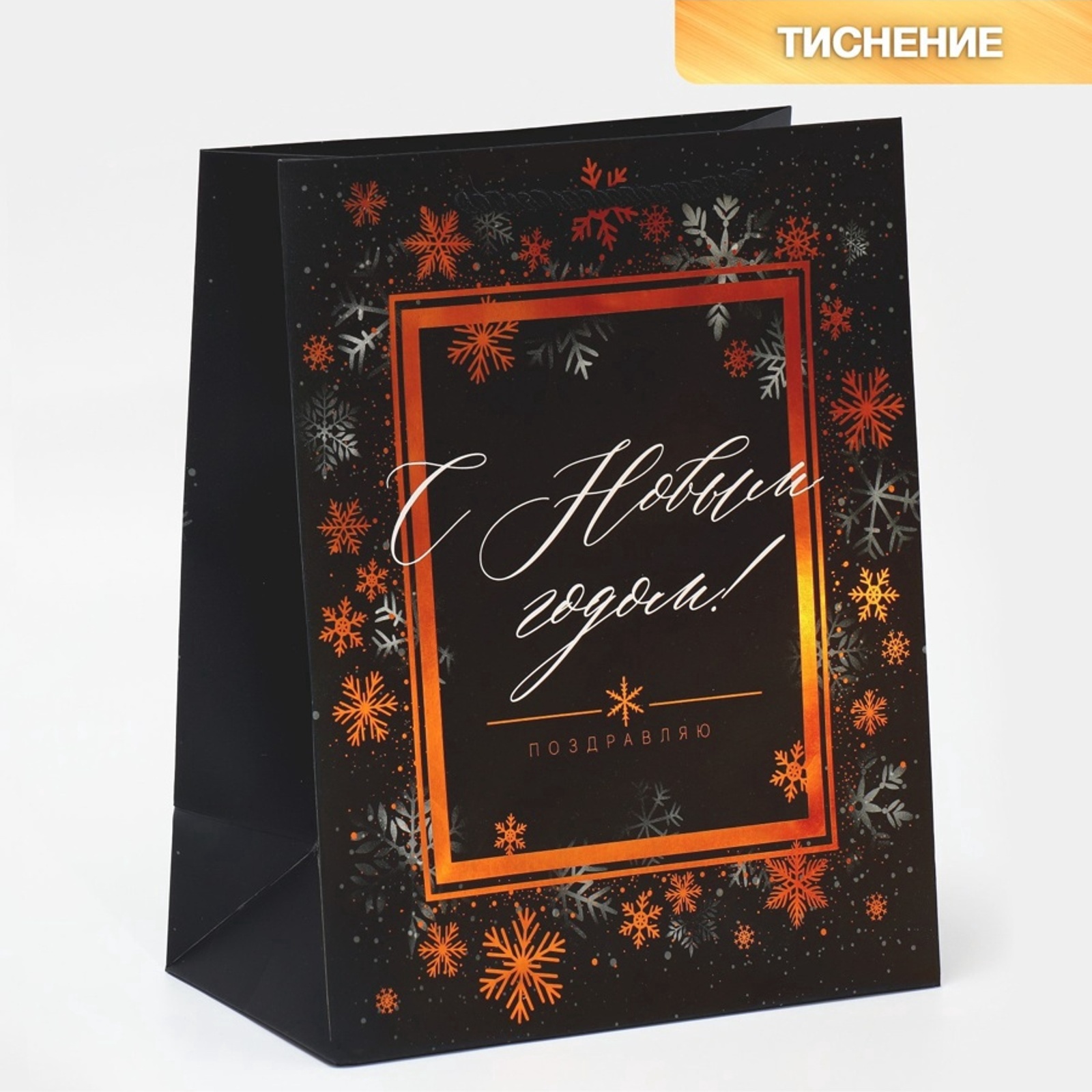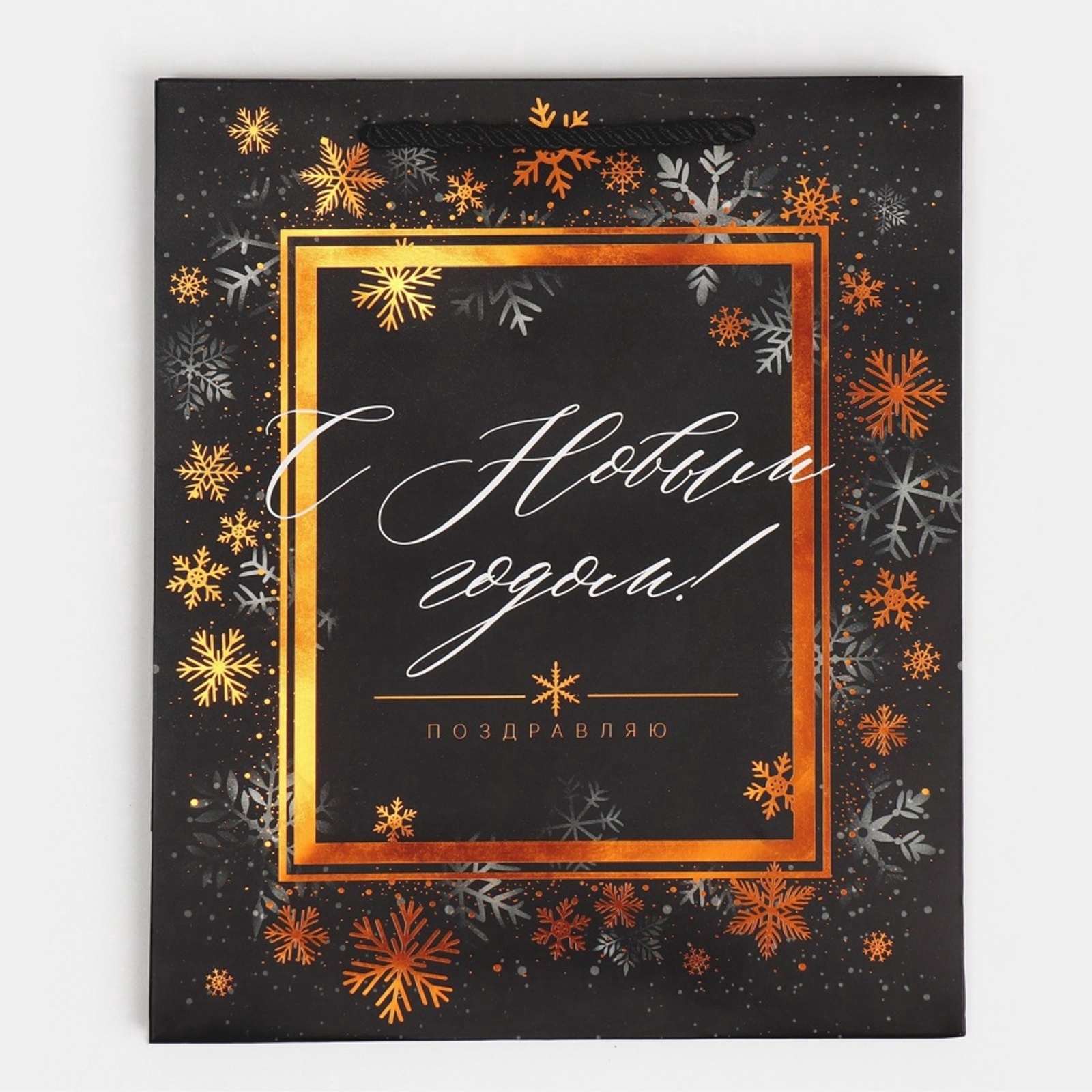Пакет подарочный «поздравляю с новым годом!», 23 х 27 х 10 см. Цвет:Чёрный|Цвет:Золотистый|Для кого:Унисекс|Плотность, г/м :210|Тематика:Зима|Тематика:Новогодняя|Рисунок:Да|Символ года:Нет|Тематика праздника:Новый год|Материал:Бумага|Отделка пакета:Ламинация|Отделка пакета:Тиснение|Вид ручки:Ручка-шнур|Форма пакета:Вертикальный|Особенности:Без особенностей|Страна:Китай  развернуть описание ▼