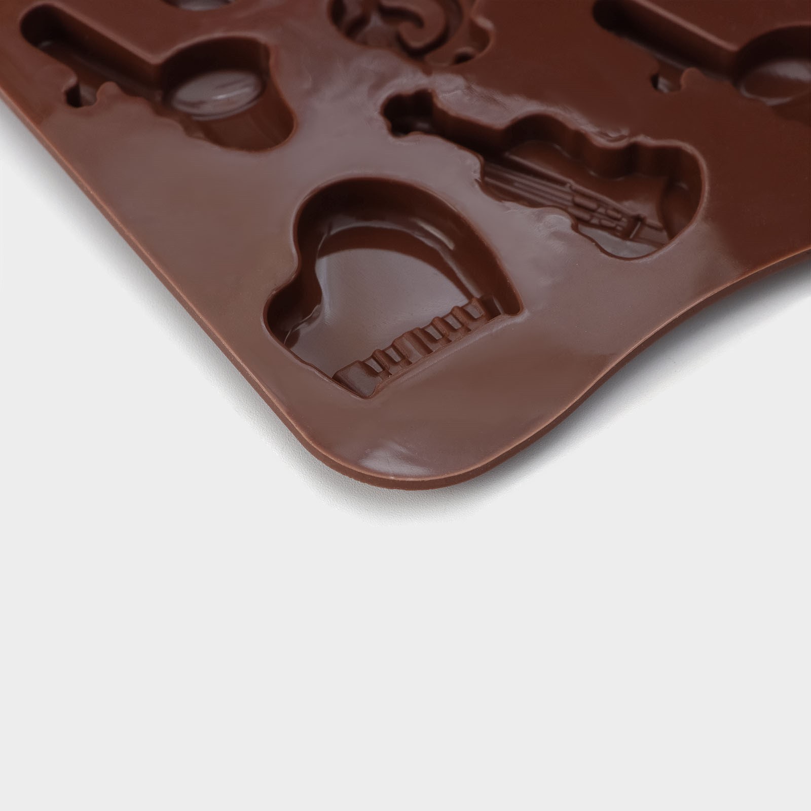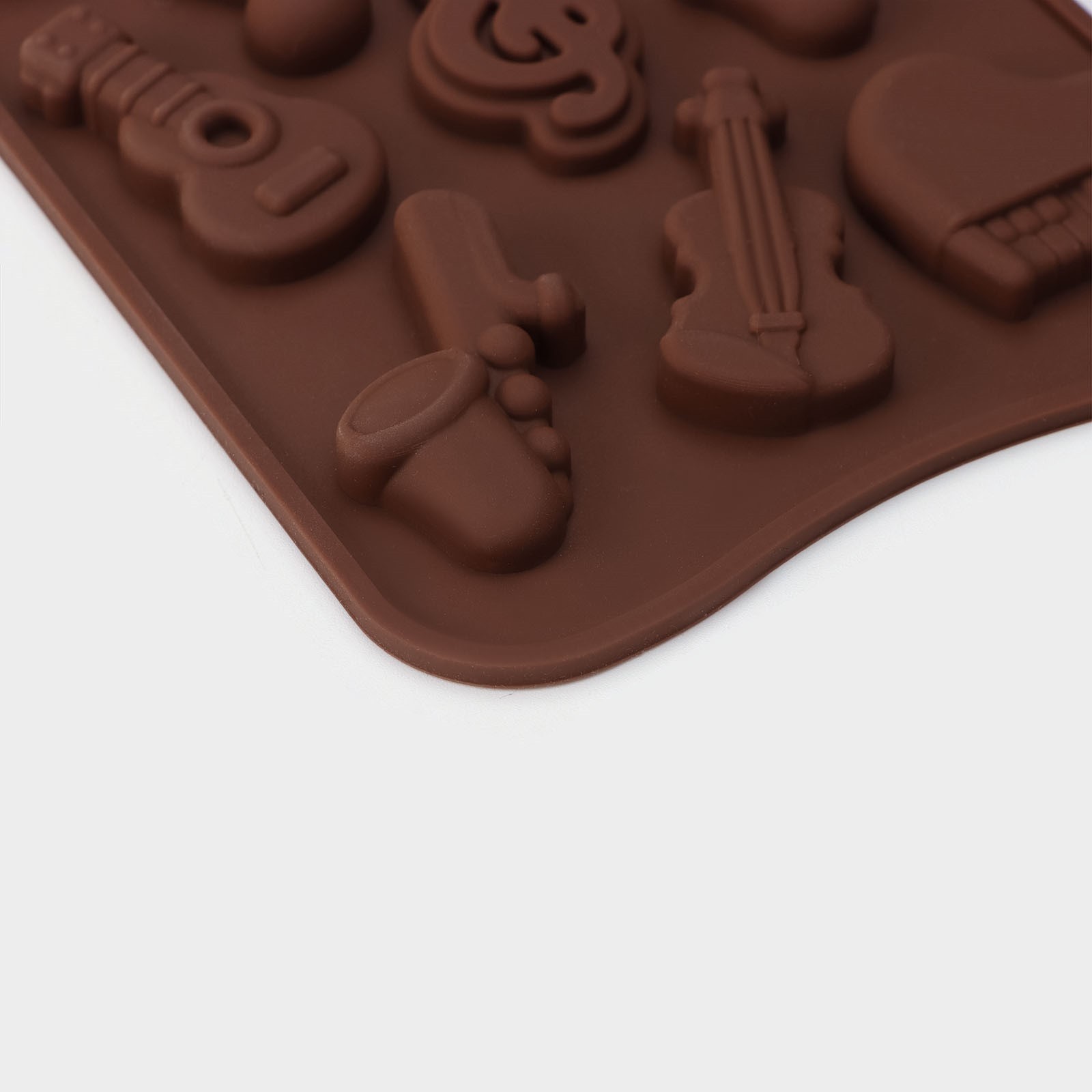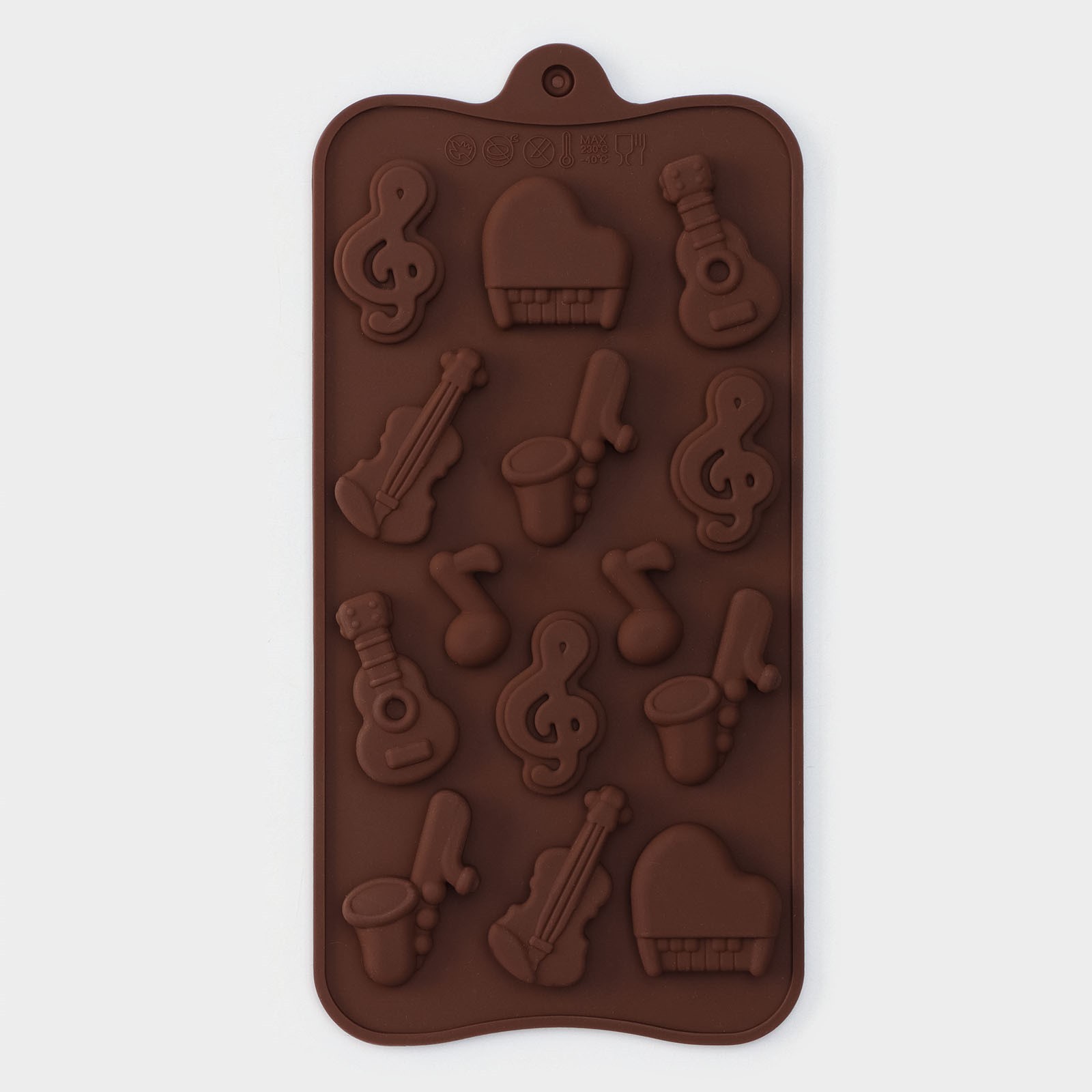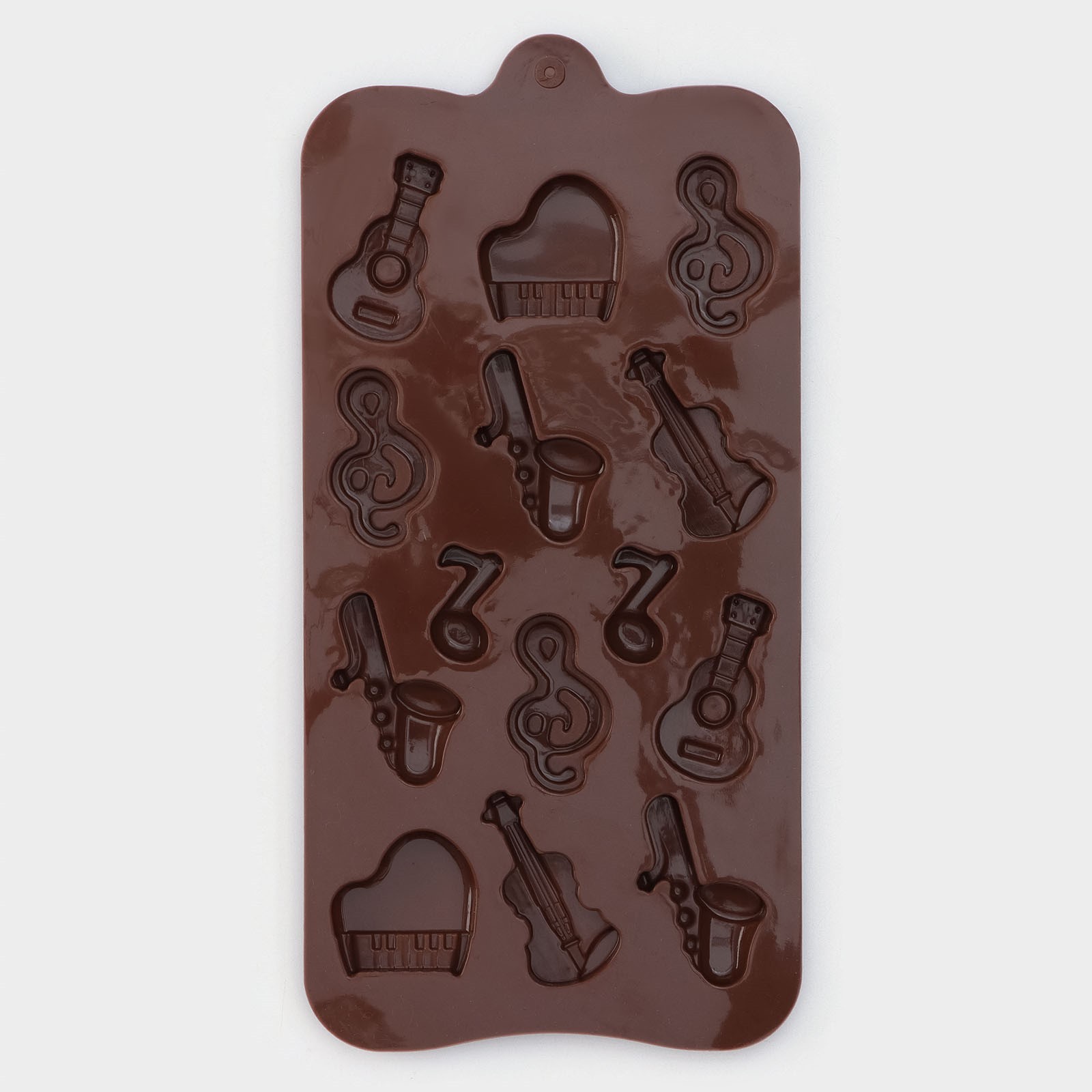 Форма силиконовая для украшений доляна «музыкальные инструменты», 21,5x10,5 см, 14 ячеек, цвет микс. Силиконовые формы для кондитерских украшений помогут оригинально декорировать десерт или выпечку! Приготовить миниатюрные украшения гораздо проще, чем кажется. Наполните силиконовую ёмкость расплавленным шоколадом, мастикой, карамелью и поместите в морозильную камеру. Вскоре у вас будут оригинальные сладости, которые сделают запоминающимся любой праздничный стол! Достоинства: содержимое не прилипает к стенкам изделия;силикон выдерживает температуру от -40 до 230 °С;материал не впитывает запахов и полностью безопасен для продуктов питания;форма легко отмывается. Создавайте неповторимые кулинарные шедевры вместе с формой «Музыкальные инструменты»! Цвет: МИКС Форма: Фигурная Количество ячеек: 14 Крышка: Нет Материал: Силикон Тип покрытия: Без покрытия Ячейки: Да Наличие палочек для форм: Нет Разъёмная форма: Нет Съёмное дно: Нет Тематика: Музыка Можно мыть в посудомоечной машине: Нет  развернуть описание ▼