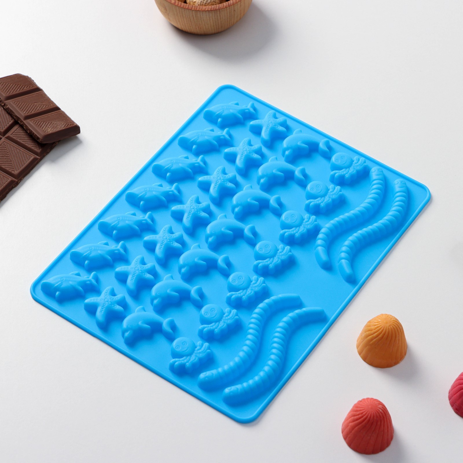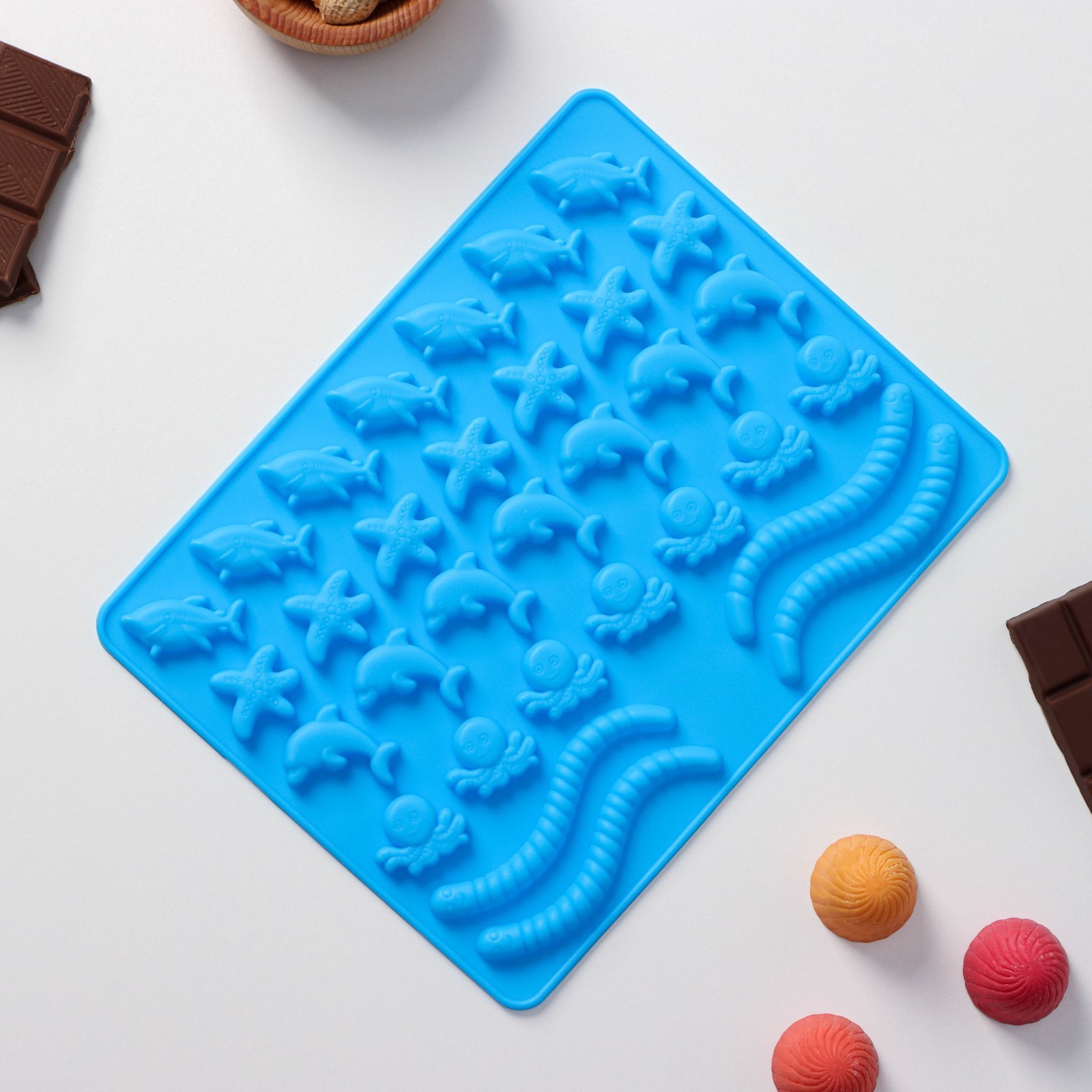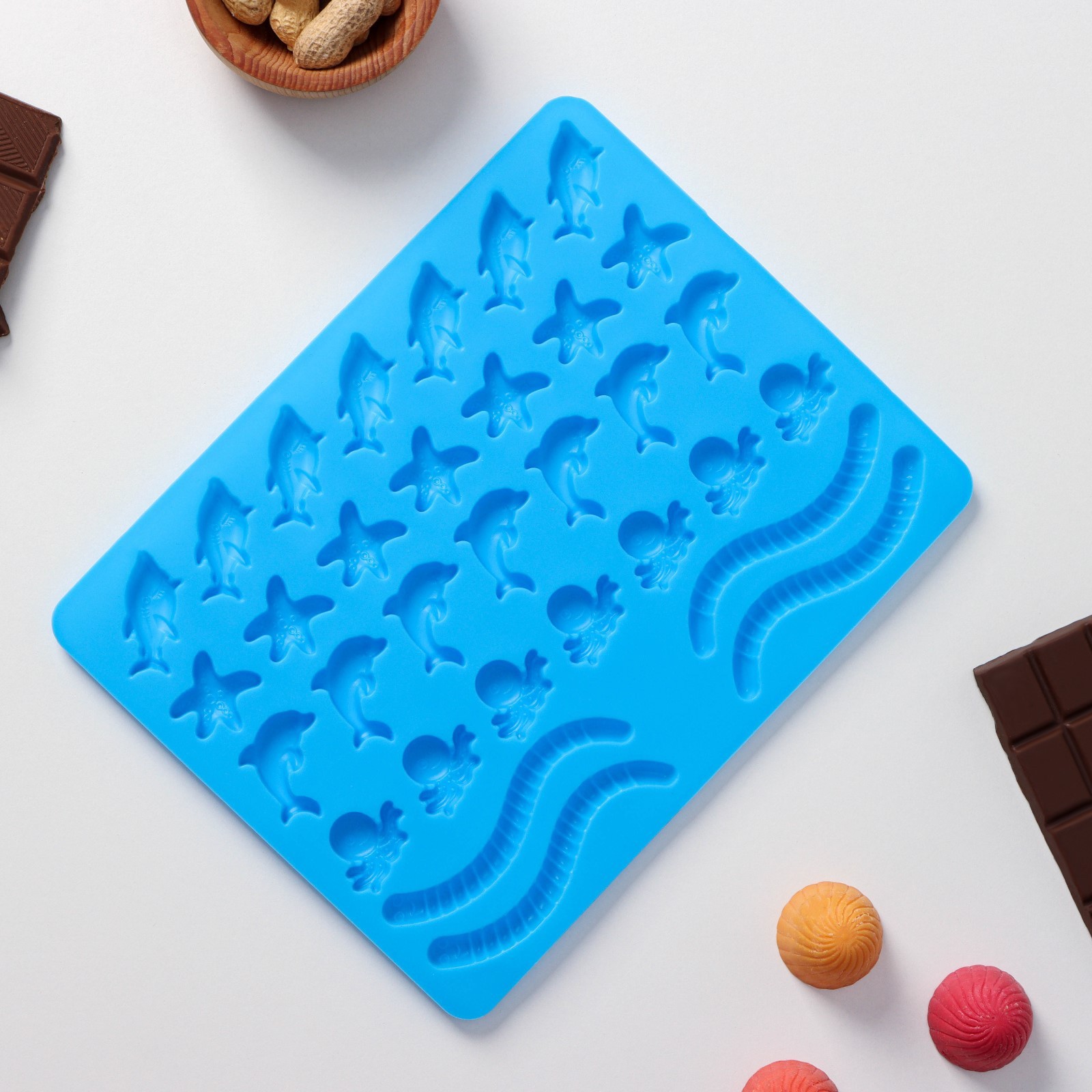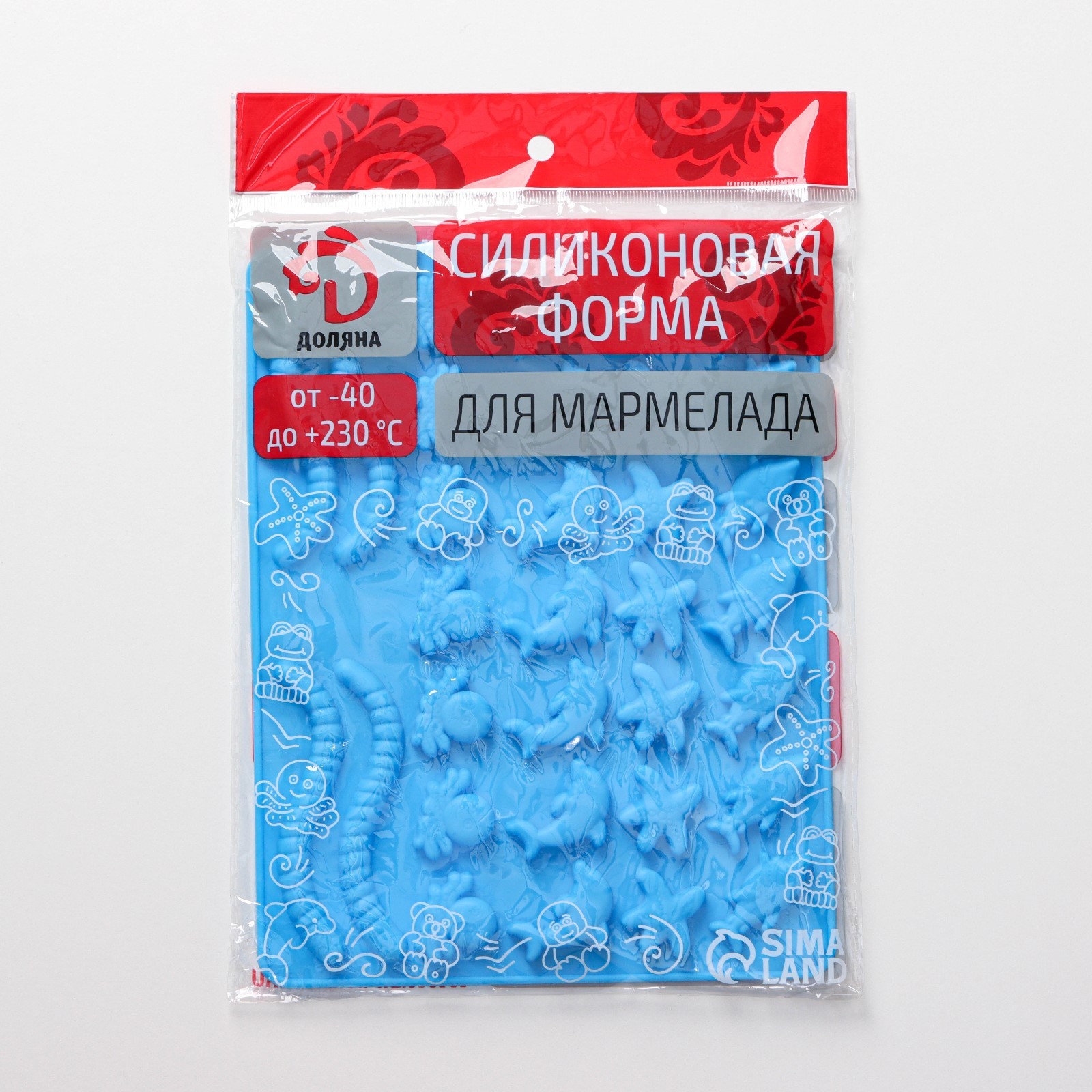 Форма для мармелада доляна «морские сладости», 22,3x17,2 см, 32 ячейки (2,7x2 см), цвет голубой. Силиконовые формы для мармелада помогут приготовить вкусные и натуральные желейные десерты в домашних условиях! Форма изготовлена из качественного силикона, что гарантирует долгий срок службы. Удобный дизайн позволяет легко извлекать готовый мармелад, а благодаря своей гибкости, форма обеспечивает идеальную текстуру мармелада. Достоинства: содержимое не прилипает к стенкам изделия;силикон выдерживает температуру от -40 до 230 °С;материал не впитывает запахов и полностью безопасен для продуктов питания;форма легко отмывается, в том числе в посудомоечной машине. Создавайте неповторимые кулинарные шедевры вместе с формой «Морские сладости»! Цвет: МИКС Форма: Прямоугольная Количество ячеек: 32 Крышка: Нет Материал: Силикон Тип покрытия: Без покрытия Ячейки: Да Наличие палочек для форм: Нет Разъёмная форма: Нет Съёмное дно: Нет Тематика: Море, пляж, отпуск Тематика: Животный мир  развернуть описание ▼