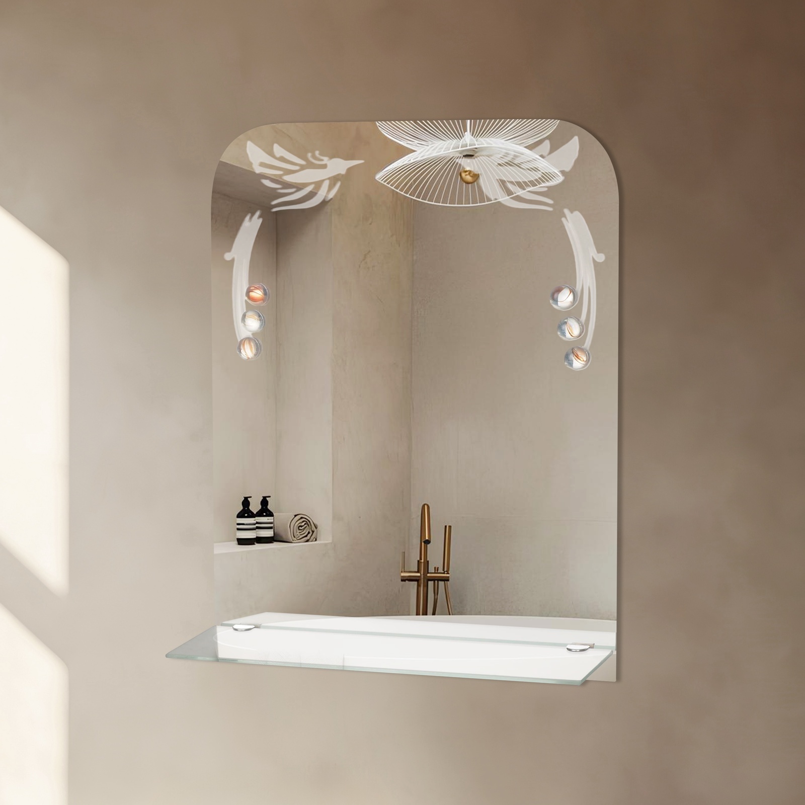 Зеркало «райские птицы», с пескоструйной графикой и фьюзингом, настенное, с полочкой, 35x45