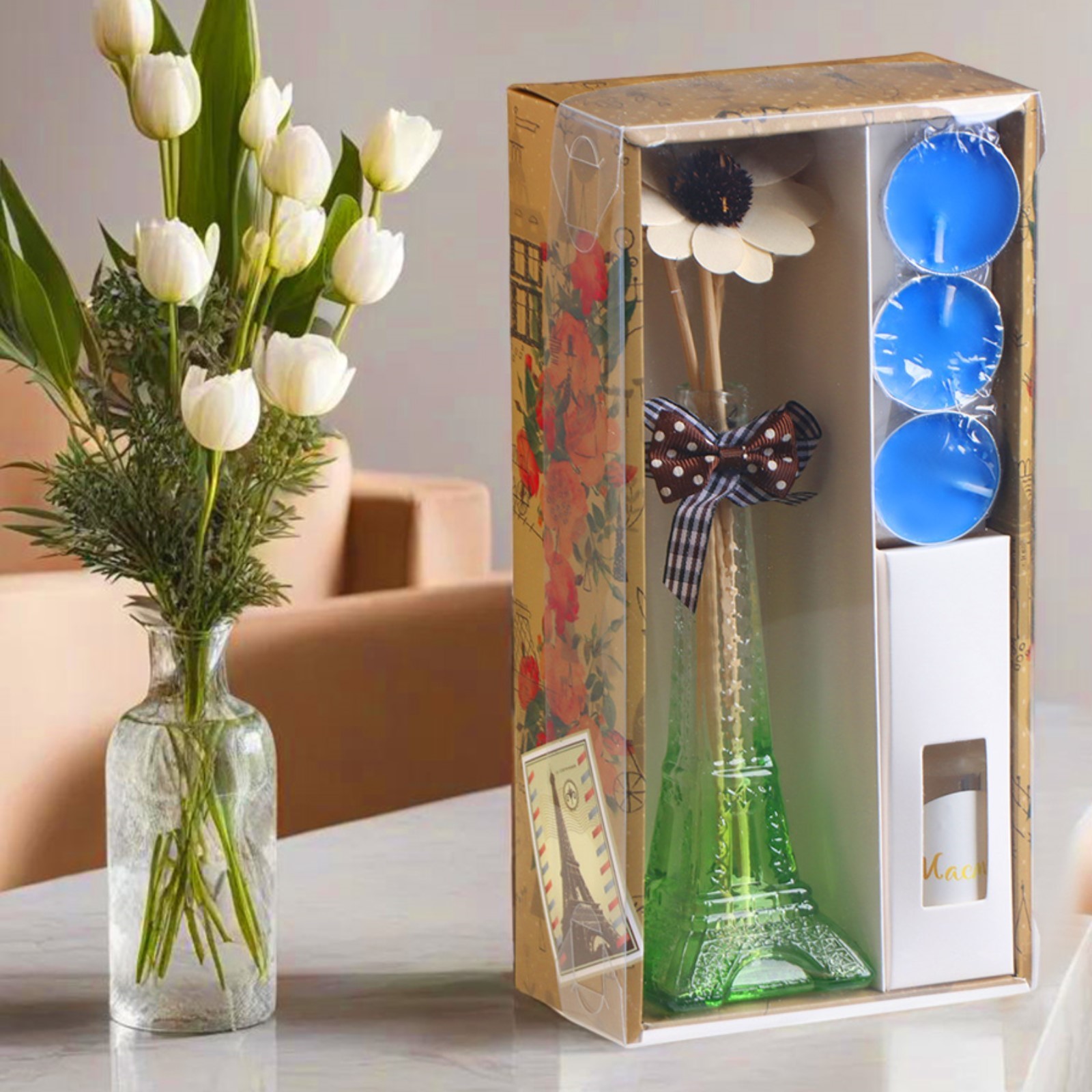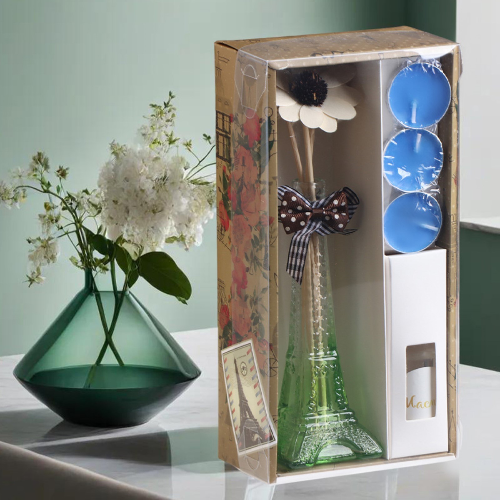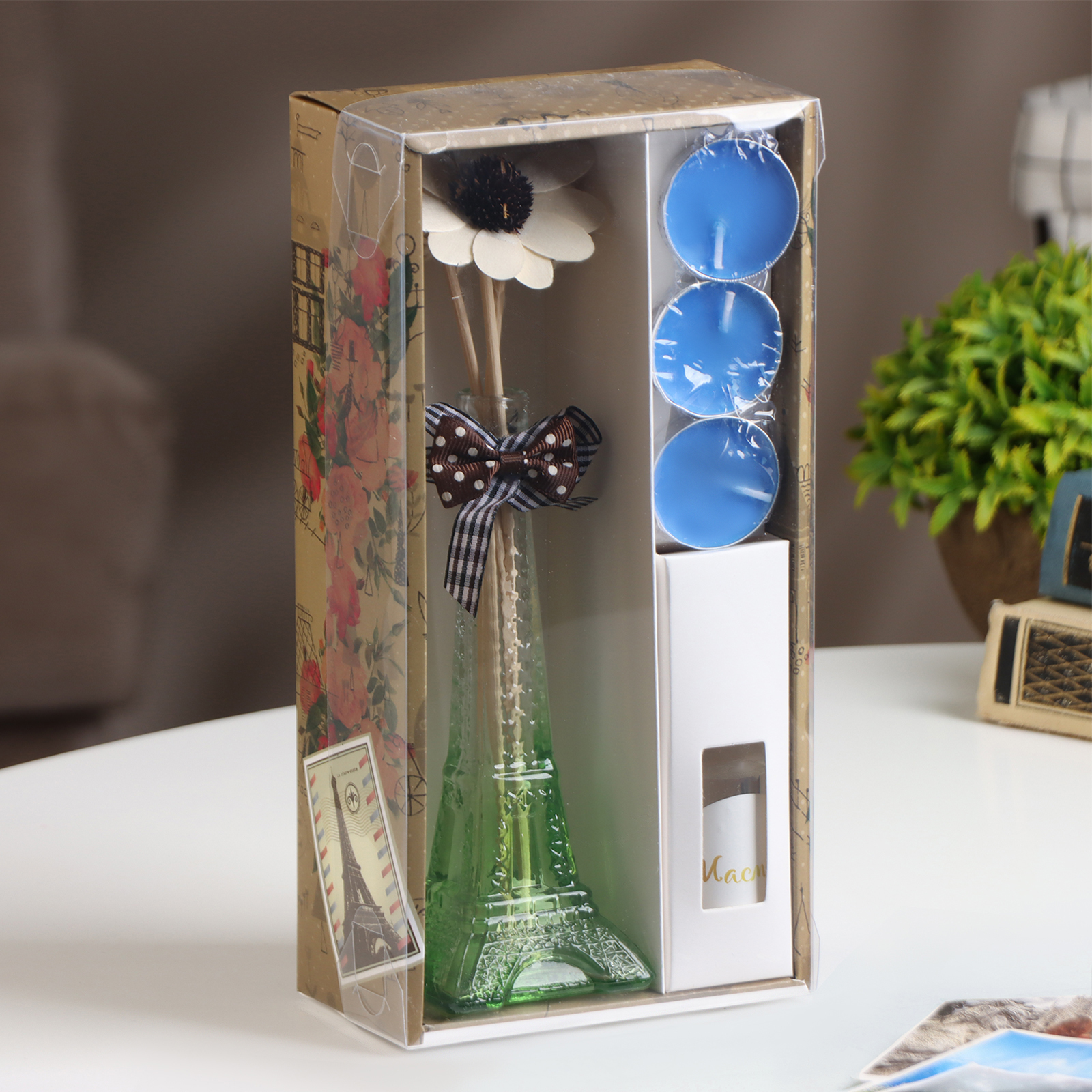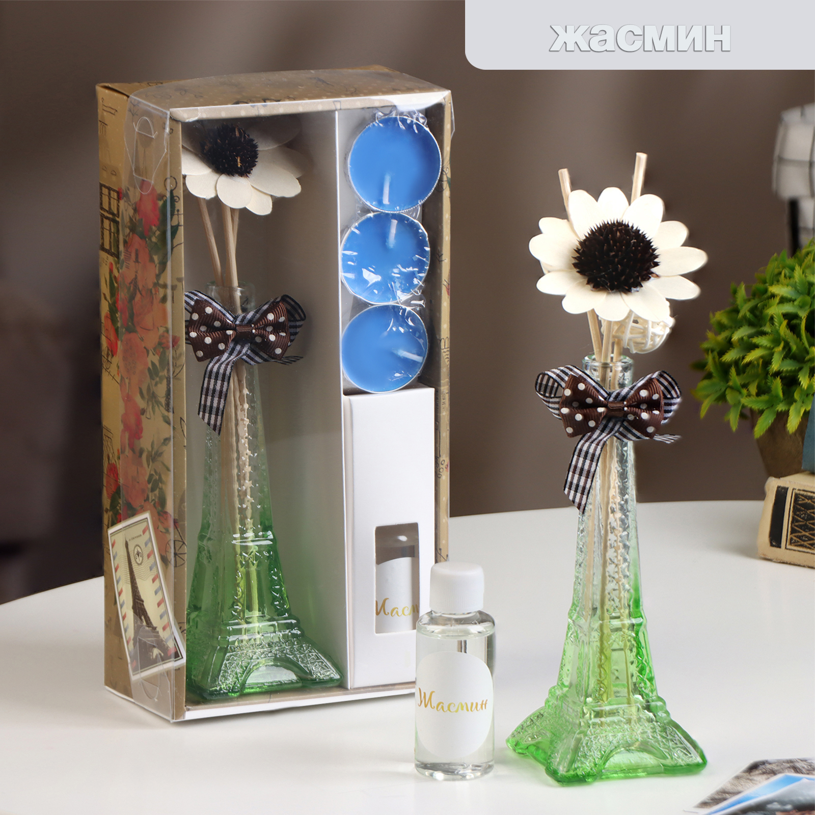 Набор подарочный "париж" (диффузор и свечи) жасмин, "богатство аромата" 8 марта. Ощутите волшебство Парижа прямо у себя дома с нашим уникальным набором в стиле Эйфелевой башни. Этот диффузор, выполненный в форме изящного символа Франции, не только наполнит ваш дом уютом, но и придаст ему неповторимый шарм. В комплекте с диффузором вы найдете чайные свечи, создающие приглушенное освещение и добавляющие нотки романтики в атмосферу, а также аромамасло, которое наполнит помещение нежным, умиротворяющим ароматом. Разгрузите свой день и погрузитесь в атмосферу спокойствия и расслабления с нашим набором, который привнесет в вашу жизнь частичку волшебства Парижа. Для кого: Для женщины Для кого: Унисекс В наборе, шт.: 4 Объём, мл: 30 Вид упаковки: Коробка Адресат: Без адресата Вид ароматизатора: Диффузор Аромат: Жасмин Составляющие набора: Ваза Составляющие набора: Декор Составляющие набора: Аромамасло Составляющие набора: Свеча Возраст: Для взрослых Тематика подарка: Интерьер  развернуть описание ▼