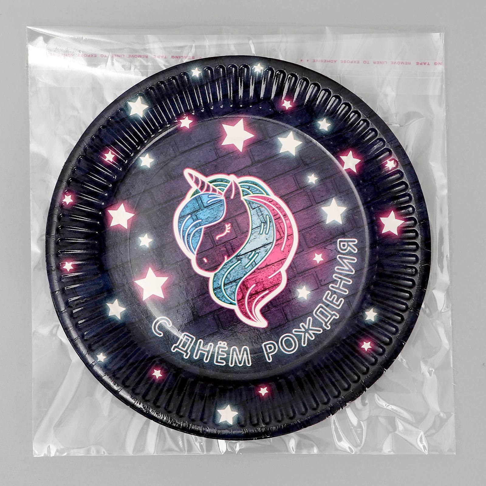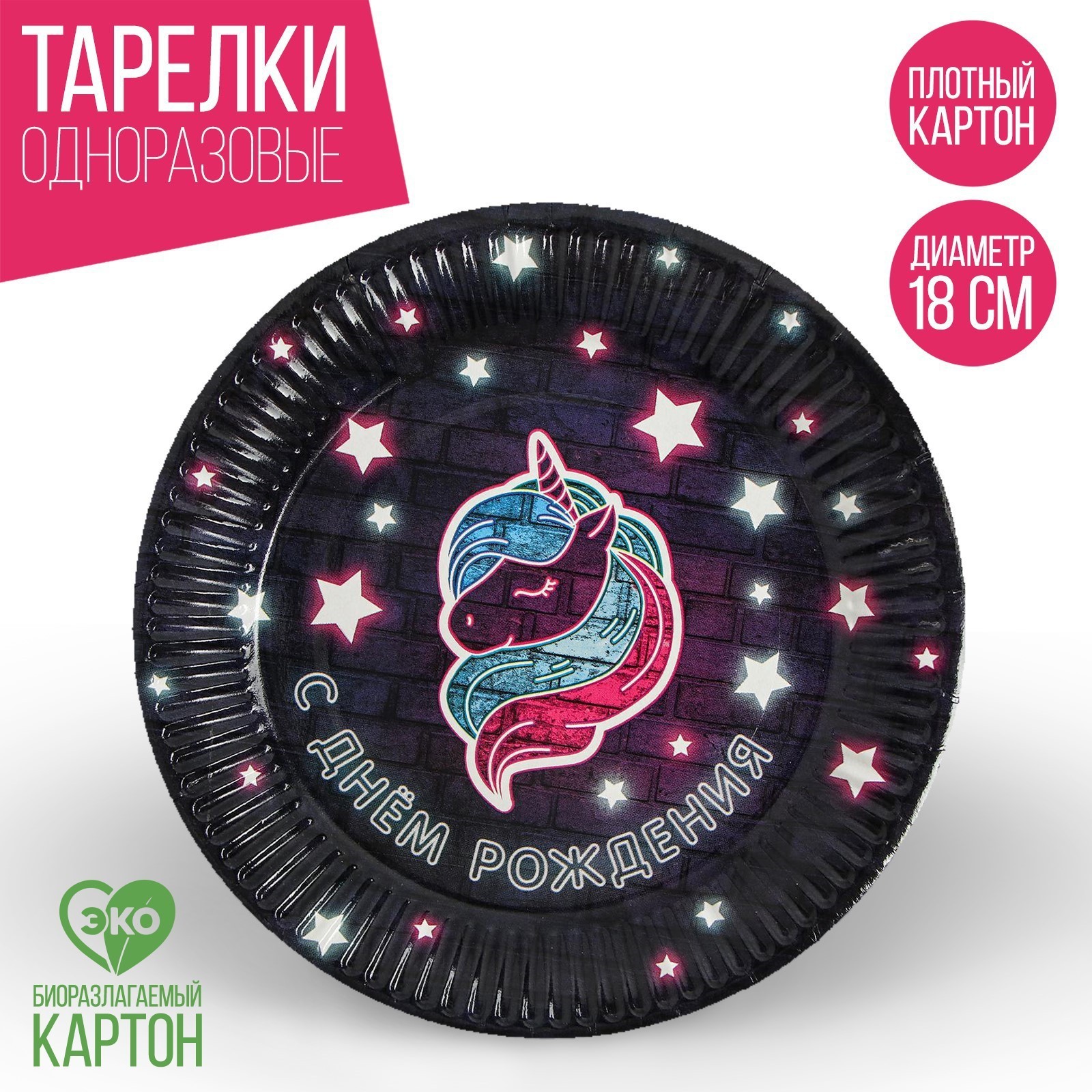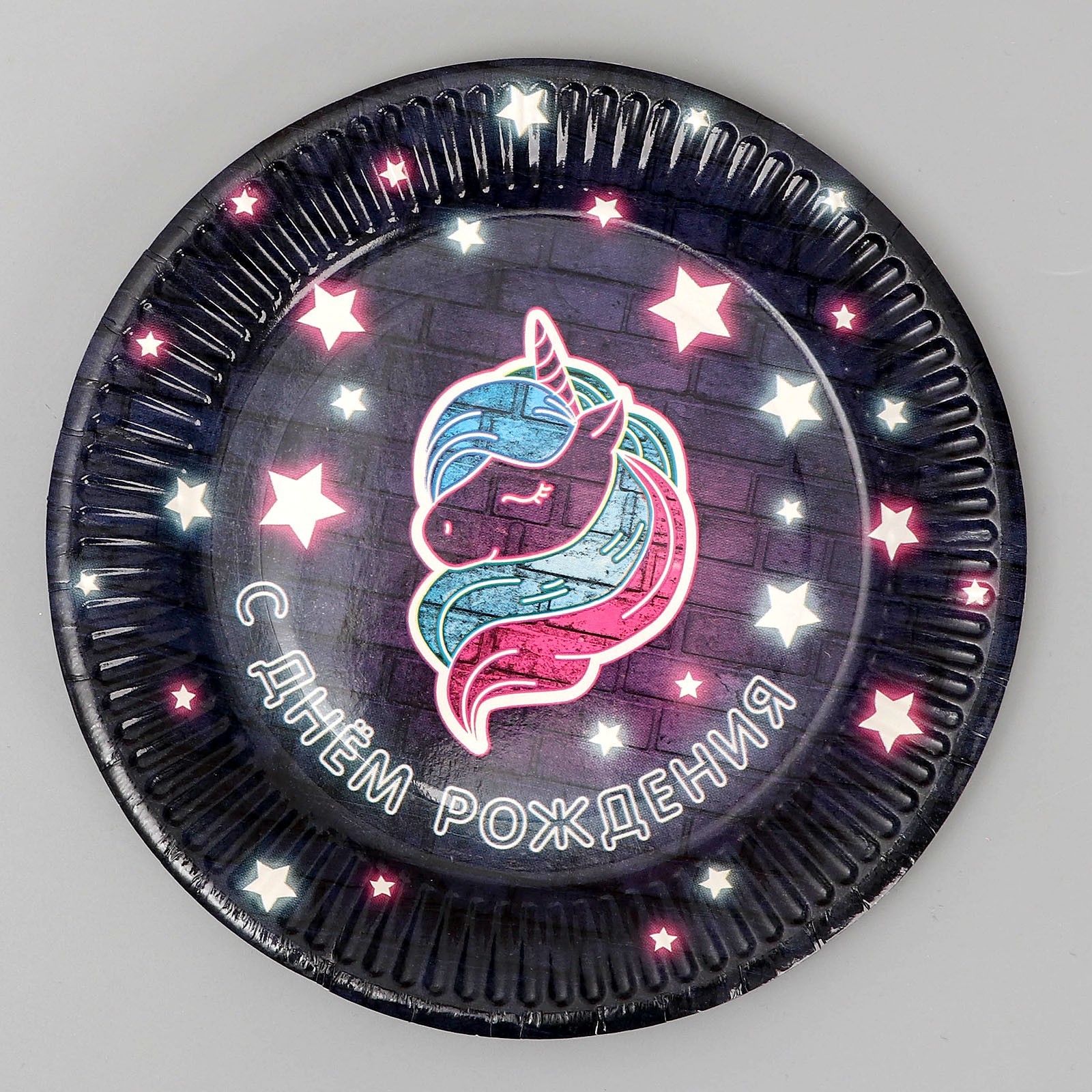 Тарелка одноразовая бумажная "с днём рождения" празднечный единорог, 18 см