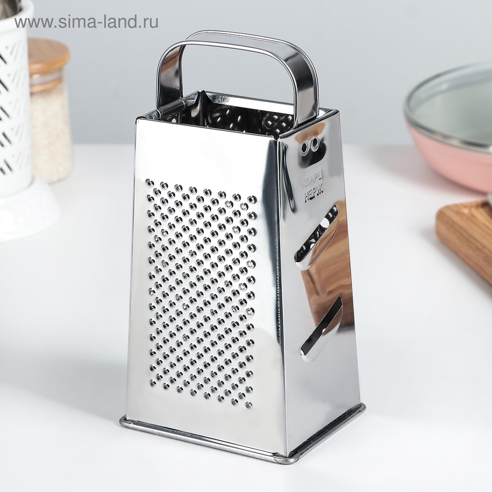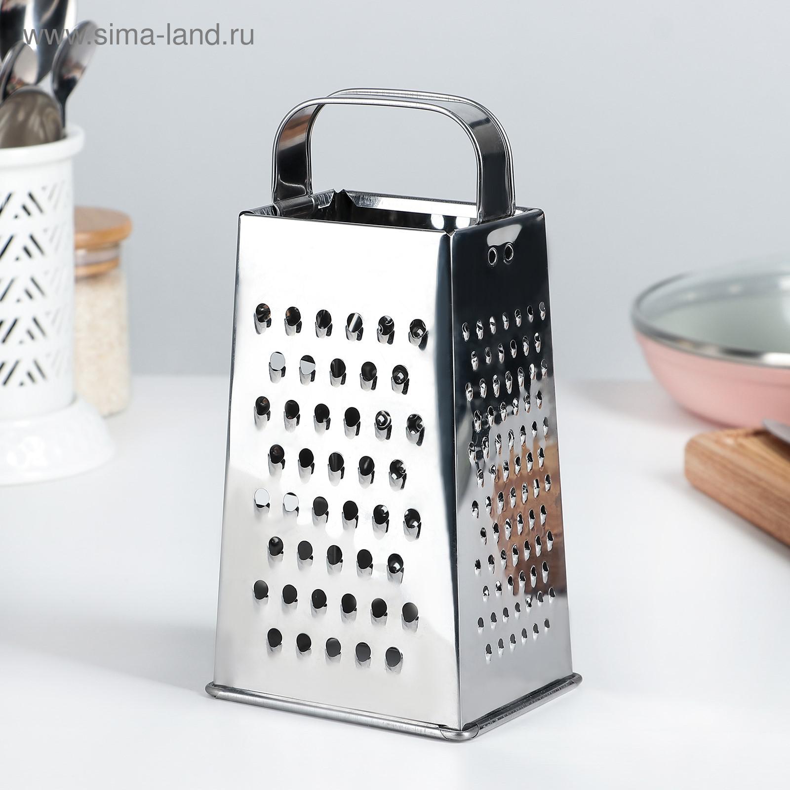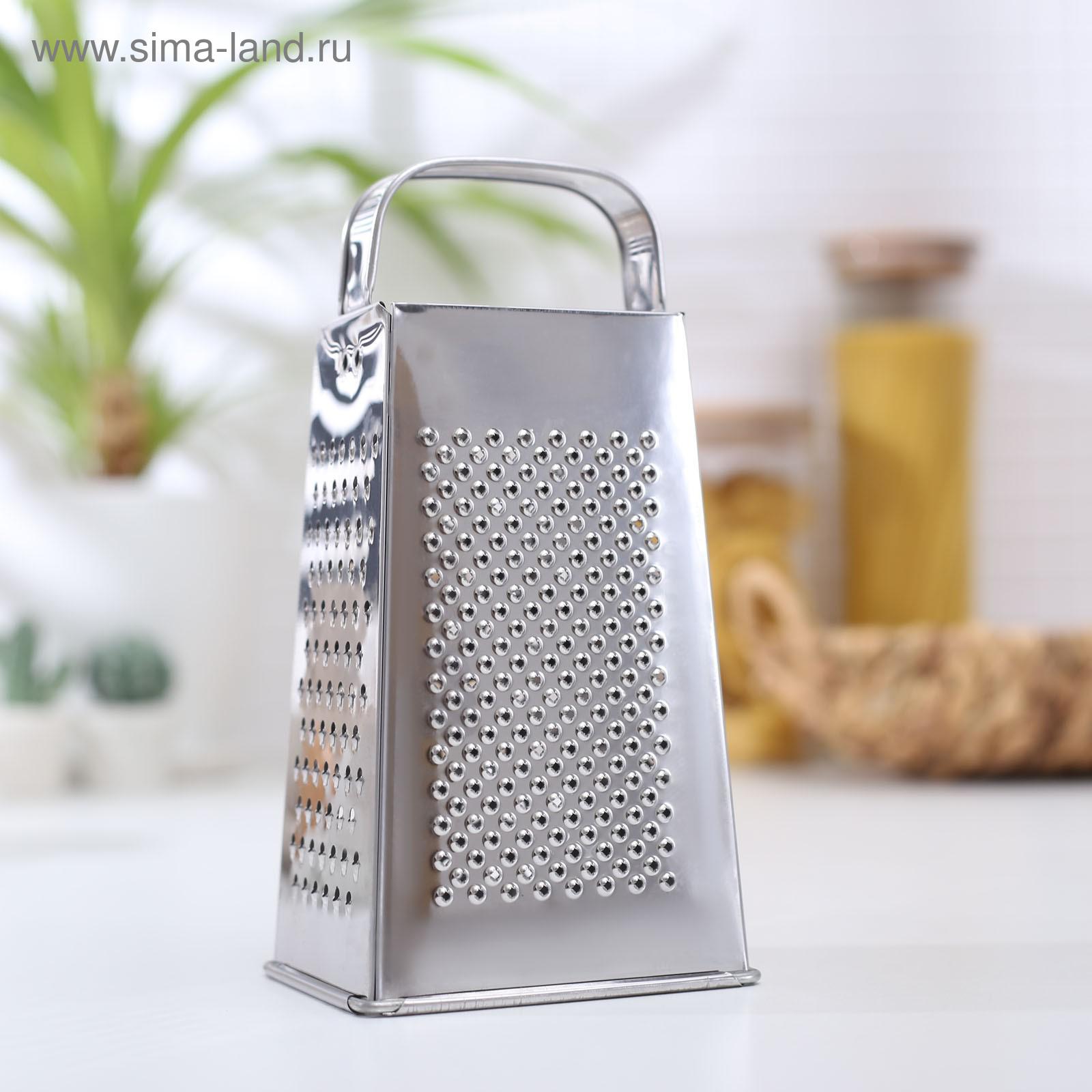 Тёрка «сталь», 4 грани, из нержавеющей стали, 9x12x21 см. Тёрка — необходимый кухонный помощник в каждом доме! Это многофункциональный и долговечный инструмент. Многие хозяйки даже не догадываются о том, сколько всего можно приготовить, если использовать все рабочие поверхности тёрки. Крупные отверстия предназначены для овощей, сыра, яиц, шоколада и масла. Мелкие отверстия предназначены для украшения стружкой или для измельченной нарезки. С колючей стороной тёрки нужно быть осторожным, чтобы не нанести травму. Она предназначения для измельчения чеснока, острого перца, орехов, сухарей, имбиря. А также поможет снять цедру с цитрусовых. Продолговатые отверстия предназначены для нарезки овощных и фруктовых слайсов. С помощью неё можно приготовить рататуй, домашние картофельные чипсы, луковые кольца, запеканку из кабачков и многое другое. parts count: 0 Число граней: 4 tnved: 8205510090 Материал: Металл Контейнер: Нет Температурное ограничение: Нет Противоскользящее основание: Нет  развернуть описание ▼