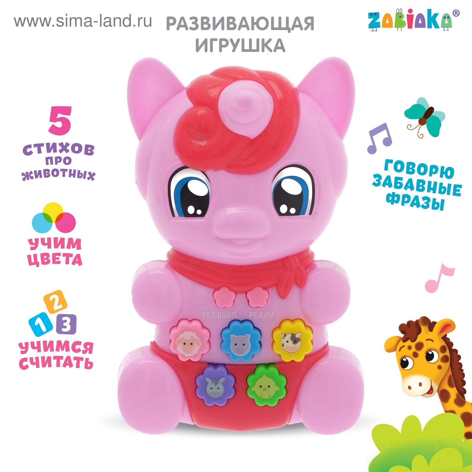 Игрушка музыкальная «пони миа» световые и звуковые эффекты, цвет красный. Интерактивная игрушка «Пони Мия» — это фиолетовый единорожка с музыкой и светом, который знакомит с цифрами, цветами и животными. Нажимайте на кнопки — слушайте стихи, забавные фразы и осваивайте счёт в игровой форме. Особенности 5 обучающих стихов — игрушка рассказывает весёлые стихи про курочку, свинку, овечку, уточку и кошку.Каждая кнопка соответствует определённому цвету. Нажимайте, запоминайте оттенки и осваивайте счёт — игра превращается в урок.Работает от 3 батареек AAA (в комплект не входят).Материалы прочные, без резкого запаха. Игрушка подходит для детей от 3 лет.Интерактивная игрушка «Пони Мия» — многофункциональный тренажёр для развития. Малышка тренирует память, логику и музыкальный слух, нажимая на кнопки. Яркий дизайн и дружелюбная мордочка делают игрушку желанным подарком. Подарите девочке радость обучения через игру! Для кого:Для девочки|Возраст:От 1 года|Количество батареек:3|Материал:Резина|Материал:Пластик|Дополнительные функции:Звуковые эффекты|Типоразмер батареек:AAA (LR03)|Тема обучения:Музыка|Тема обучения:Цифры, счёт, математика|Тема обучения:Развитие логики/мышления|Тема обучения:Цвета, формы, звуки|Батарейки в комплекте:Нет|Страна:Китай  развернуть описание ▼