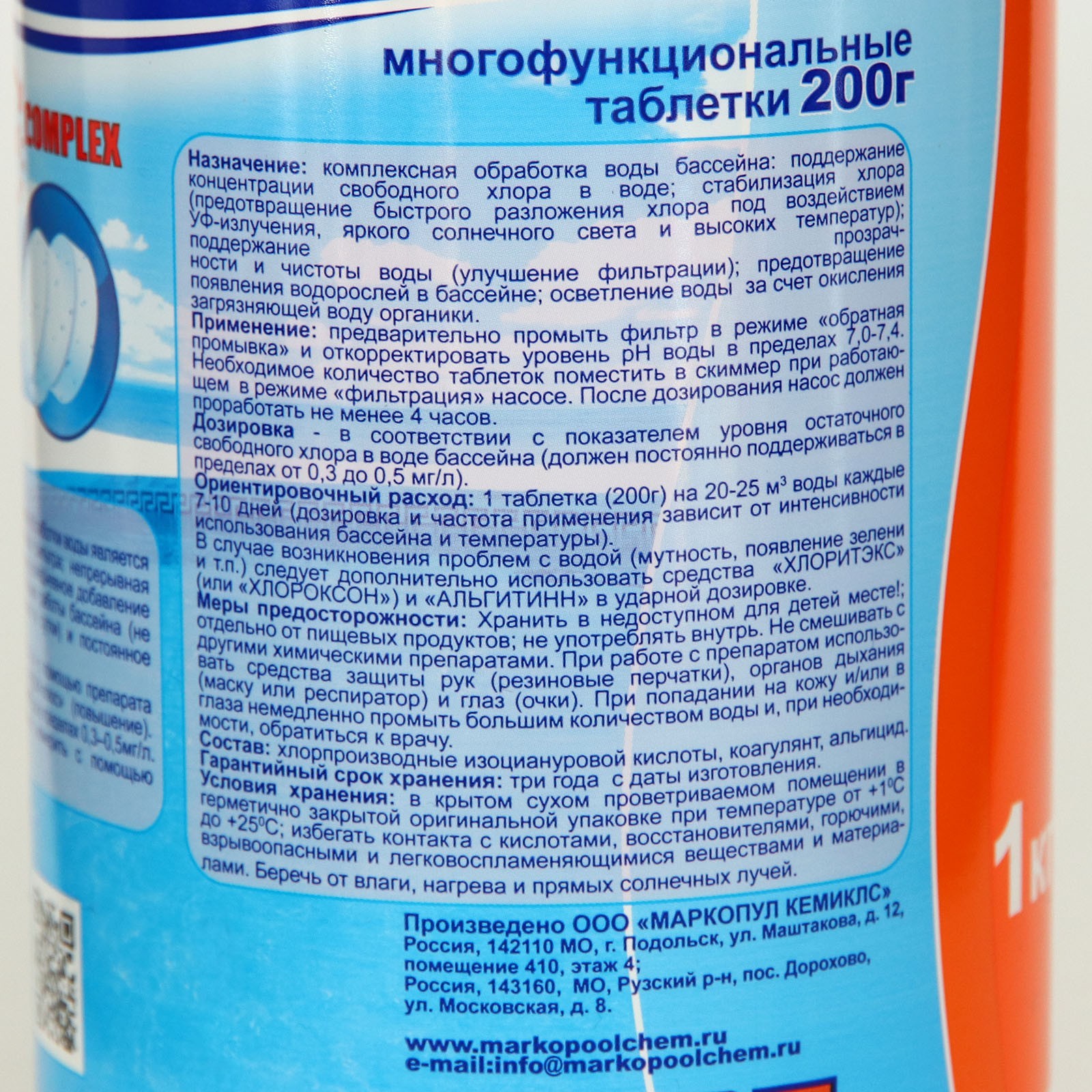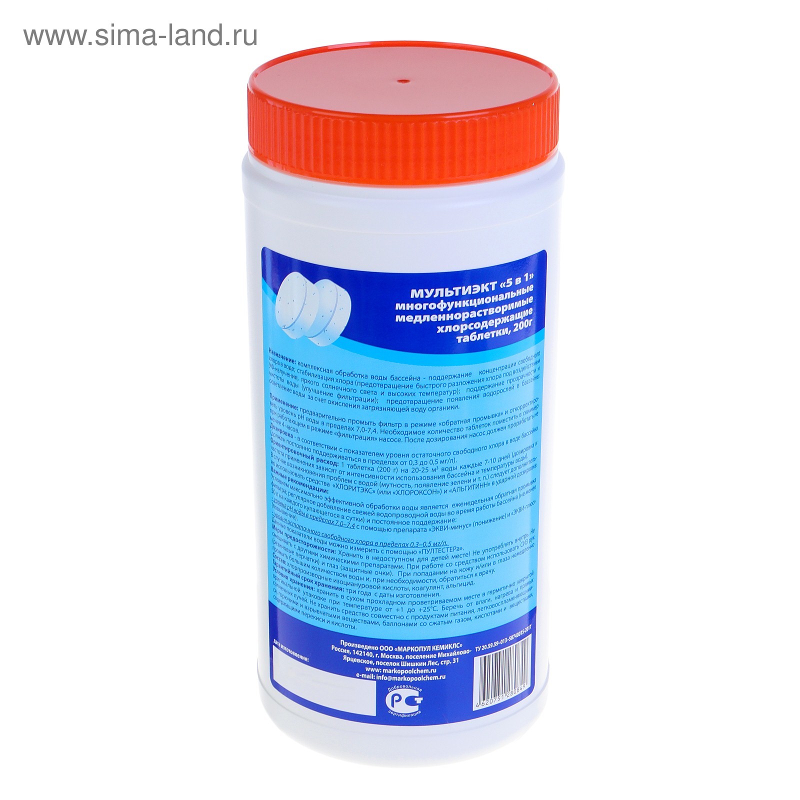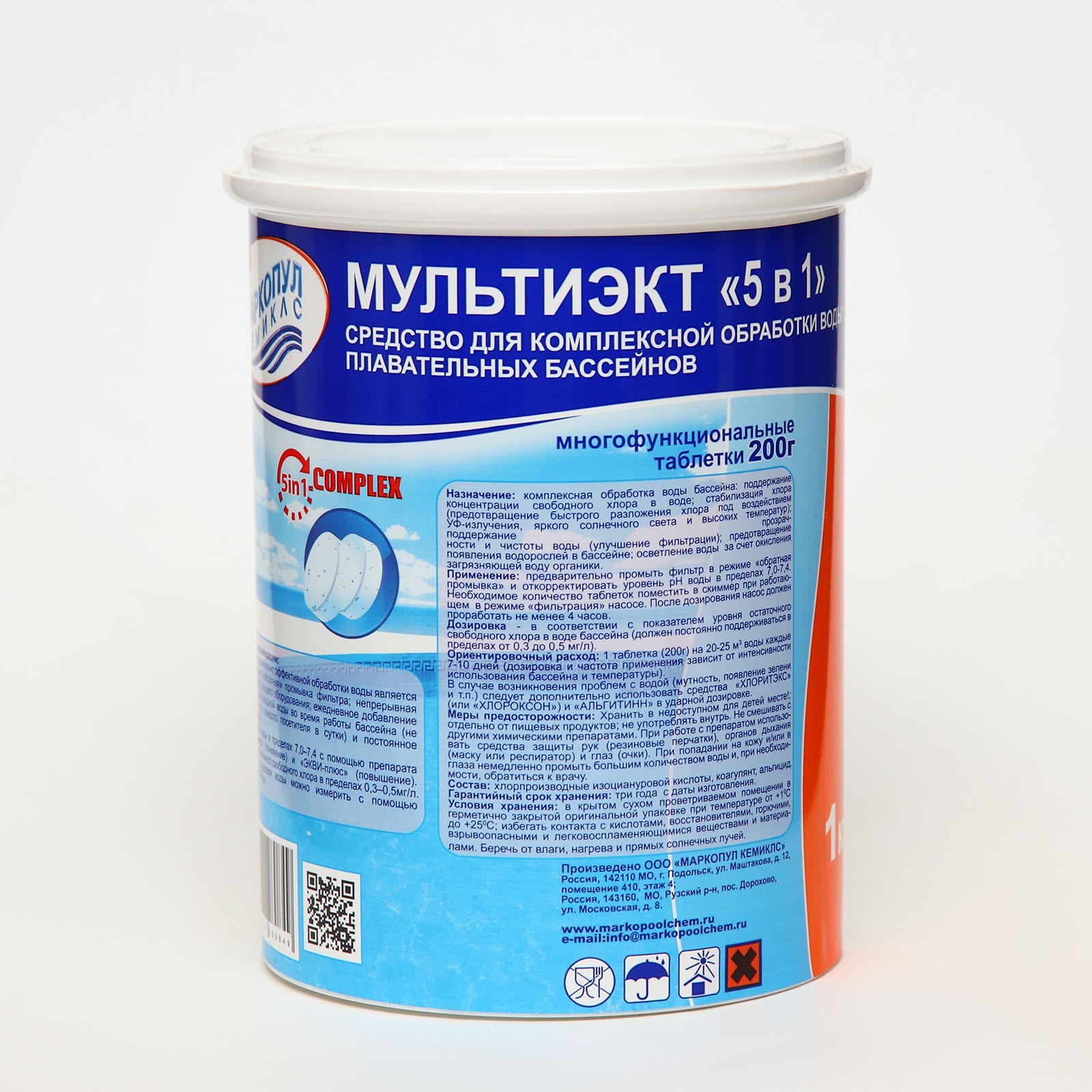 Дезинфицирующее средство "мультиэкт 5 в 1", для воды в бассейне, комплексный препарат, таблетки 200 г, 1 кг. Назначение: комплексная обработка воды бассейна - поддержание концентрации свободного хлора в воде; стабилизация хлора (предотвращение быстрого разложение хлора под воздействием УФ-излучения, яркого солнечного света и высоких температур); поддержание прозрачности и чистоты воды (улучшение фильтрации); предотвращение появления водорослей в бассейне; осветление воды за счет окисления загрязняющей воду органики. Применение: предварительно промыть фильтр в режиме «обратная промывка» и откорректировать уровень рН воды в пределах 7, 0-7, 4. Необходимое количество таблеток поместить в скиммер при работающем в режиме «фильтрация» насосе. После дозирования насос должен проработать не менее 4 часов. Дозировка - в соответствии с показателем уровня остаточного свободного хлора в воде бассейна (должен постоянно поддерживаться в пределах от 0, 3 до 0, 5 мг/л). Ориентировочный расход: 1 таблетка (200г) на 20-25 м3 воды каждые 7-10 дней (дозировка и частота применения зависит от интенсивности использования бассейна и температуры воды). Меры предосторожности: Хранить в недоступном для детей месте! Не употреблять внутрь. Не смешивать с другими химическими препаратами. При работе со средством использовать СИЗ рук (резиновые перчатки) и глаз (защитные очки). При попадании на кожу и/или в глаза немедленно промыть большим количеством воды и, при необходимости, обратиться к врачу. Состав: хлорпроизводные изоциануровой кислоты, коагулянт, альгицид. Гарантийный срок хранения: три года с даты изготовления. Условия хранения: хранить в сухом прохладном проветриваемом месте в герметично закрытой оригинальной упаковке при температуре от +1 до +25 С. Беречь от влаги, нагрева и прямых солнечных лучей. Не хранить средство совместно с продуктами питания, легковоспламеняющимися, горючими и взрывчатыми веществами, баллонами со сжатым газом, кислотами и веществами, содержащими перекиси и кислоты. Вес, кг/Объём, л: 1 Вид средства: Комплекс Форма выпуска: Таблетки Назначение: Бытовые Температурное ограничение: Нет Вид: Хлоросодержащиее  развернуть описание ▼