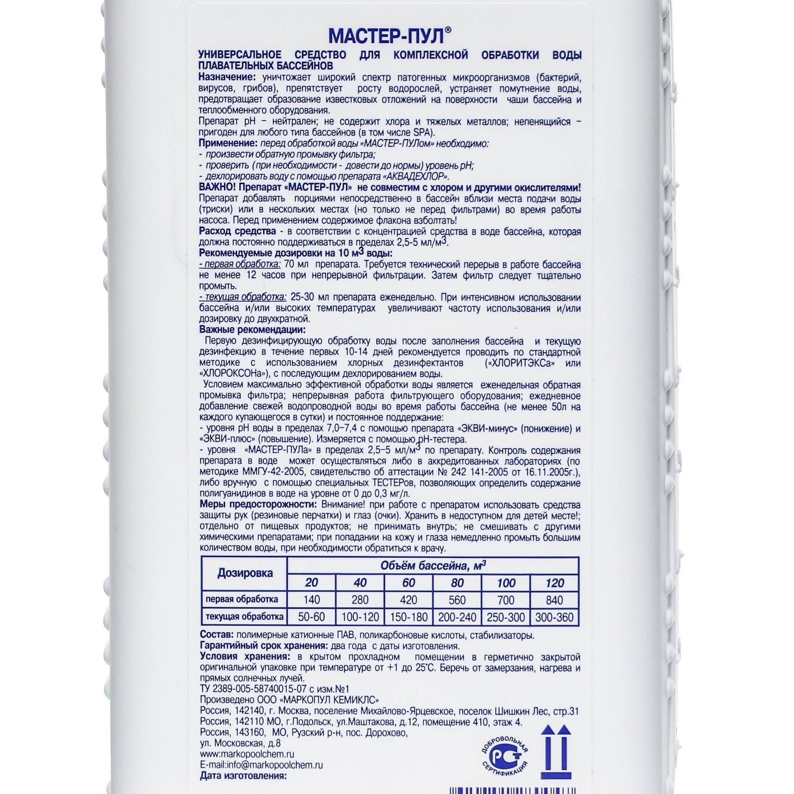 Средство для очистки воды в бассейне "мастер-пул", универсальное, 1 л. Универсальное жидкое средство для комплексной обработки воды плавательных бассейнов. Дезинфекция воды: использование препарата позволяет быстро и эффективно уничтожать широкий спектр микроорганизмов. Препарат содержит вещества, предотвращающие рост водорослей в воде бассейна на длительное время. Осветление (коагуляция) воды: в состав препарата входят вещества, позволяющие устранить помутнение воды бассейна, при этом эффективность осветления практически не зависит от уровня рН. «Стабилизация» жёсткости: использование препарата в процессе эксплуатации бассейна способствует предотвращению образования «известковых» отложений на поверхности чаши бассейна и теплообменного оборудования. Препарат рН – нейтрален, не содержит хлора и тяжелых металлов, непенящийся – пригоден для любого типа бассейнов (в том числе SPA). Состав: полимерные катионные ПАВ, поликарбоновые кислоты, стабилизаторы. Форма выпуска: бутыль 1 литр. Вес, кг/Объём, л: 1 Вид средства: Флокулянт Форма выпуска: Жидкость Температурное ограничение: Нет  развернуть описание ▼