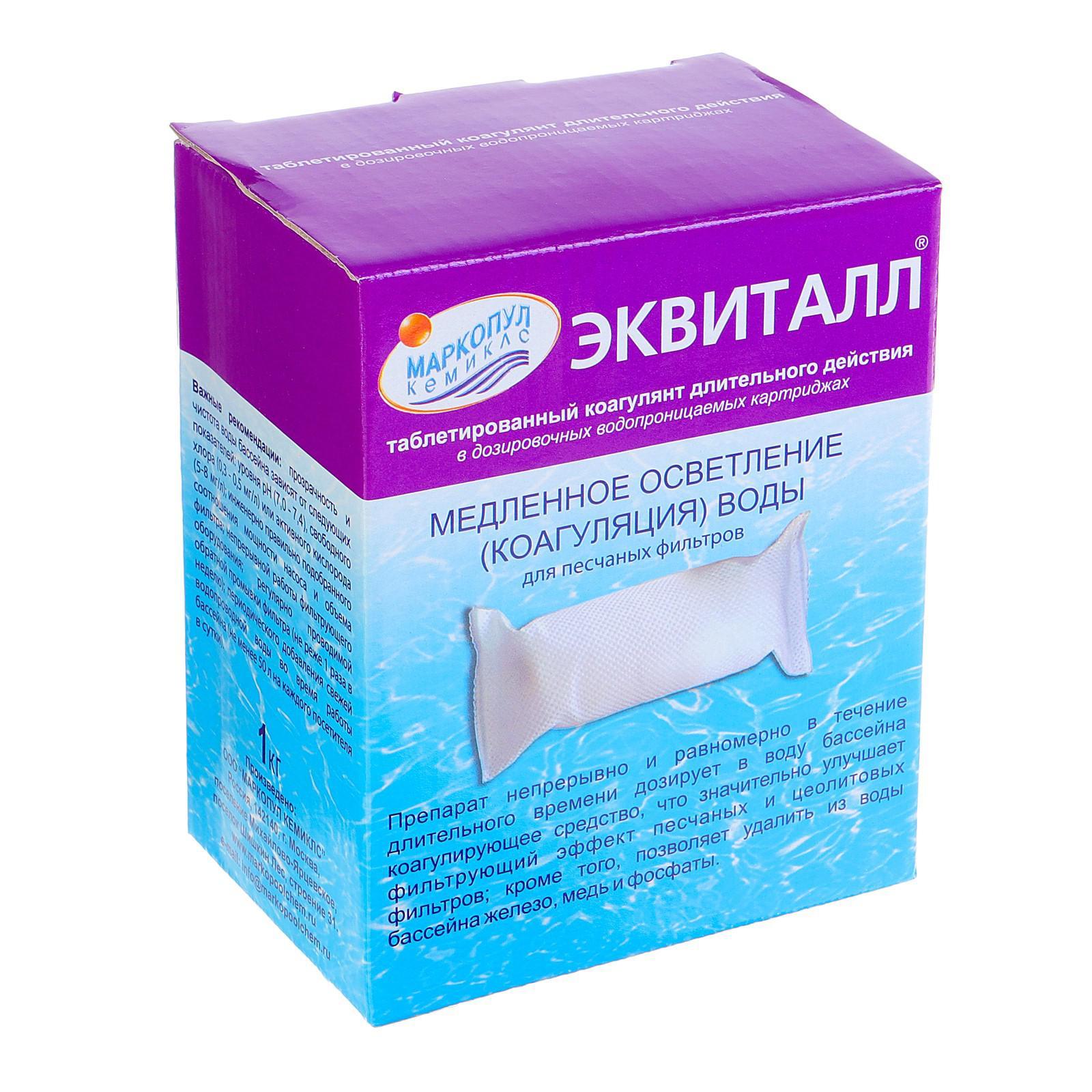 Коагулянт осветлитель воды "эквиталл", таблетки, 1 кг. Благодаря медленно растворимой форме препарат непрерывно и равномерно в течение длительного времени дозирует в воду бассейна коагулирующее средство, что значительно улучшает фильтрационный эффект песочных и цеолитовых фильтров. Преимущество такого препарата в отличие от коагулянтов, которые добавляются периодически, заключается в том, что это средство работает постоянно, благодаря медленной растворимости в процессе циркуляции воды непрерывно отфильтровываются мелкие частицы. Кроме того, ЭКВИТАЛЛ длительного действия позволяет удалять из воды железо, медь, фосфаты. Оптимальное действие препарата при значении рН 7, 2-7, 6. Перед проведением коагуляции необходимо проверить и при необходимости довести до нормы значения рН и свободного хлора (0, 3-0, 5 мг/л). После тщательной обратной промывки фильтра необходимое количество картриджей поместить в префильтр или скиммер, затем включить фильтр в режим фильтрации. После полного растворения таблеток картриджи утилизируются. Состав: Круглые таблетки в водопроницаемых картриджах. Содержит сульфат алюминия. Меры предосторожности: Беречь от детей. Не смешивать с другой химией для бассейна. При попадании на кожу и глаза немедленно промыть большим количеством воды, при необходимости обратиться к врачу. Вес, кг/Объём, л: 1 Вид средства: Коагулянт Форма выпуска: Таблетки Температурное ограничение: Нет  развернуть описание ▼
