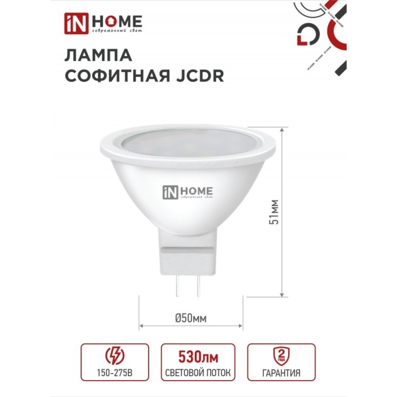 Лампа светодиодная in home, mr16, gu5.3, 6 вт, 525 лм, 4000 к, дневной белый. Встраиваемые светильники монтируются в натяжные или подвесные потолки. Используются в качестве основного освещения в домах, офисах и магазинах или акцентного — для выделения ниш, витрин, архитектурных объектов. Подойдёт любой тип ламп с аналогичным цоколем. Цвет свечения: Белый Вид лампы: Светодиодная Цоколь: GU5.3 (G5.3) Мощность, Вт: 6 parts count: 0 Напряжение, В: 220 Световой поток, лм: 525 Цветовая температура: 4000К Форма лампы: Софитная Температурное ограничение: Нет Индекс цветопередачи: RA > 80 Диммируемая: Нет Класс энергоэффективности: A+  развернуть описание ▼