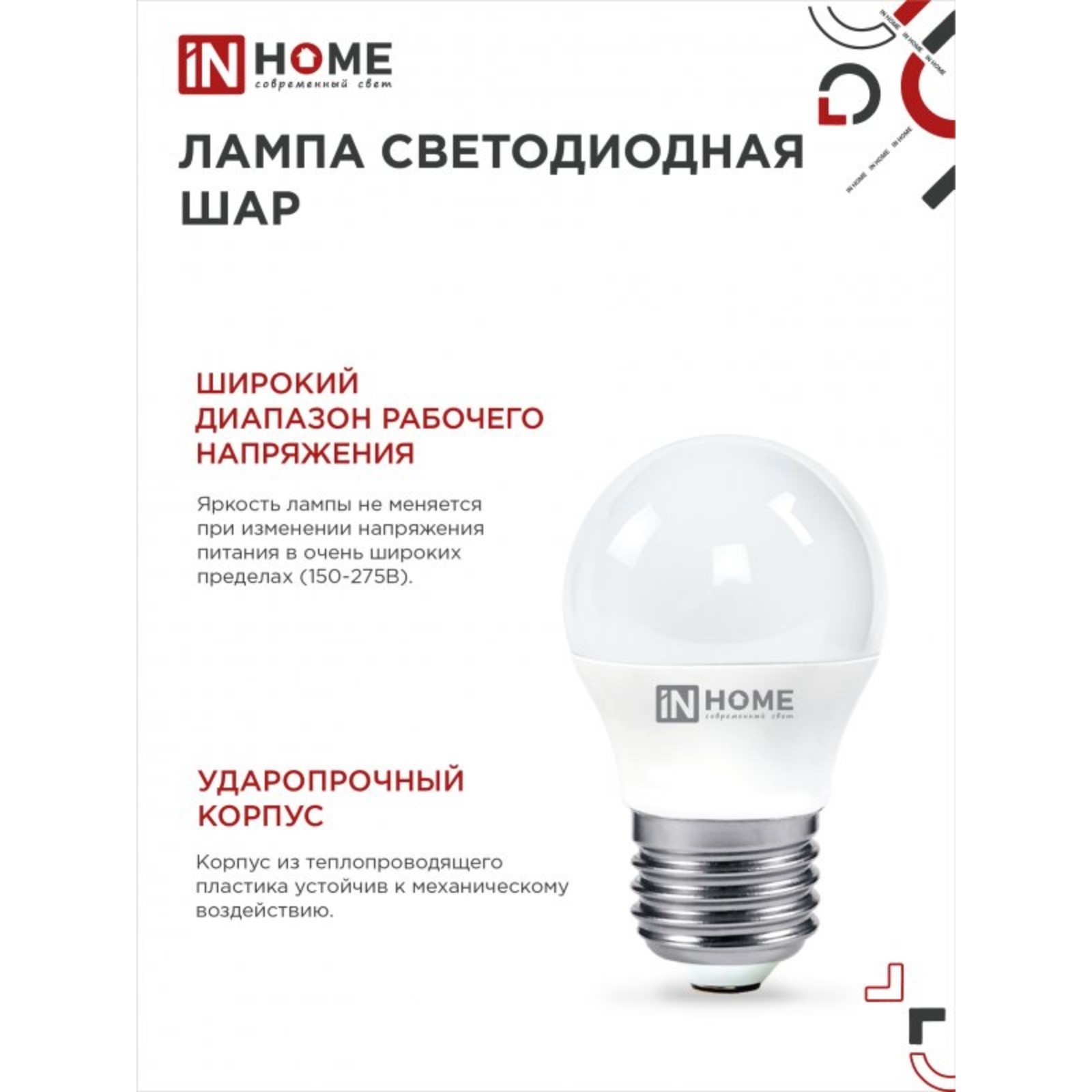 Лампа светодиодная in home led-шар-vc, е27, 6 вт, 230 в, 4000 к, 540 лм. Главное преимущество лампы, созданных по технологии «VISION CARE», – безопасность для здоровья человека. В отличие от других ламп, LED-ШАР-VC не мерцает и не пульсирует, а значит не вызывает усталости глаз и не приводит к снижению зрения. Кроме того, по сравнению с лампой накаливания, ее использование позволяет сэкономить до 90% затрат на электроэнергию. Светодиодная лампа-шар мало потребляет, светит ярко и равномерно, практически не нагревается и прослужит не менее 30 000 часов. Лампа создает естественный дневной свет нейтрального спектра — 4000К. Цвет свечения: Белый Вид лампы: Светодиодная Цоколь: E27 Мощность, Вт: 6 Напряжение, В: 220 Световой поток, лм: 480 Цветовая температура: 4000К Форма лампы: Шар Температурное ограничение: Нет Индекс цветопередачи: RA > 80 Диммируемая: Нет Класс энергоэффективности: A+  развернуть описание ▼