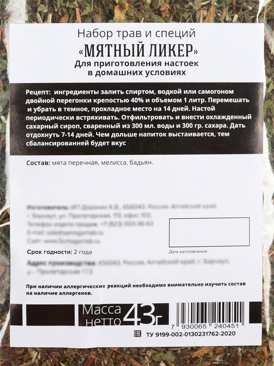 Подарочный набор для приготовления настойки «мятный ликер»: набор трав и специй 43 г, бутылка 500 мл., инструкция.