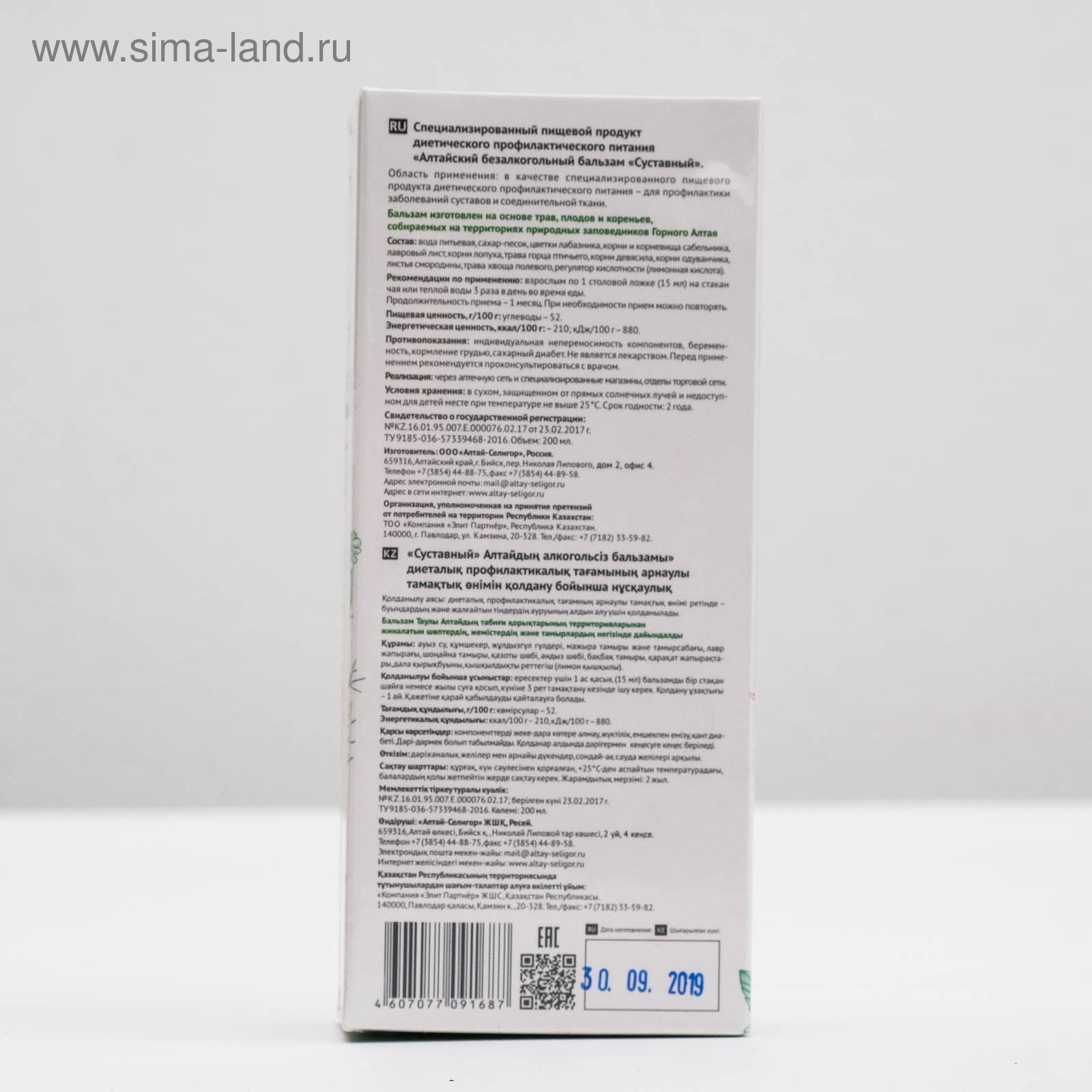 Бальзам altay seligor, суставный, 200 мл.. Алтайский бальзам на травах рекомендуется при воспалительных процессах в суставах и соединительной ткани. Средство мягко снимает воспаления и снижает болезненные ощущения в суставах. Не содержит алкоголя, можно применять каждый день. Лабазник, сабельник, лавровый лист — активные действующие травы в бальзаме. Они способствуют растворению и выводу солей из организма. При постоянном применении бальзама на травах укрепляется иммунитет, улучшается в целом состояние суставов и соединительной ткани в организме. Состав: сахар-песок, вода питьевая, цветки лабазника, корни сабельника, лавровый лист, корни лопуха, трава горца птичьего, корни девясила, корни одуванчика, листья смородины, трава хвоща полевого, регулятор кислотности (лимонная кислота). Рекомендации по применению: добавляйте по 1–2 чайной ложки на стакан воды, чая, сока, минеральной воды, молока, другого напитка или употребляйте в чистом виде 2–3 раза в день. Условия хранения: держите в сухом, защищённом от света месте при температуре не выше 25 °C. Срок годности: 24 месяца. Объём: 200 мл. Не является лекарством. Вес, г/Объём, мл: 200 Вид: Бальзам Назначение: От боли в суставах и мышцах : 0 Температурное ограничение: Нет Назначение: Для костей и суставов Для кого: Универсальный Форма выпуска: Бальзам Показания: Укрепление костей и суставов Показания: Боль в суставах (артралгия) Показания: Болезни суставов Компоненты: Лабазник Компоненты: Корневища сабельника Компоненты: Лавровый лист Действие: Общеукрепляющее  развернуть описание ▼