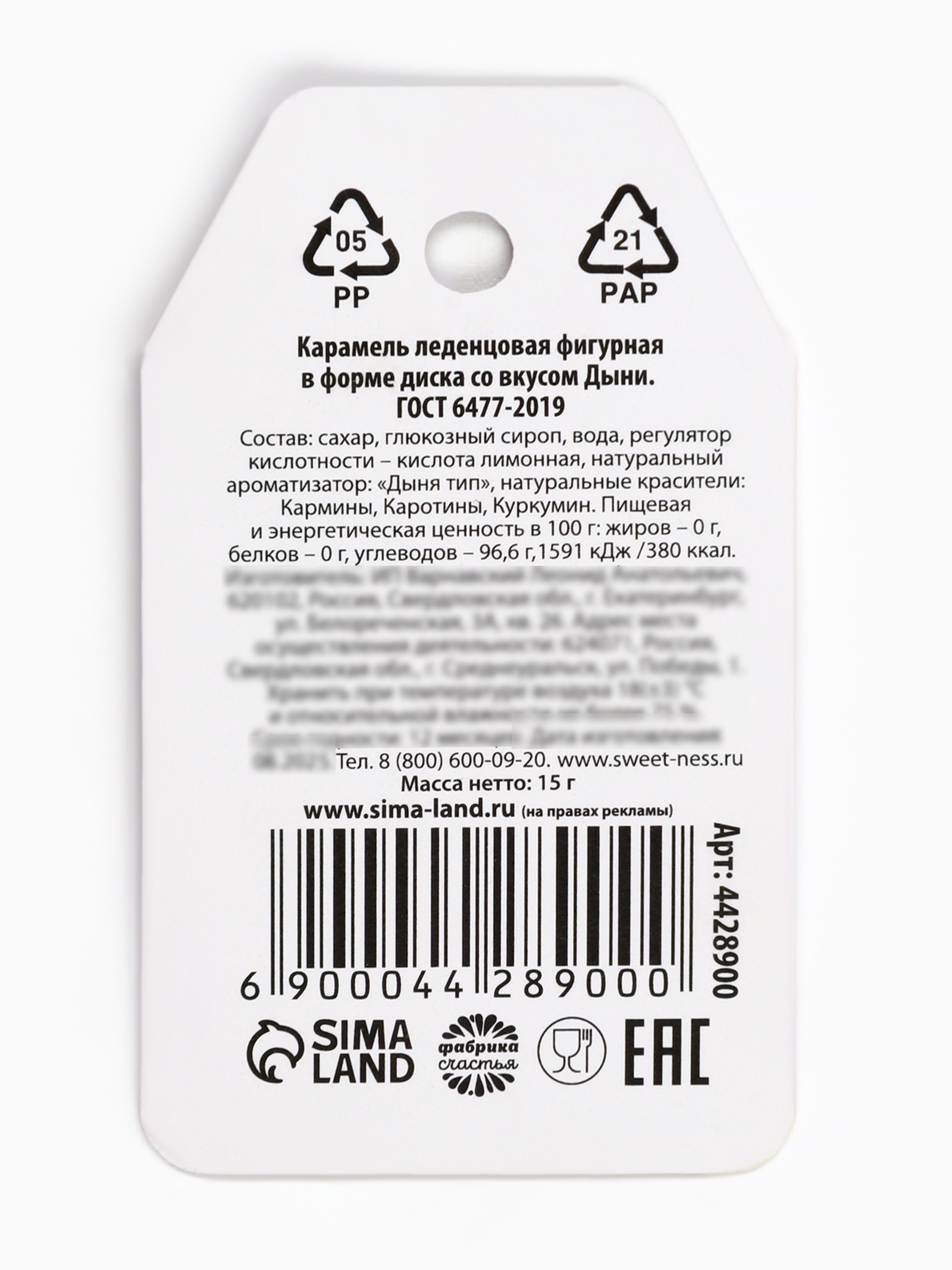 Состав: сахар, патока, вода, регулятор кислотности - лимонная кислота, натуральные красители: Куркумин, бета-апо-8-Каротиновый альдегид, Каротины, Кармины, натуральный ароматизатор: Дыня тип. Масса нетто: 15 г. Срок годности: 12 месяцев.
