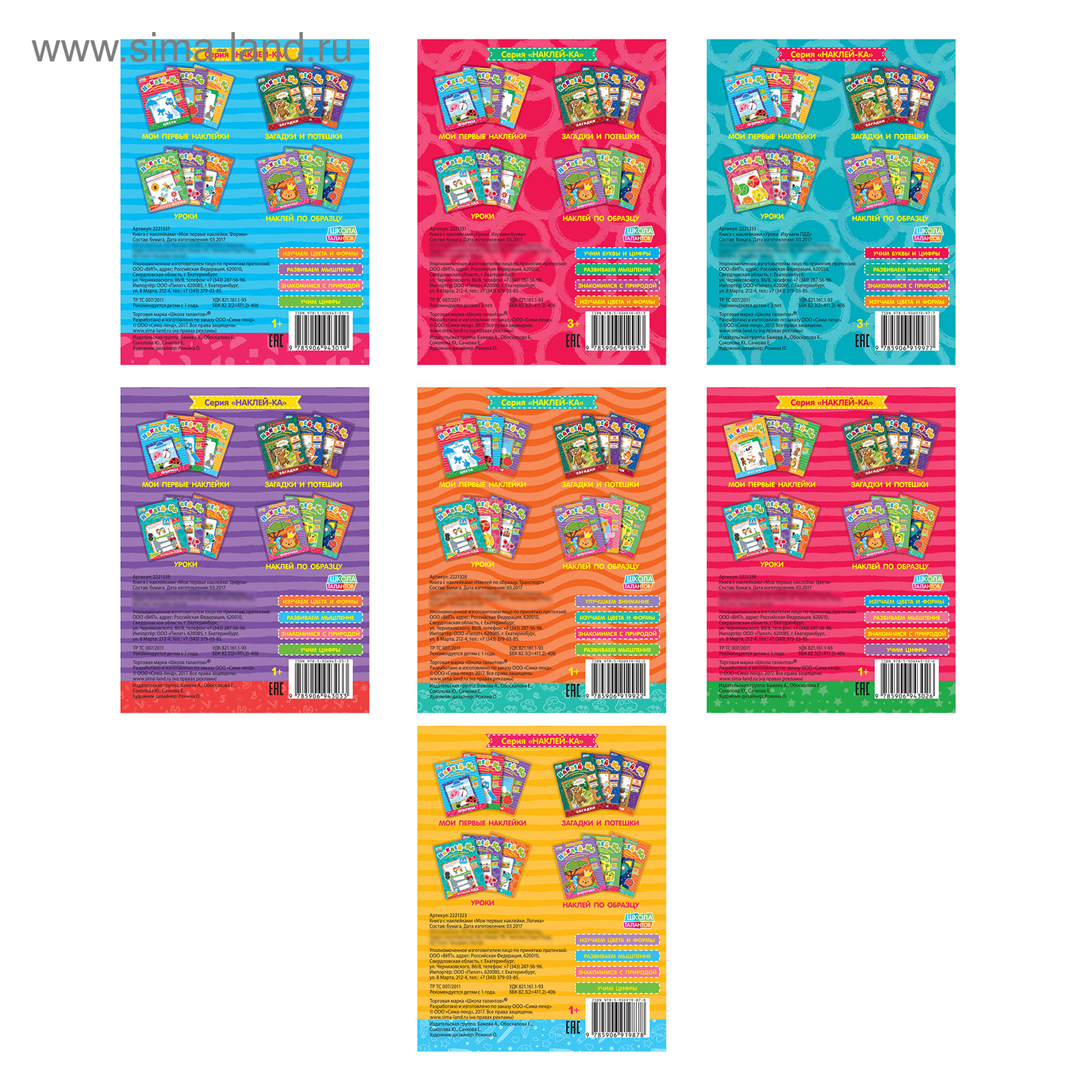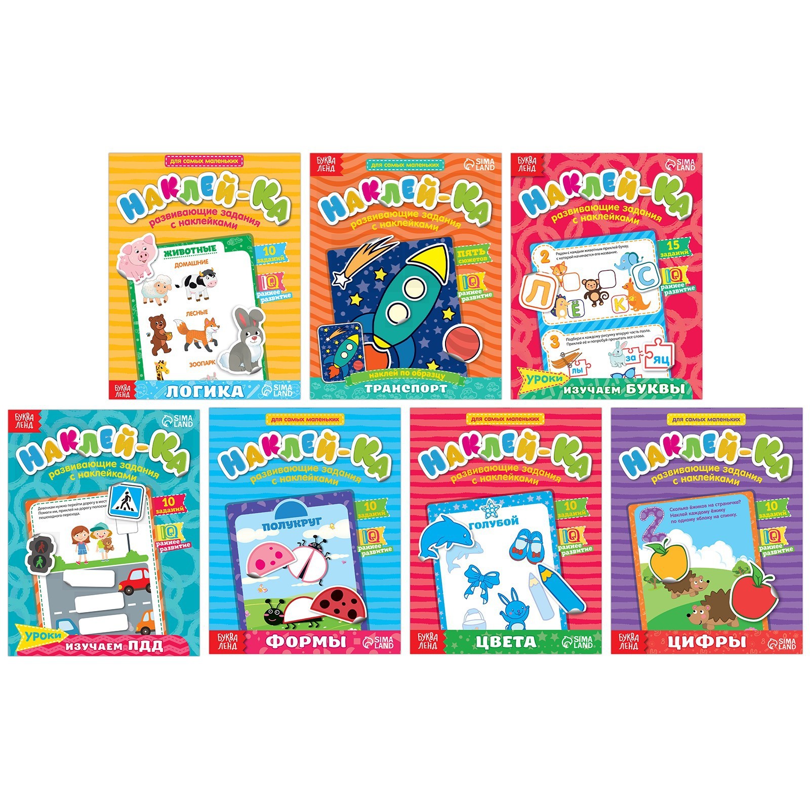 Наклейки «для самых маленьких», набор 7 шт. по 12 стр.. Набор обучающих книг с наклейками создан специально для любознательных малышей. Удобный формат В книгах вы найдёте увлекательные задания на логику, запоминание, внимание, знакомство с формами, цифрами, правилами дорожного движения и видами транспорта.Яркие наклейки выполнены на плотной бумаге, хорошо отклеиваются и не рвутся.С крупными стикерами удобно работать малышам, которые ещё только осваивают этот вид творчества.Чем полезны занятия с наклейками Такое творчество позволяет детям развивать мелкую моторику, пространственное и логическое мышление, а также тренировать усидчивость и аккуратность. Набор:Да|Для кого:Унисекс|Формат:А5-|Возраст:От 1 года|Количество страниц:12|Год издания:2017|Тематика:Транспорт|Тематика:Геометрия|Тематика:Надписи, цифры, буквы|Тематика:Животный мир|Тематика праздника:Универсальная тематика|Развитие навыков:Фигуры, цвета|Развитие навыков:Буквы, цифры|Развитие навыков:Логика|Вид наклейки:Альбом наклеек|Тип обложки:Мягкий переплёт|Автор:Сачкова Евгения Камилевна|Страна:Китай  развернуть описание ▼
