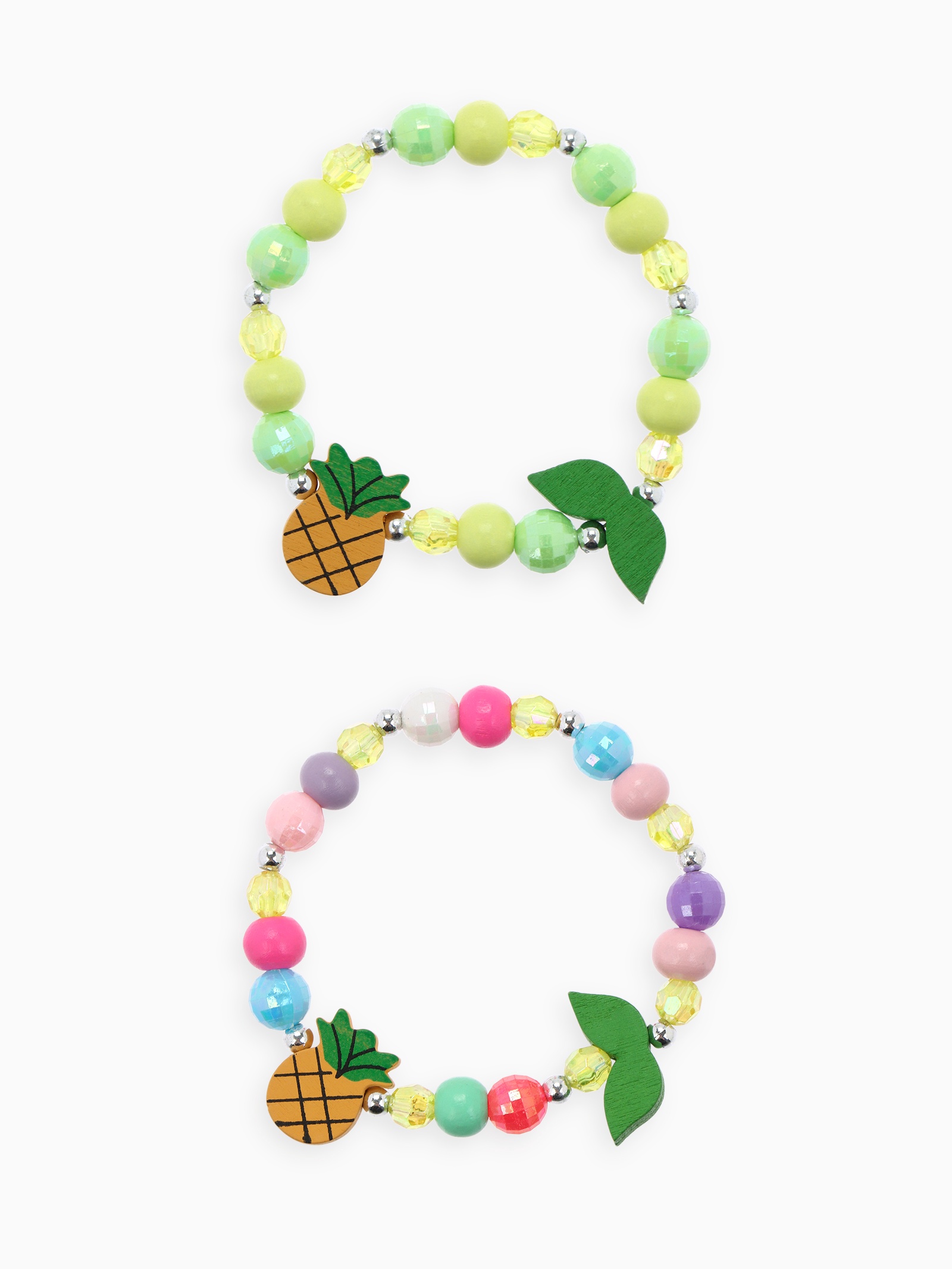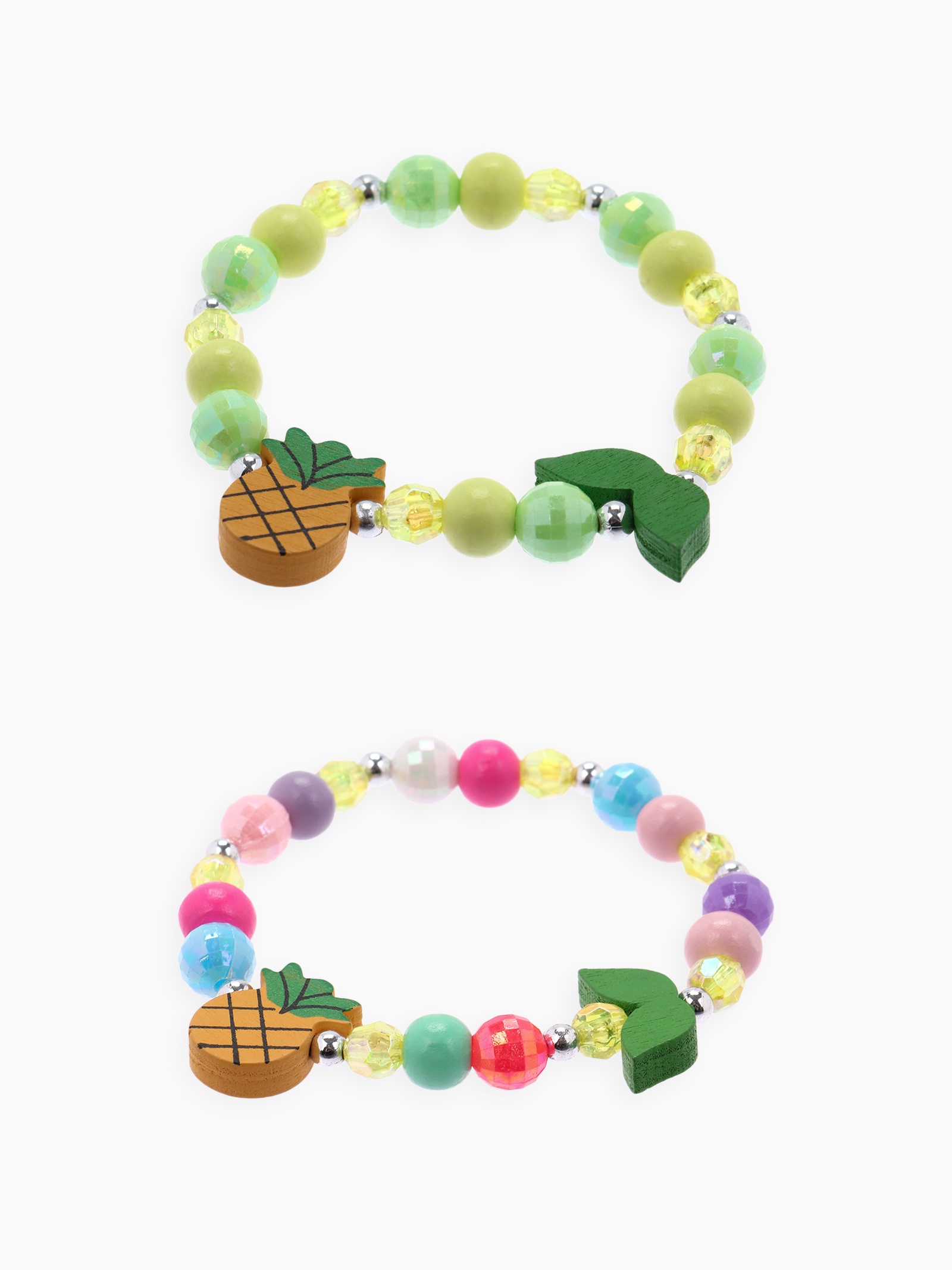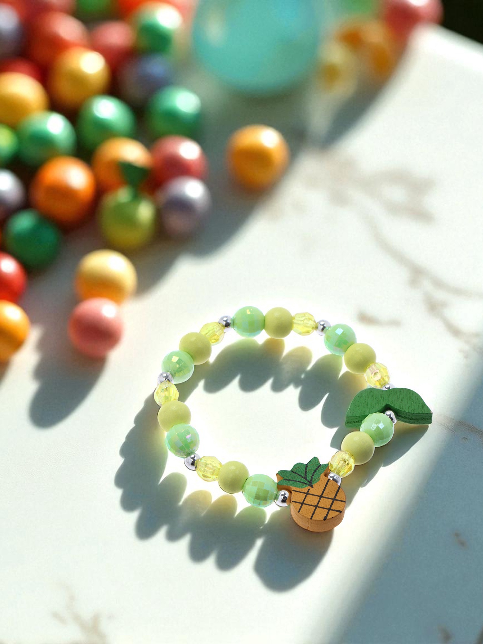 Многоцветный дизайн с декоративными элементами ананаса и листьев.Материалы — силикон, пластик и дерево для комфортного и безопасного использования.Отсутствие фурнитуры облегчает уход и снижает риск аллергии.Единая нить обеспечивает прочность и гибкость браслета.Диаметр 5 см оптимален для детского запястья.Подходит для различных поводов и стилей одежды.Стиль и комфорт