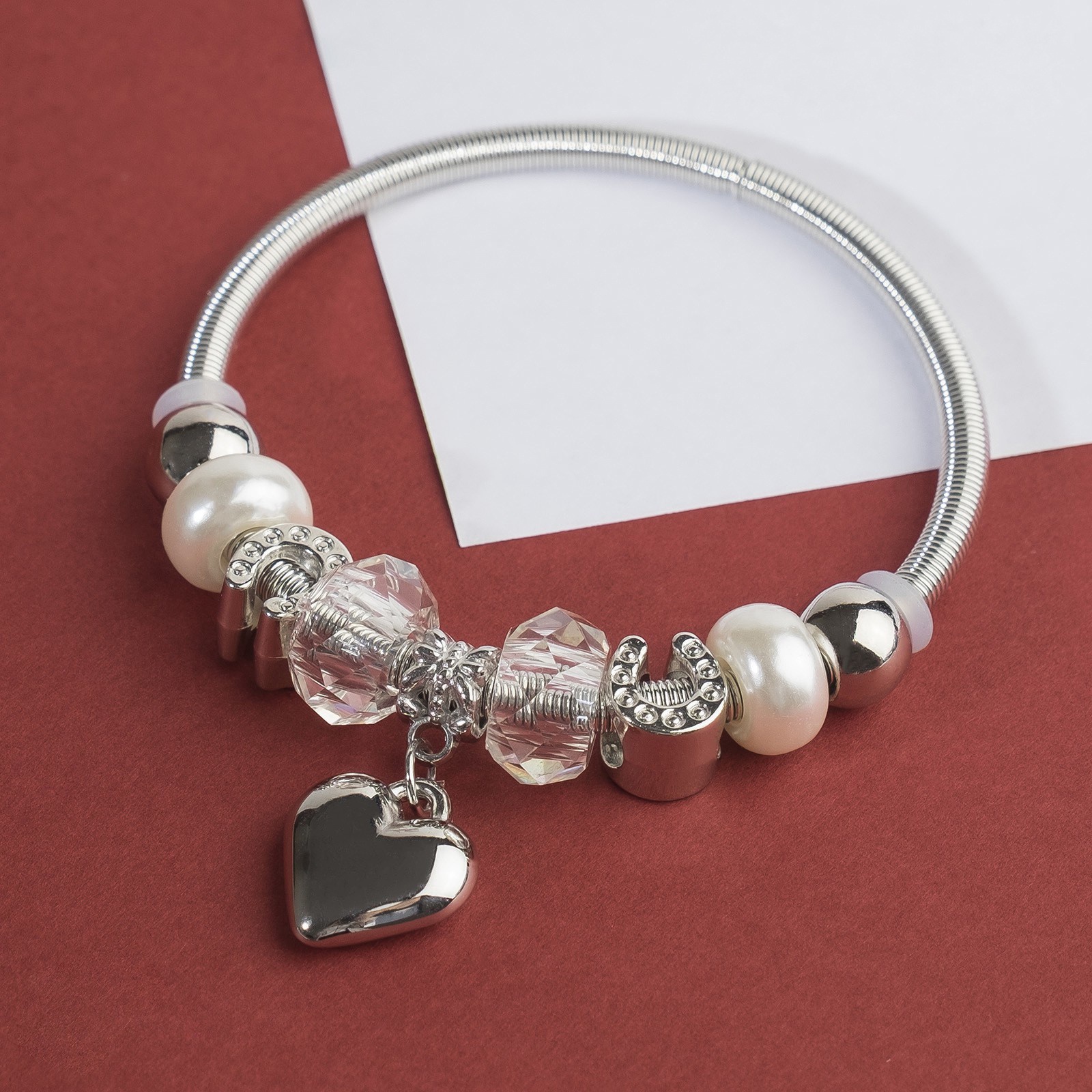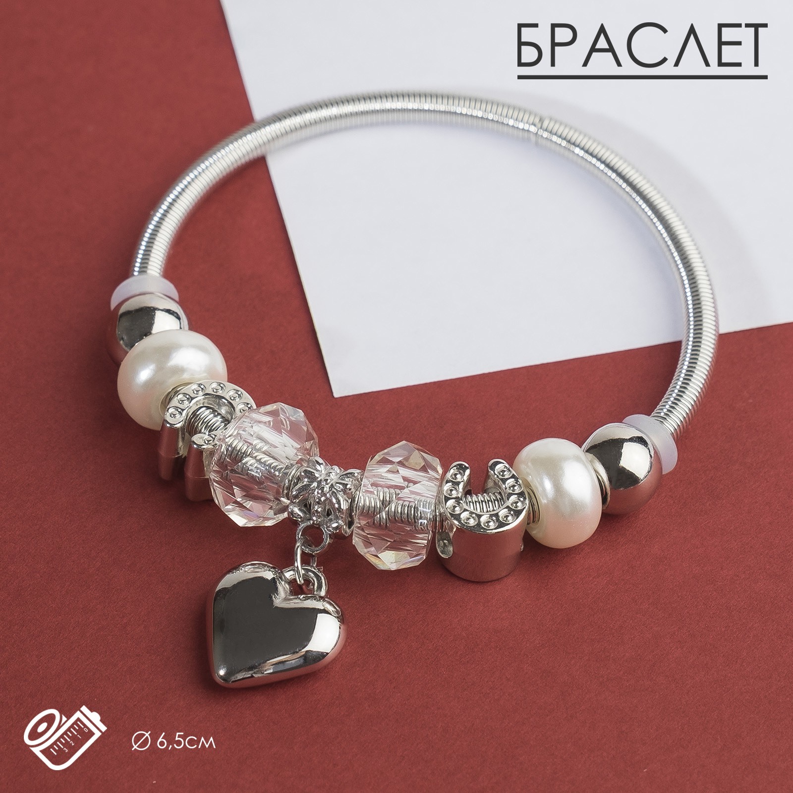 Браслет с шармами «марджери» сердце, жемчуг, белый в серебре, D=6.5 см