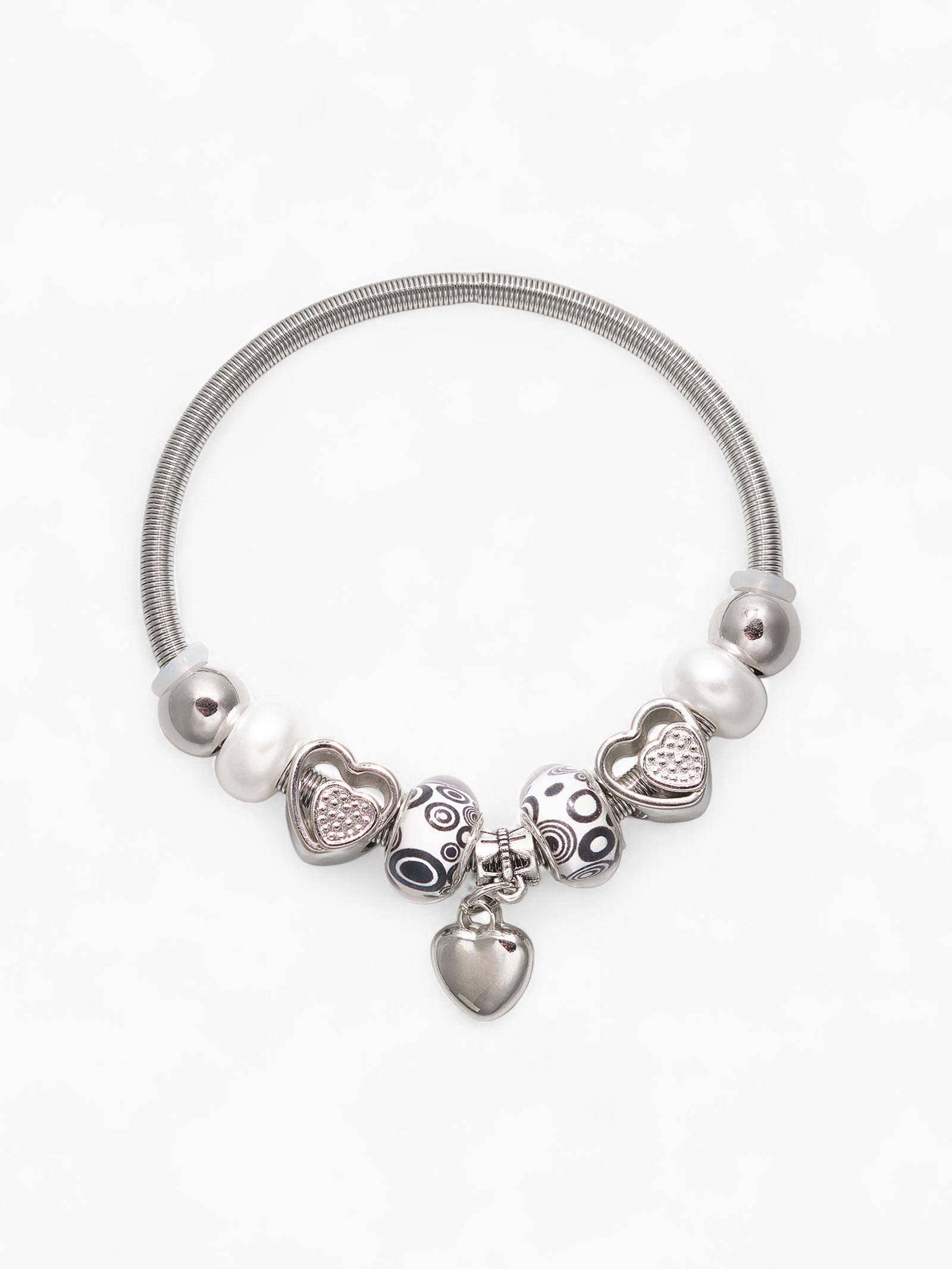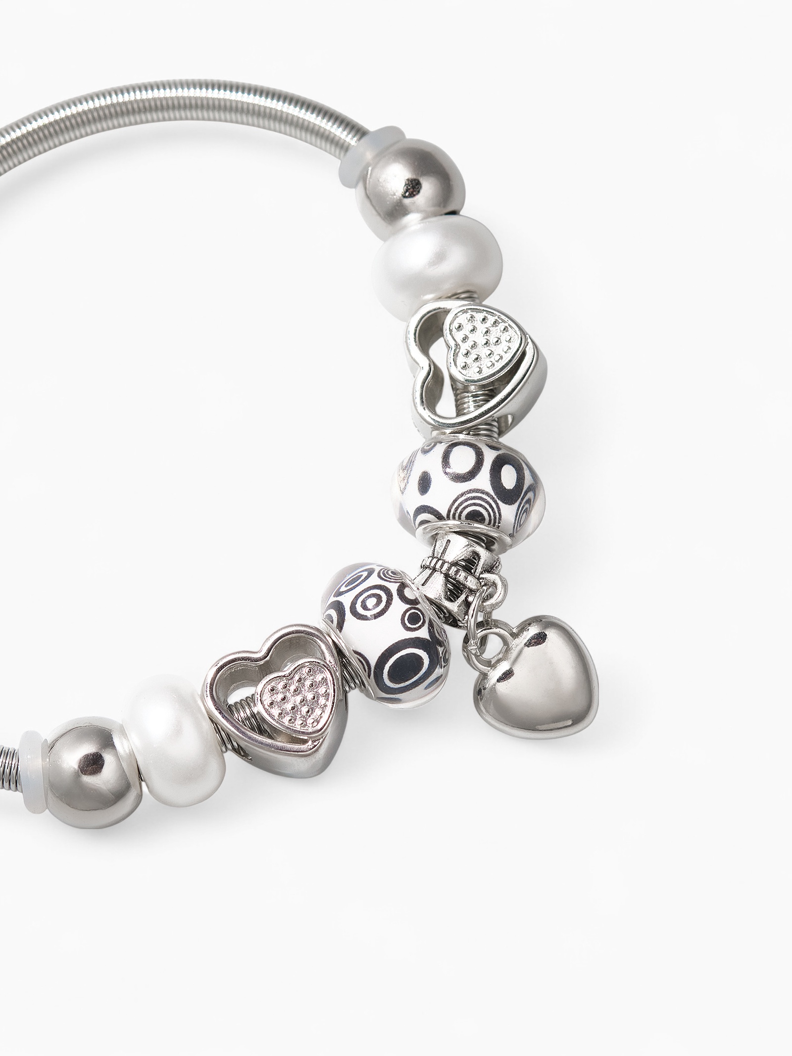 Браслет с шармами «марджери» сердце, жемчуг, чёрно-белый в серебре, D=6.5 см