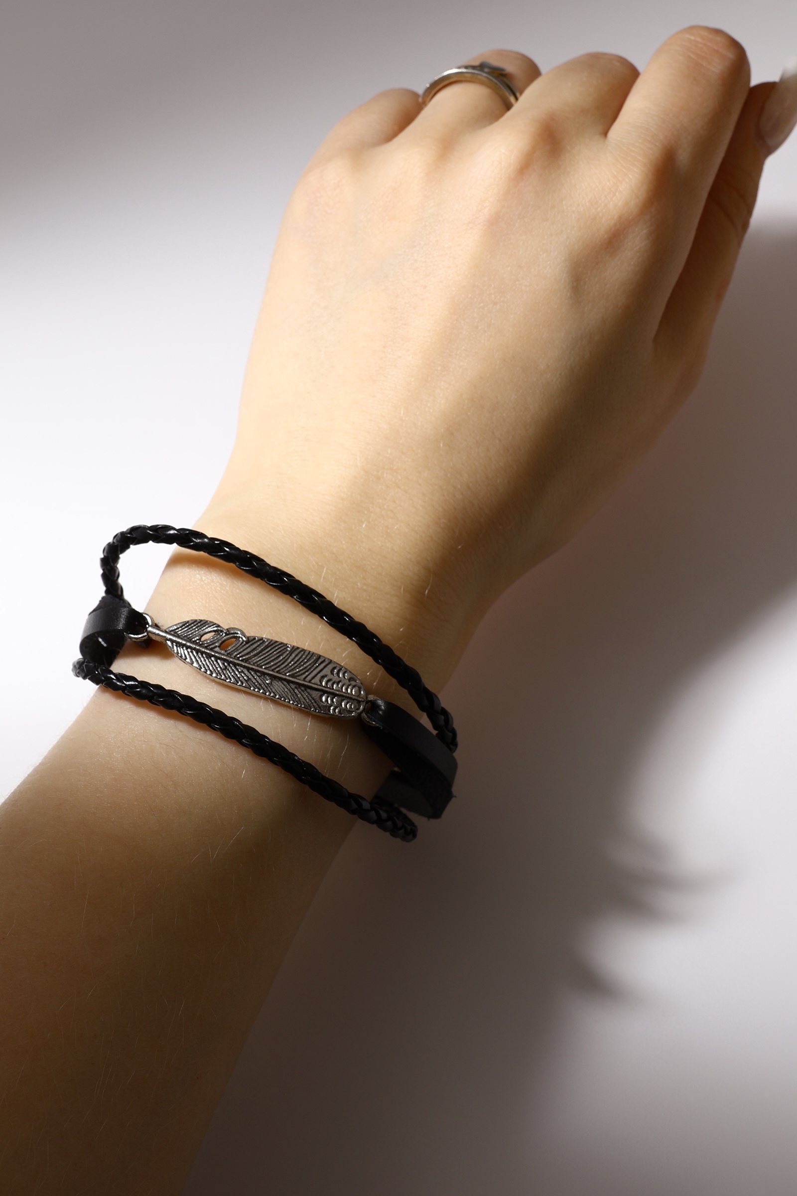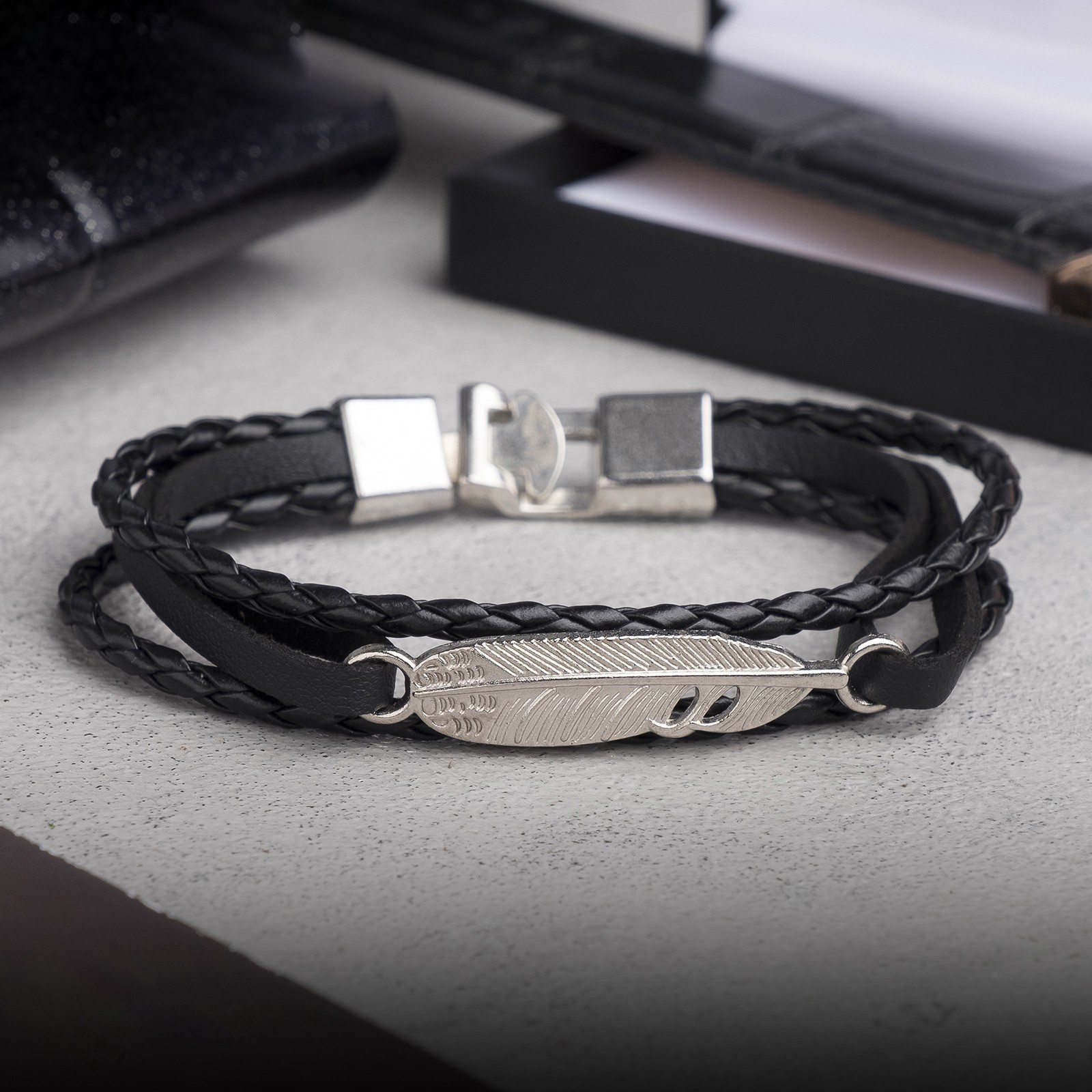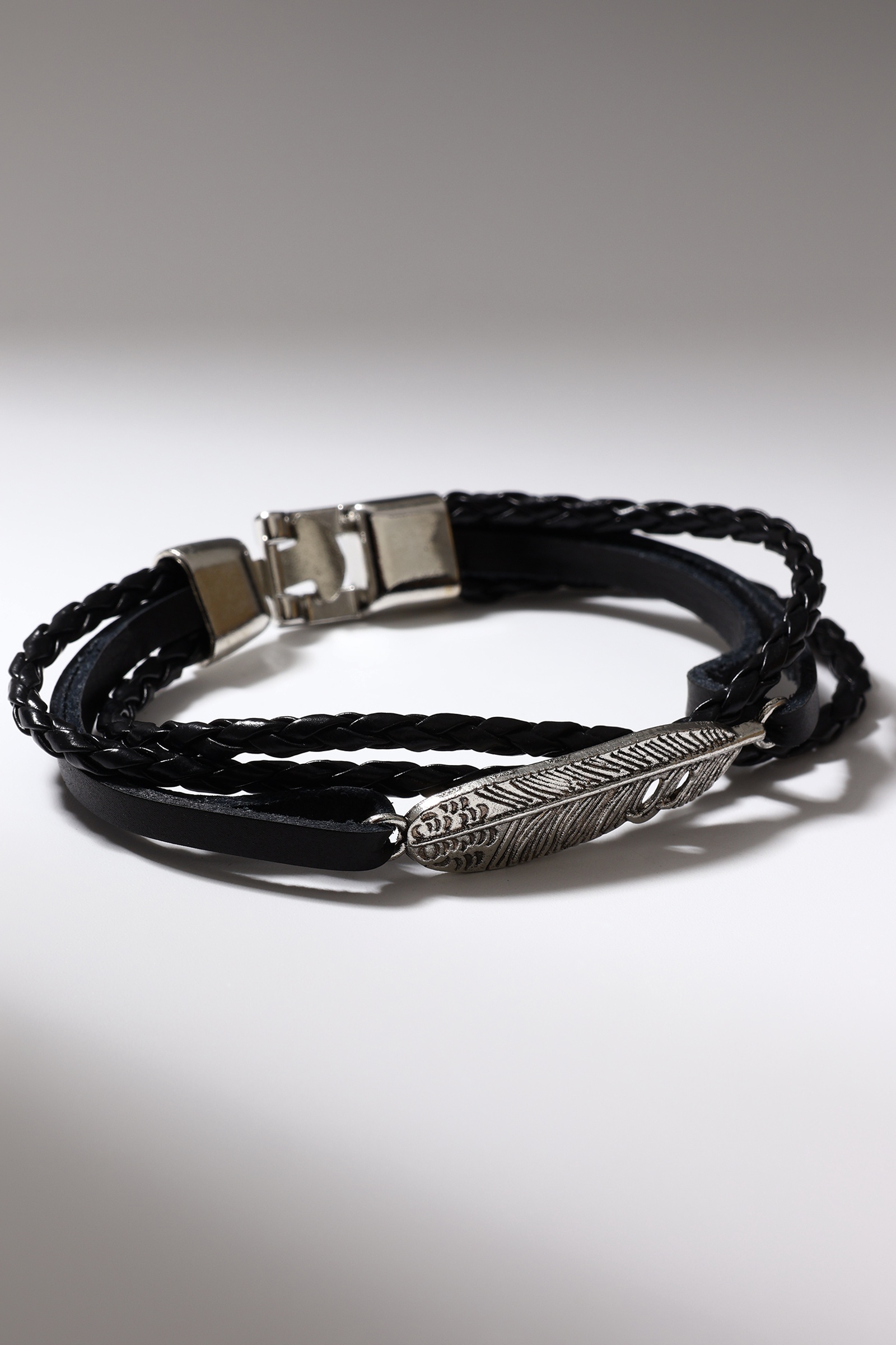 Браслет кожа «атака» перо, чёрный в серебре, L=20.5 см