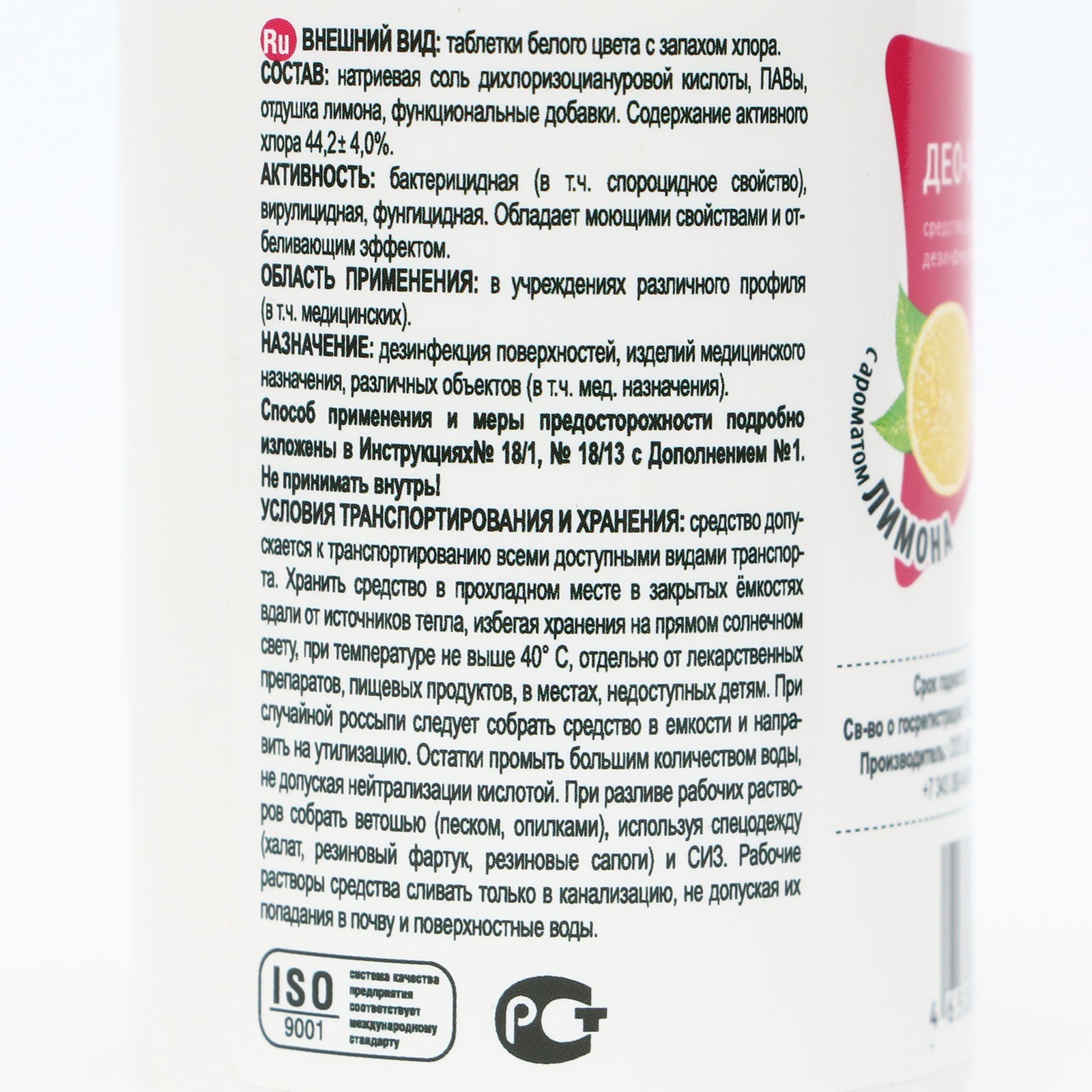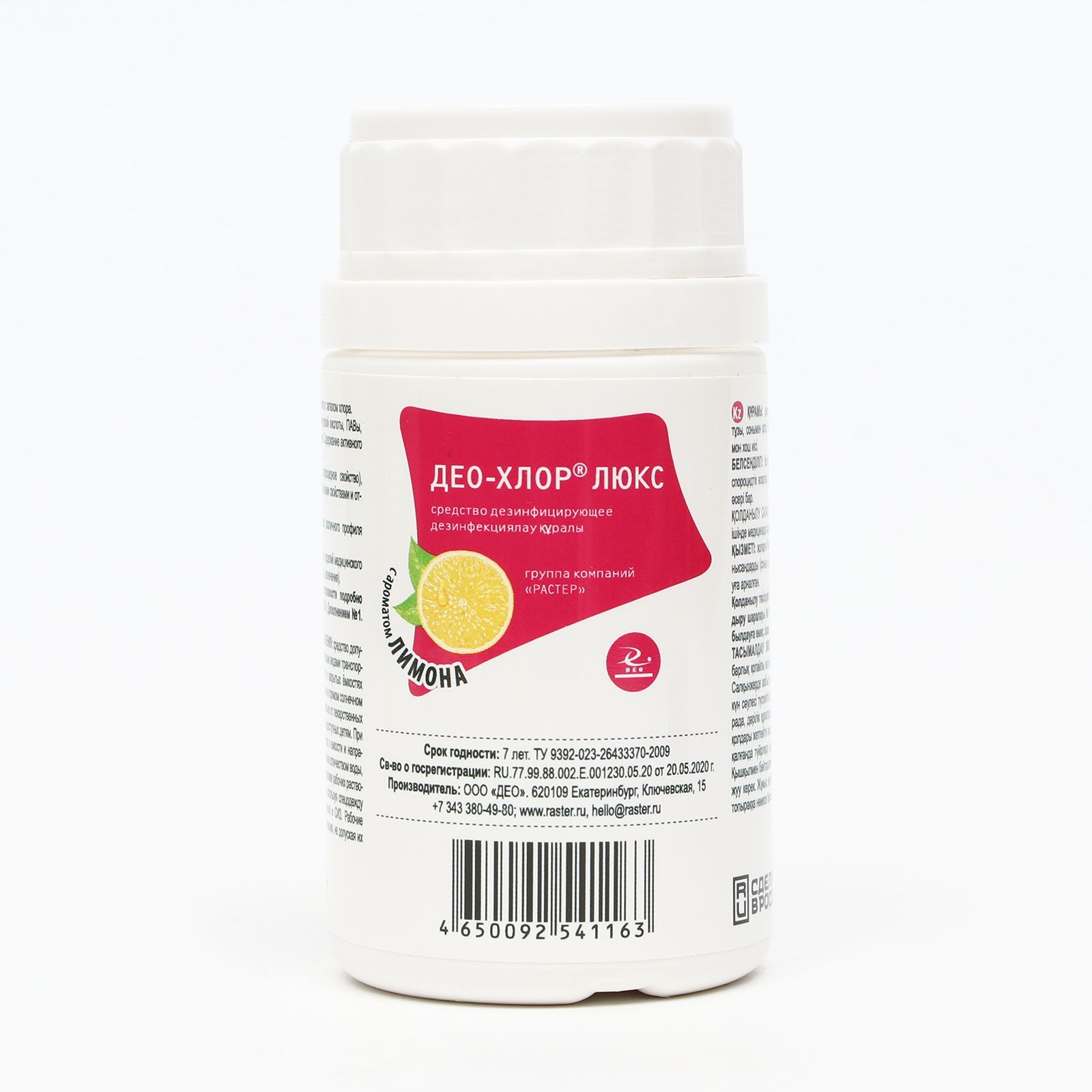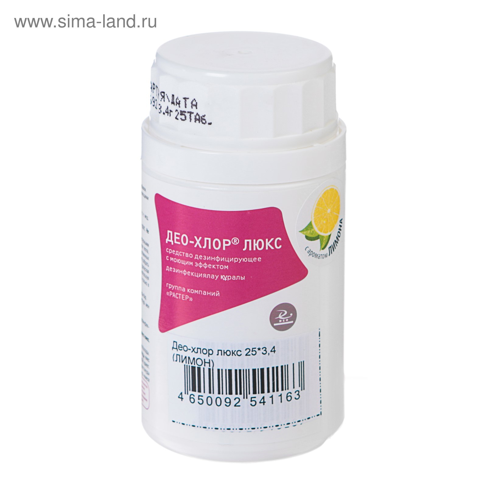 Дезинфицирующее средство «део-хлор люкс», лимон, 25 таблеток по 3,4 г. Препарат группы компаний «РАСТЕР» (Россия) «Део-хлор® люкс» с ароматом лимона – многофункциональный хлорсодержащий препарат для дезинфекции. Отдушка лимона делает запах хлора менее заметным. Все дезинфицирующие свойства сохраняются. Преимущества: Приятная отдушка лимона делает менее заметным запах хлора. Отбеливает, дезодорирует и моет. Длительный срок хранения рабочих растворов (22 суток) и средства (7 лет). Удобная форма выпуска: таблетки 3, 4 г. Практичная упаковка: 25 шт. , 300 шт. Полный спектр антимикробной активности: бактерии (в т. ч. возбудители туберкулеза (Mycobacterium B5, Mycobacterium terrae), внутрибольничных инфекций), вирусы, грибы и плесени; споры бактерий; возбудители паразитарных болезней. Быстрые и экономичные режимы дезинфекции поверхностей и объектов при текущей и генеральной уборке. Обладает низкой токсичностью (3-4 класс опасности). Область применения: Разрешен для проведения текущей, генеральной уборки, заключительной дезинфекции: в медицинских учреждениях, в т. ч. ЛПО и отделениях фтизиопульмонологического профиля;в образовательных учреждениях (детские сады, школы, гимназии, школы-интернаты);на предприятиях бытового обслуживания населения (общественные туалеты, бани, сауны, бассейны, прачечные) и предприятиях сферы ЖКХ (для дезинфекции мусоросборников, мусоропроводов, подьездов и мест общего пользования жильцов);на предприятиях общественного питания (рестораны, кафе, столовые, закусочные, буфеты, небольшие предприятия продовольственной торговли, предприятия выездного обслуживания);предприятиями клининговой службы и/или оказывающие услуги по дезинфекции помещений;на станциях переливания крови, диагностических лабораториях, в укладках скорой помощи – для ликвидации аварийных ситуаций в результате пролития биологических жидкостей и выделений больных, включая кровь. Вес, г/Объём, мл: 85 Объём, мл: 85 Форма выпуска: Таблетки Назначение: Профессиональные Температурное ограничение: Нет Вид: Хлоросодержащиее  развернуть описание ▼