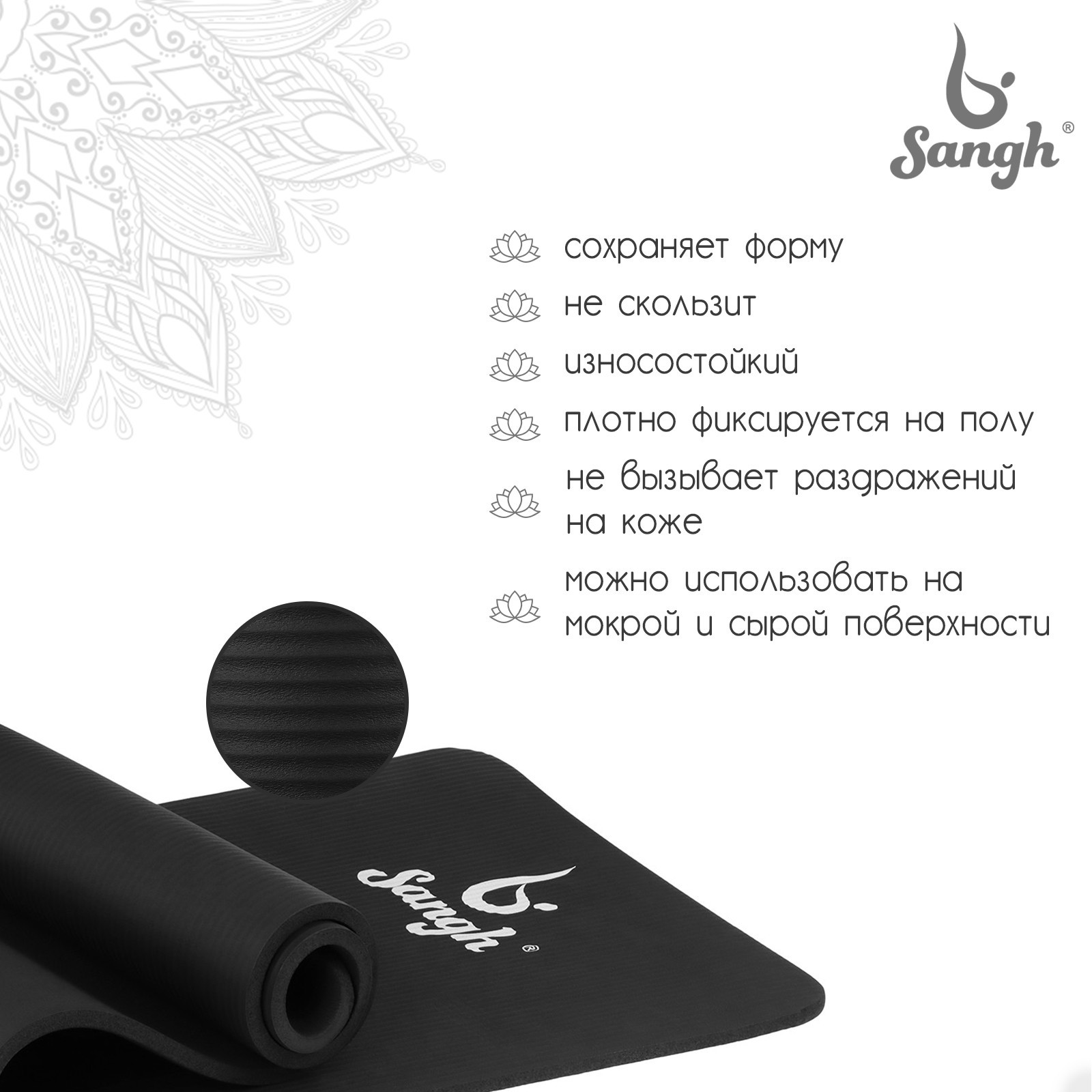 Коврик для йоги sangh, 183x61x1 см, цвет чёрный. Коврик подходит для занятий йогой и фитнесом дома и в спортивных залах. Помогает в выполнении асан или других упражнений. Смягчает упор тела на твёрдую поверхность. Сохраняет форму после выполнения упражнений. Цвет: Чёрный Длина, см: 183 Ширина, см: 61 Толщина, мм: 10 Возраст: Взрослый Материал: NBR Особенности: Эластичный Особенности: Нескользящий Вид: Классический  развернуть описание ▼