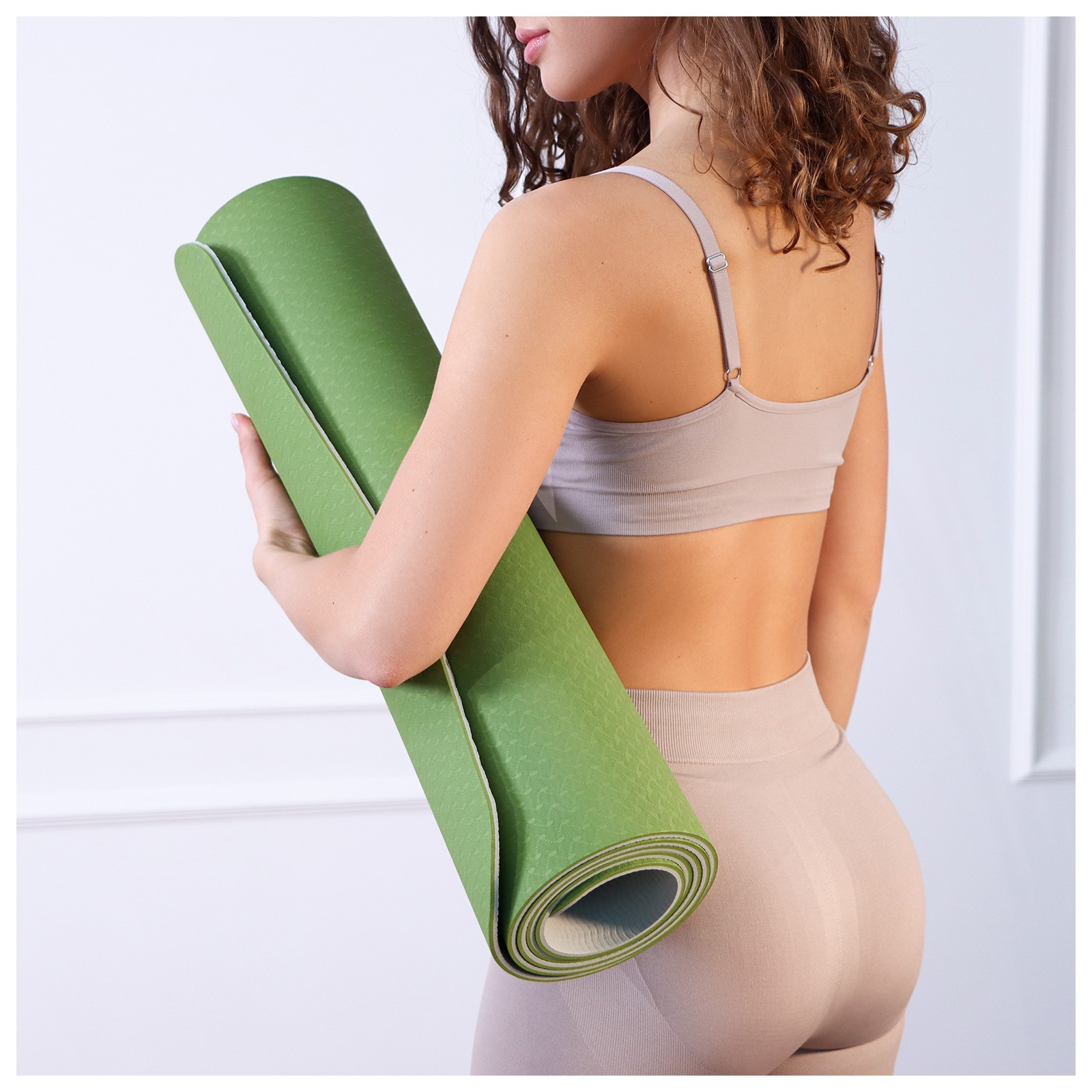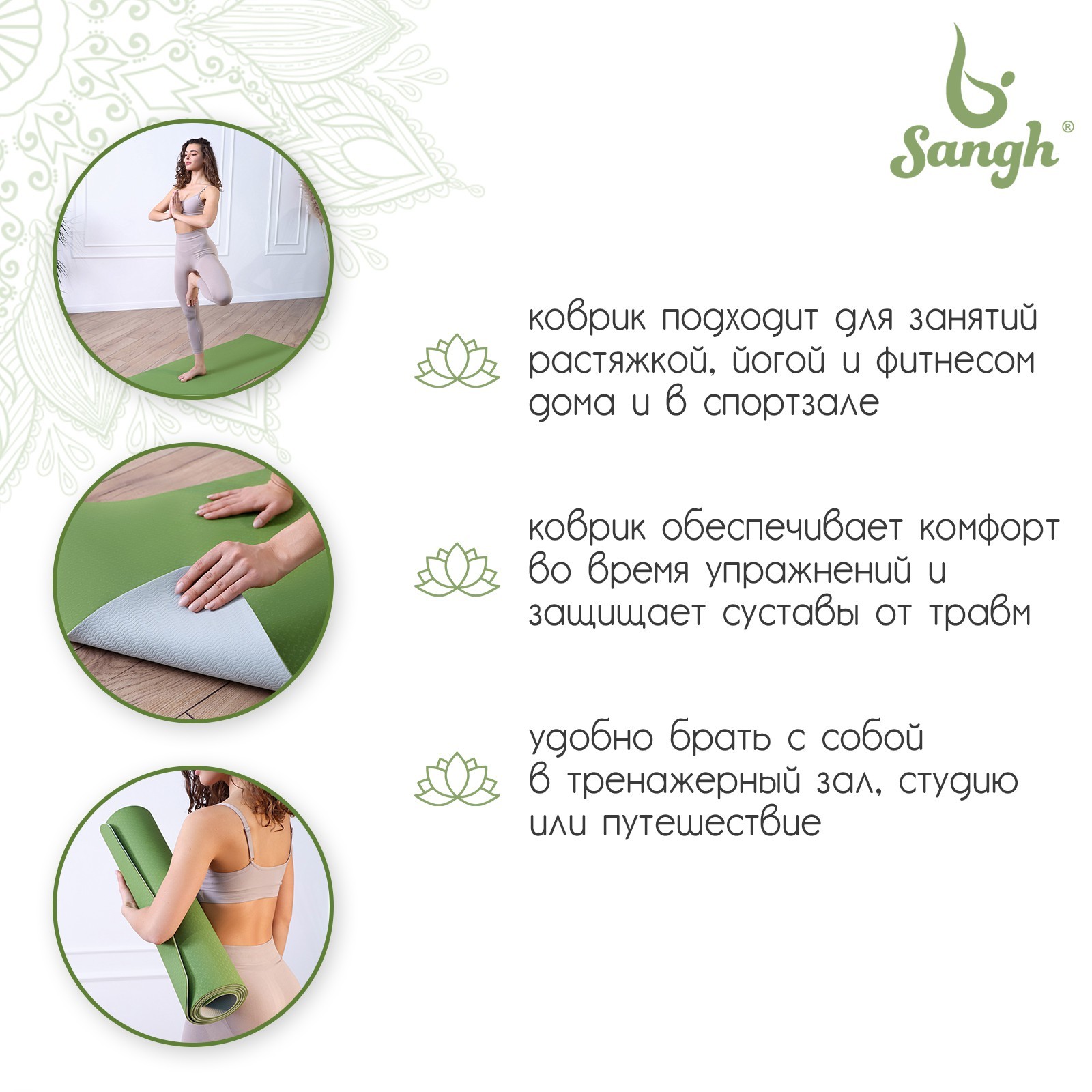 Коврик для йоги sangh, 183x61x0,6 см, цвет зелёный. Коврик подходит для занятий йогой и фитнесом дома и в спортивных залах. Помогает в выполнении асан или других упражнений. Смягчает упор тела на твёрдую поверхность. Сохраняет форму после выполнения упражнений. Особенность коврика из термопластичного эластомера состоит в том, что он обладает антискользящими свойствами, сохраняет форму, имеет плотную и упругую структуру. Коврик из термопластичного эластомера эластичный и мягкий, приятный на ощупь, не выгорает на солнце и устойчив к распространению бактерий. Но его нужно беречь от обильной влаги, чтобы не допустить скольжение на гладкой поверхности. Цвет: Зелёный Длина, см: 183 Ширина, см: 61 Толщина, мм: 6 Возраст: Взрослый Материал: Термопластичный эластомер Особенности: Эластичный Особенности: Нескользящий Особенности: Водоотталкивающий Вид: Классический  развернуть описание ▼