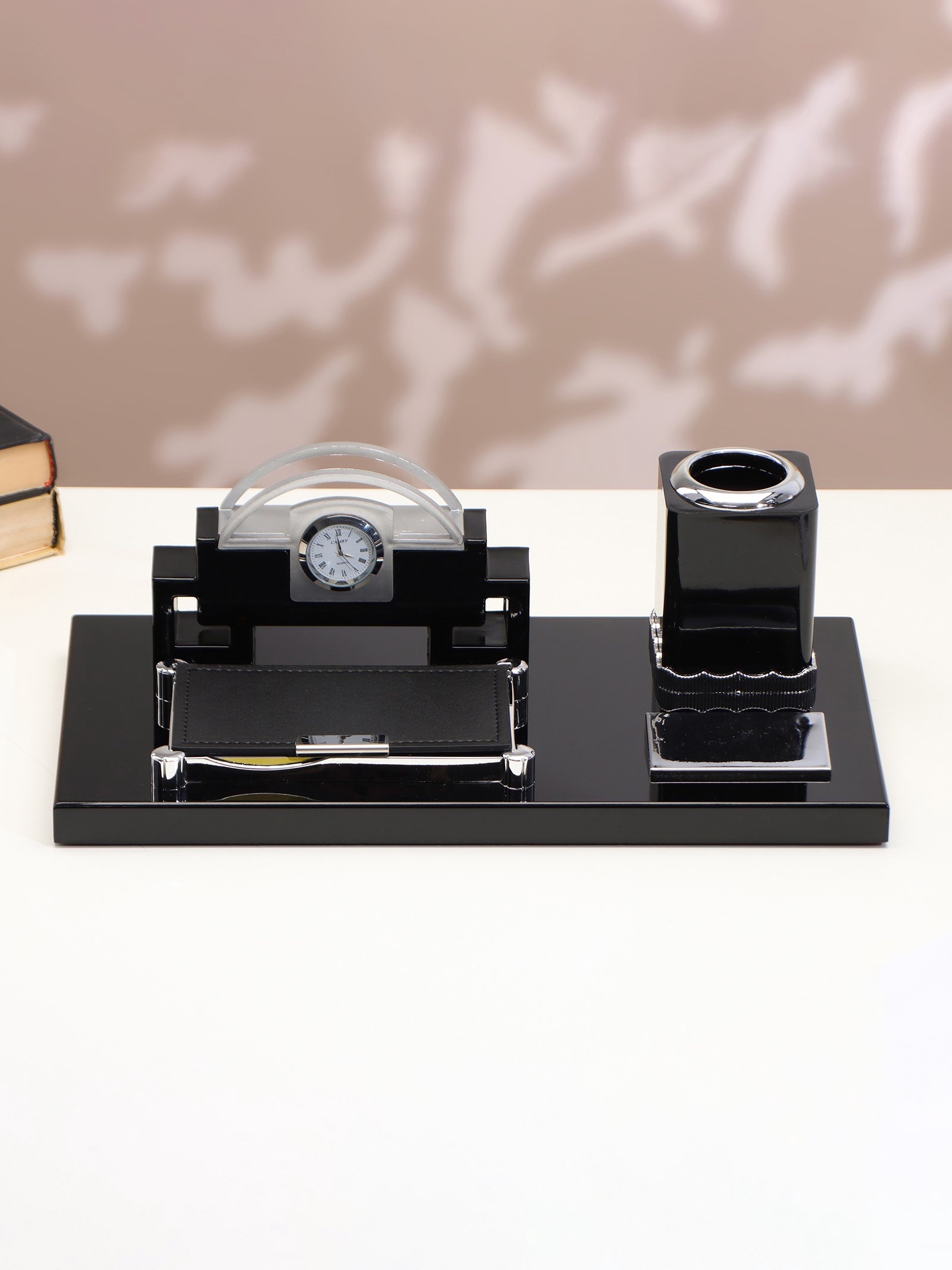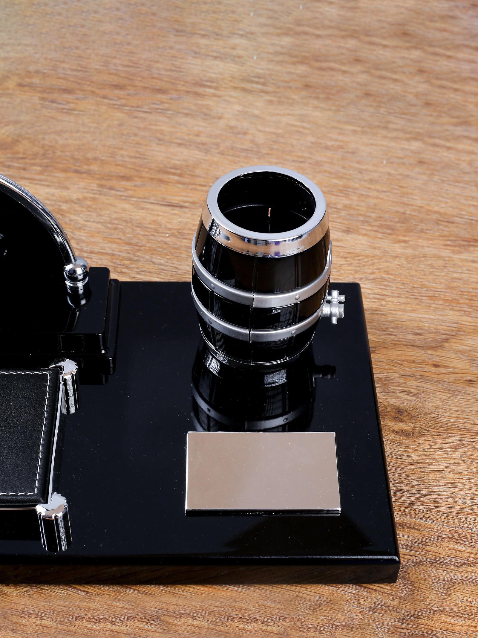 Набор настольный, органайзер 4 в 1 с визитницей и часами, 34 17 13 см. Порой рабочий стол настолько загружен, что негде расписаться или составить документ от руки. А на большинство людей беспорядок действует негативно, снижает концентрацию и продуктивность. Компактный настольный набор поможет избежать хаоса на рабочем месте. Храните в нём канцелярские принадлежности или другие мелочи, чтобы правильно организовать пространство. К тому же изделие имеет минималистичный дизайн и выполнено под дерево, поэтому оно украсит собой любое место как декоративный элемент. С помощью такого аксессуара можно поздравить сотрудников, руководство, деловых партнёров, также он подойдёт в качестве подарка учителям и преподавателям. Набор:Да|Цвет:Чёрный|Количество секций:1|В наборе, шт.:4|Рисунок:Нет|Материал:Дерево|С часами:Да|Страна:Китай  развернуть описание ▼