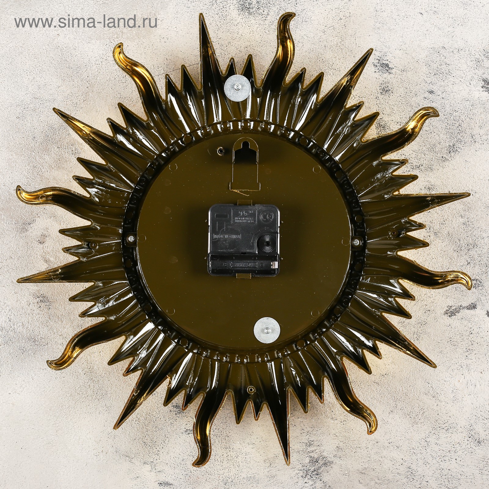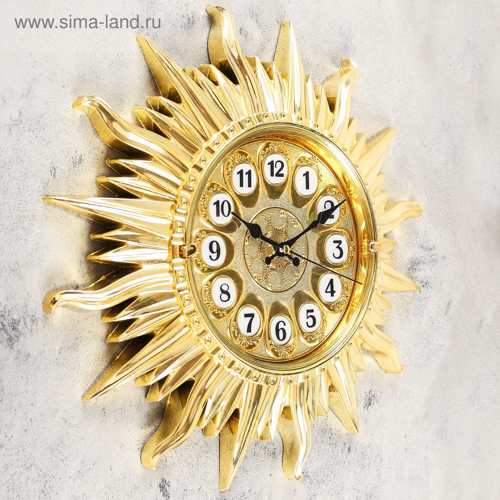 Модель можно разместить в гостиной, спальне или офисе.Корпус часов выполнен из пластика.Тип питания:От батареек|Форма:Фигурная|Ширина, см:35|Высота, см:35|Тематика:Интерьер|Тип индикации:Арабские цифры|Тип механизма:Кварцевый|Цвет циферблата:Золотистый|Материал:Стекло|Материал:Пластик|Работает от сети:Нет|Типоразмер батареек:AA (LR6)|Ход стрелок:Дискретный|Цвет корпуса:Золотистый|Бесшумные:Нет|Страна:Китай