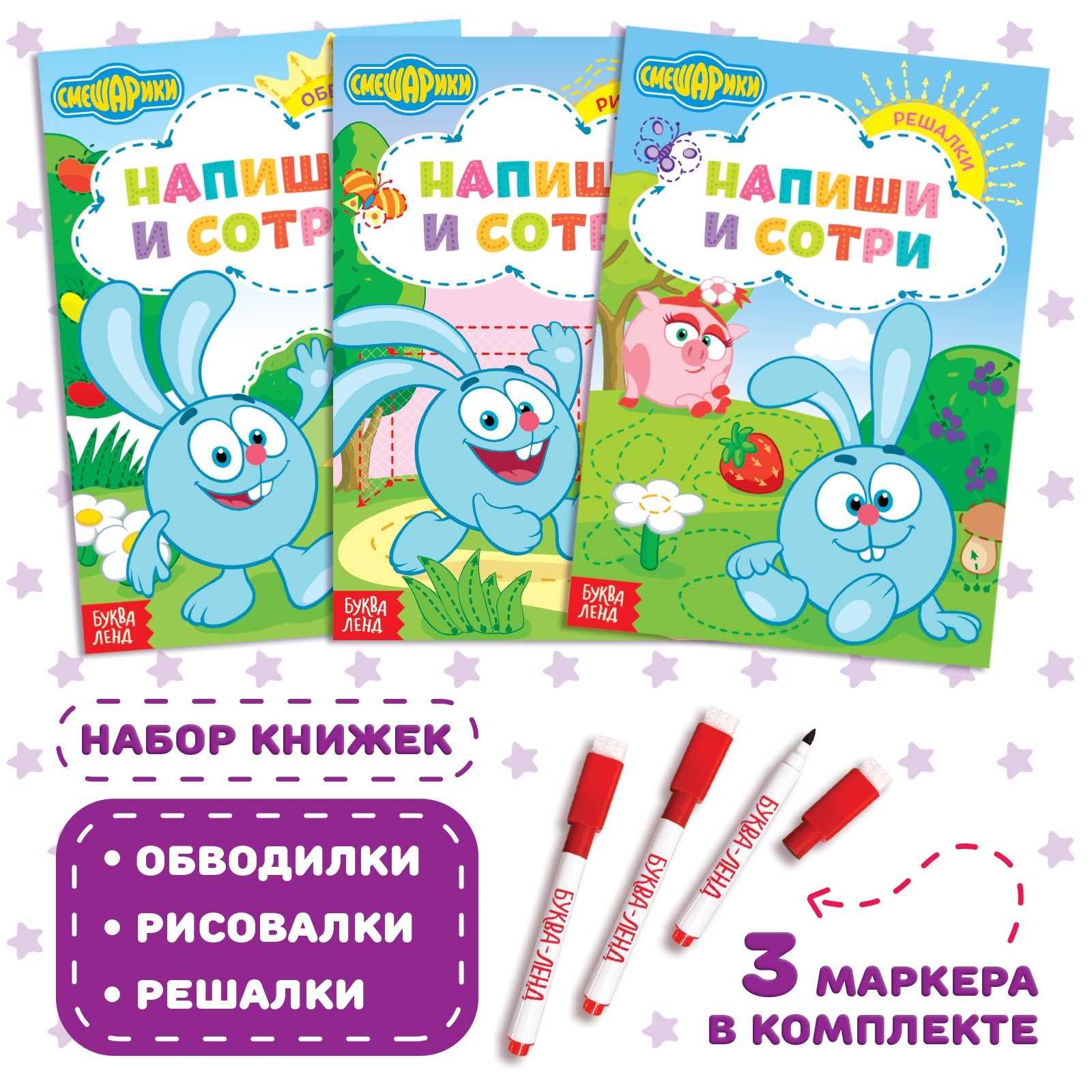 Книги «напиши и сотри», набор 3 шт. по 12 стр., а5, 3 маркера, смешарики