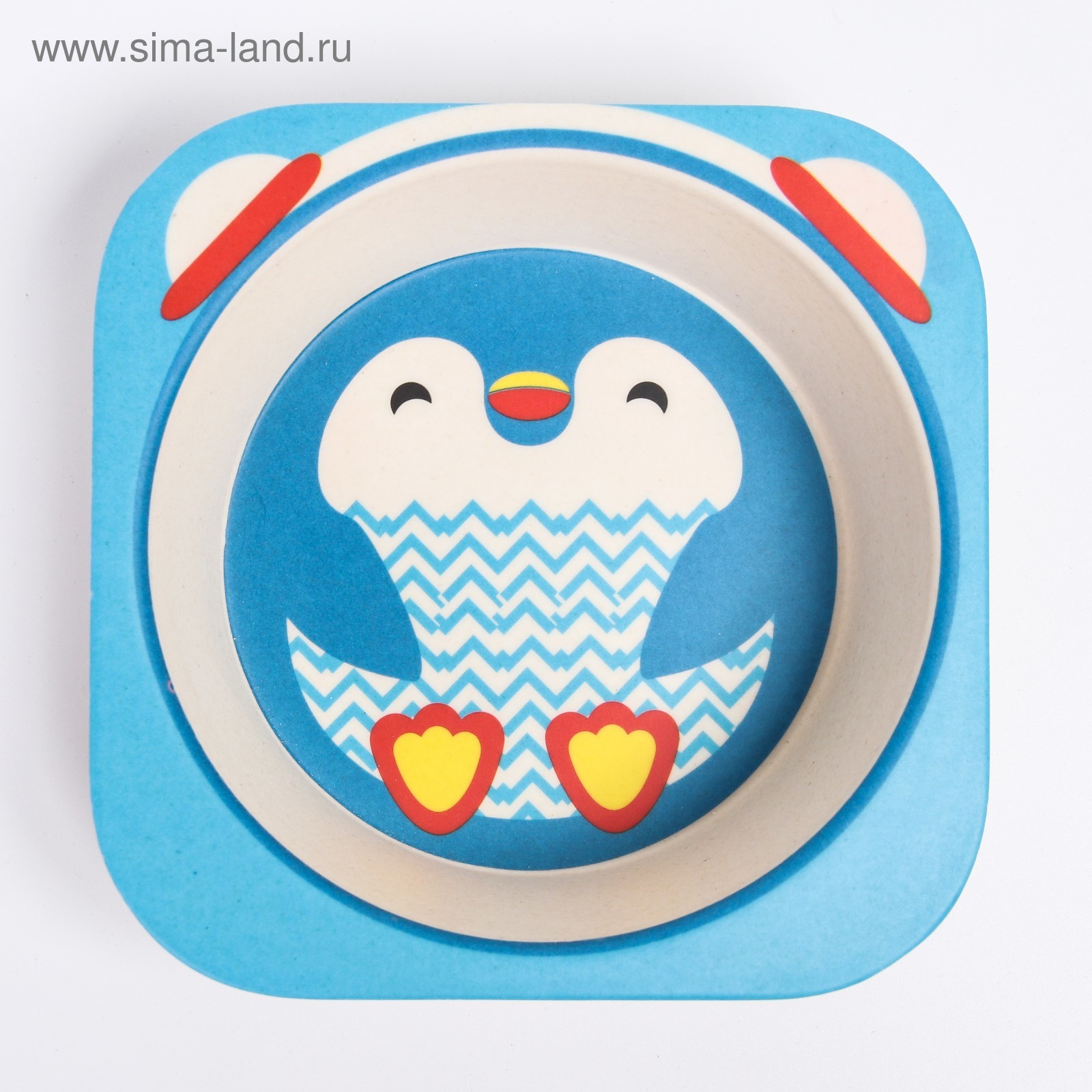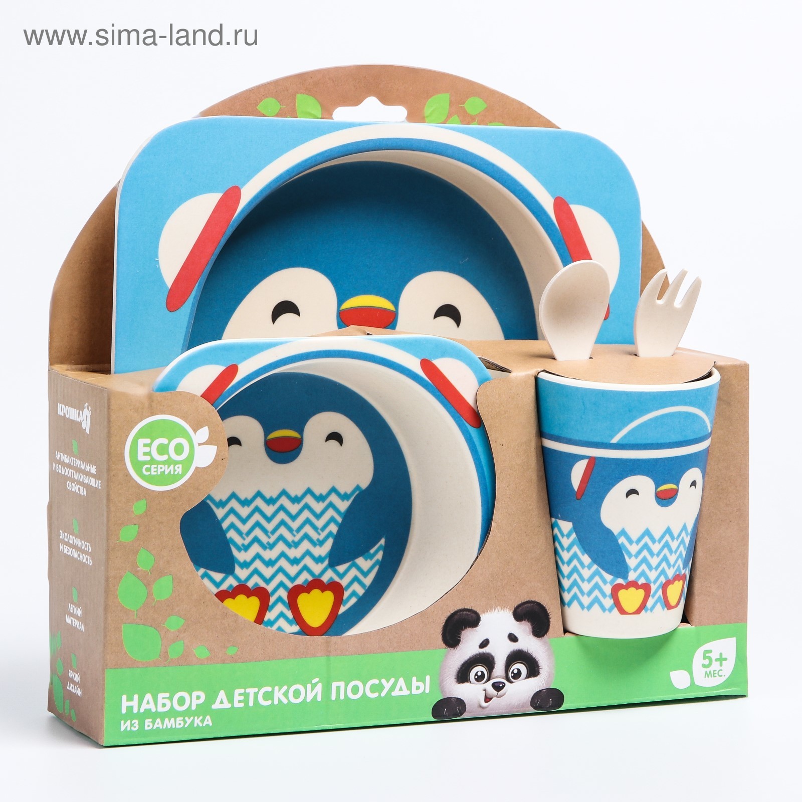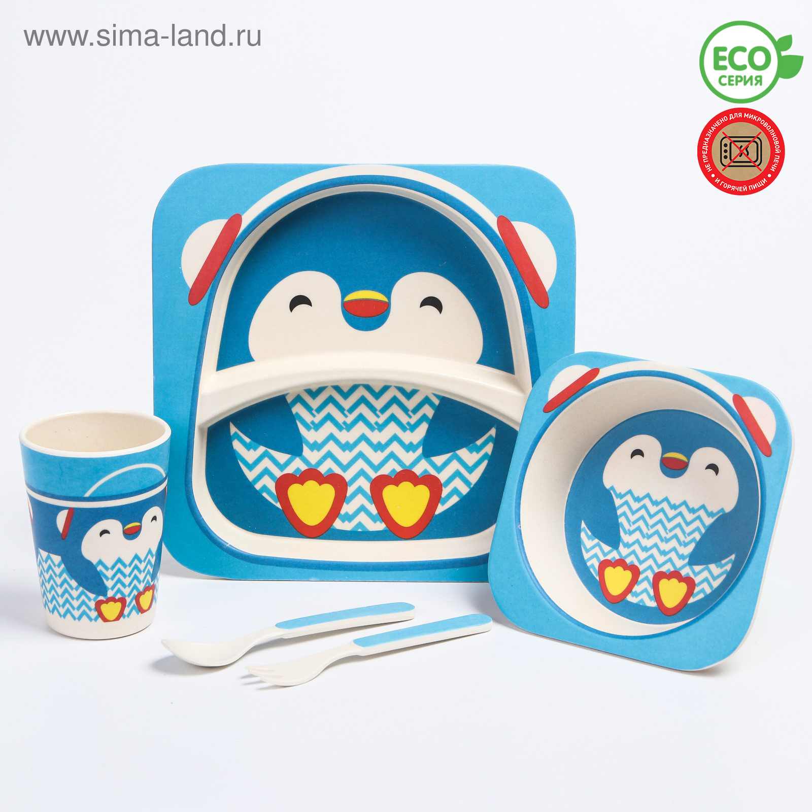 Набор детской бамбуковой посуды «пингвин», тарелка, миска, стакан, приборы, 5 предметов