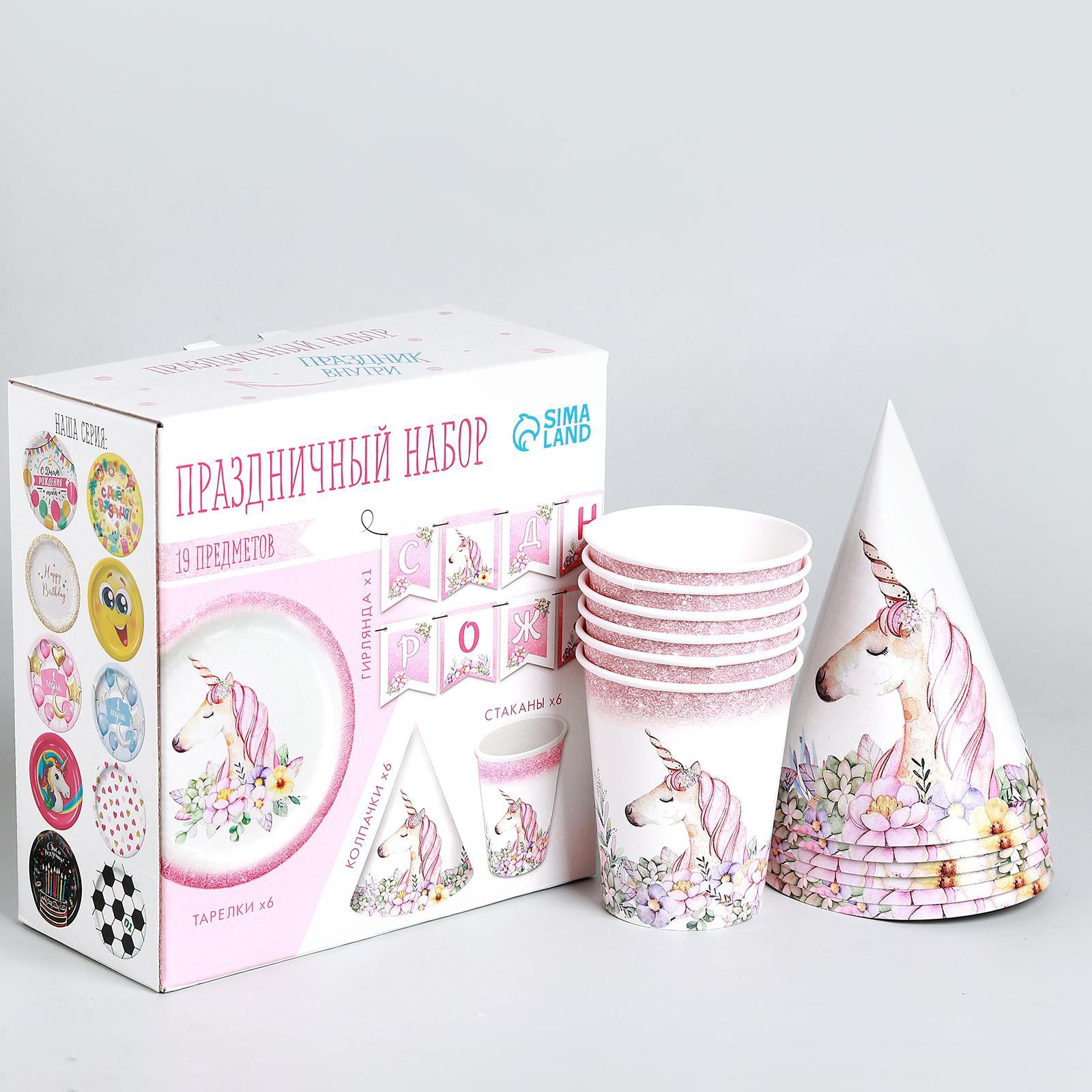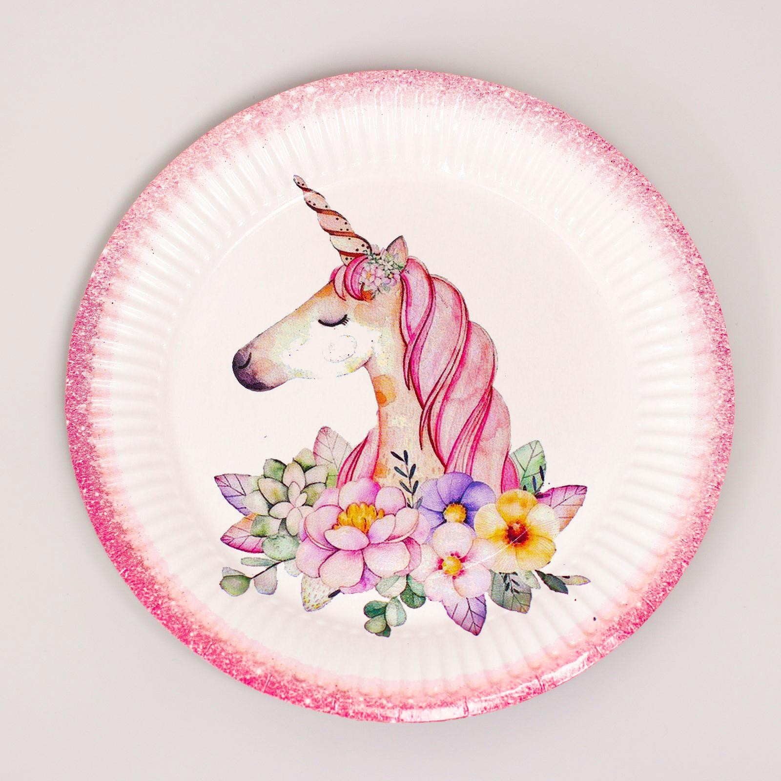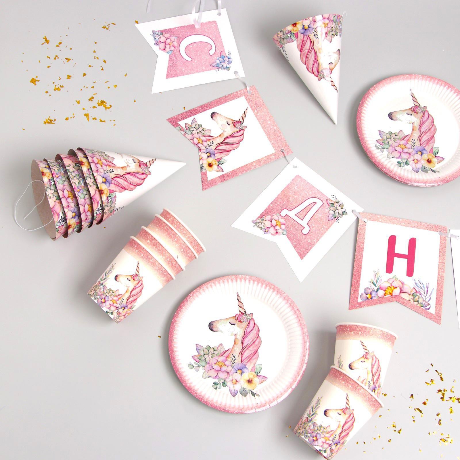 Набор бумажной посуды одноразовый единорог с цветами», 6 тарелок, 1 гирлянда, 6 стаканов, 6 колпаков