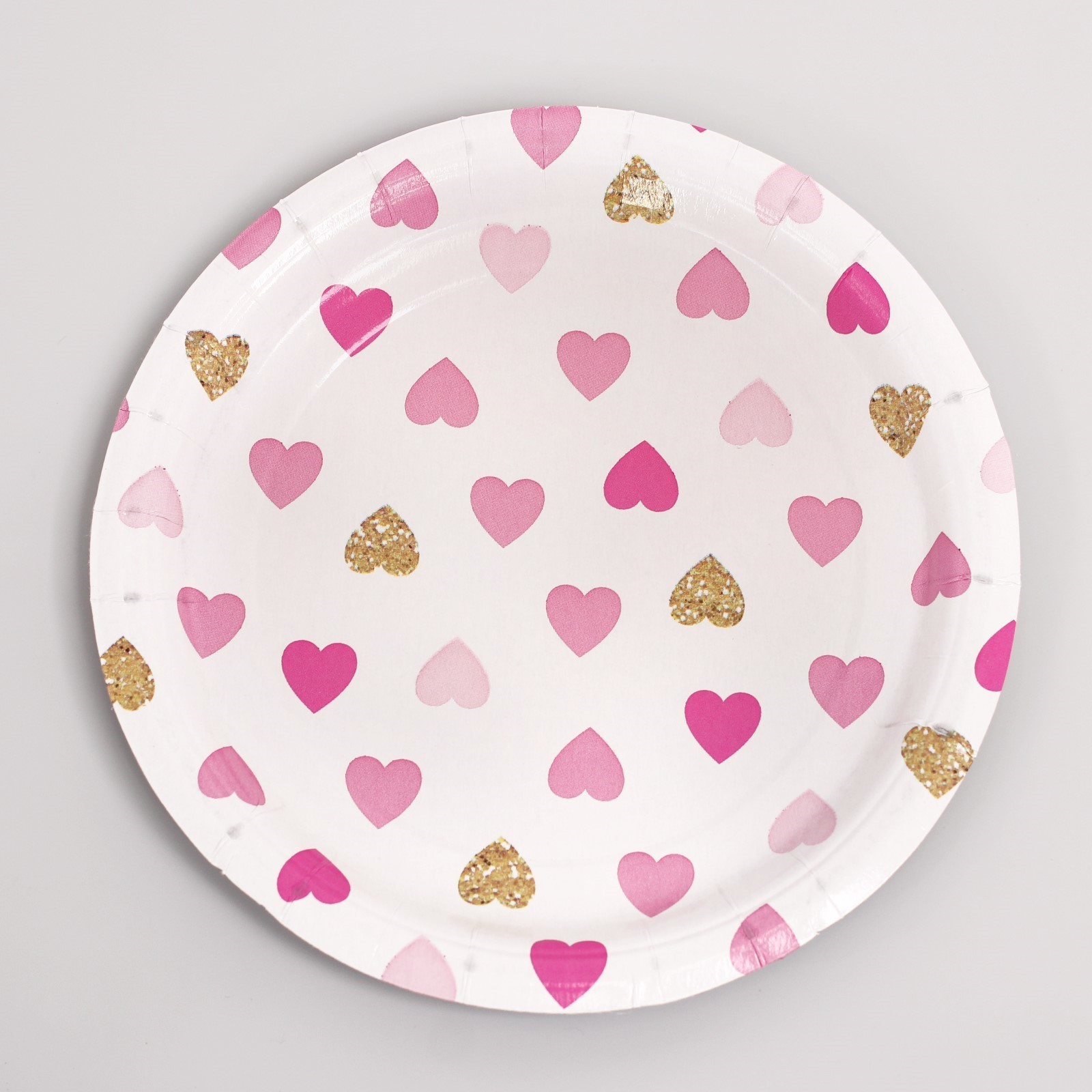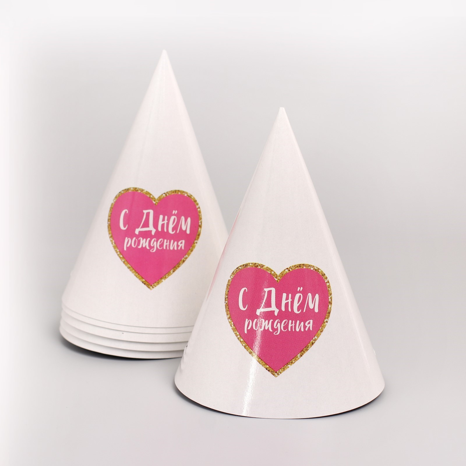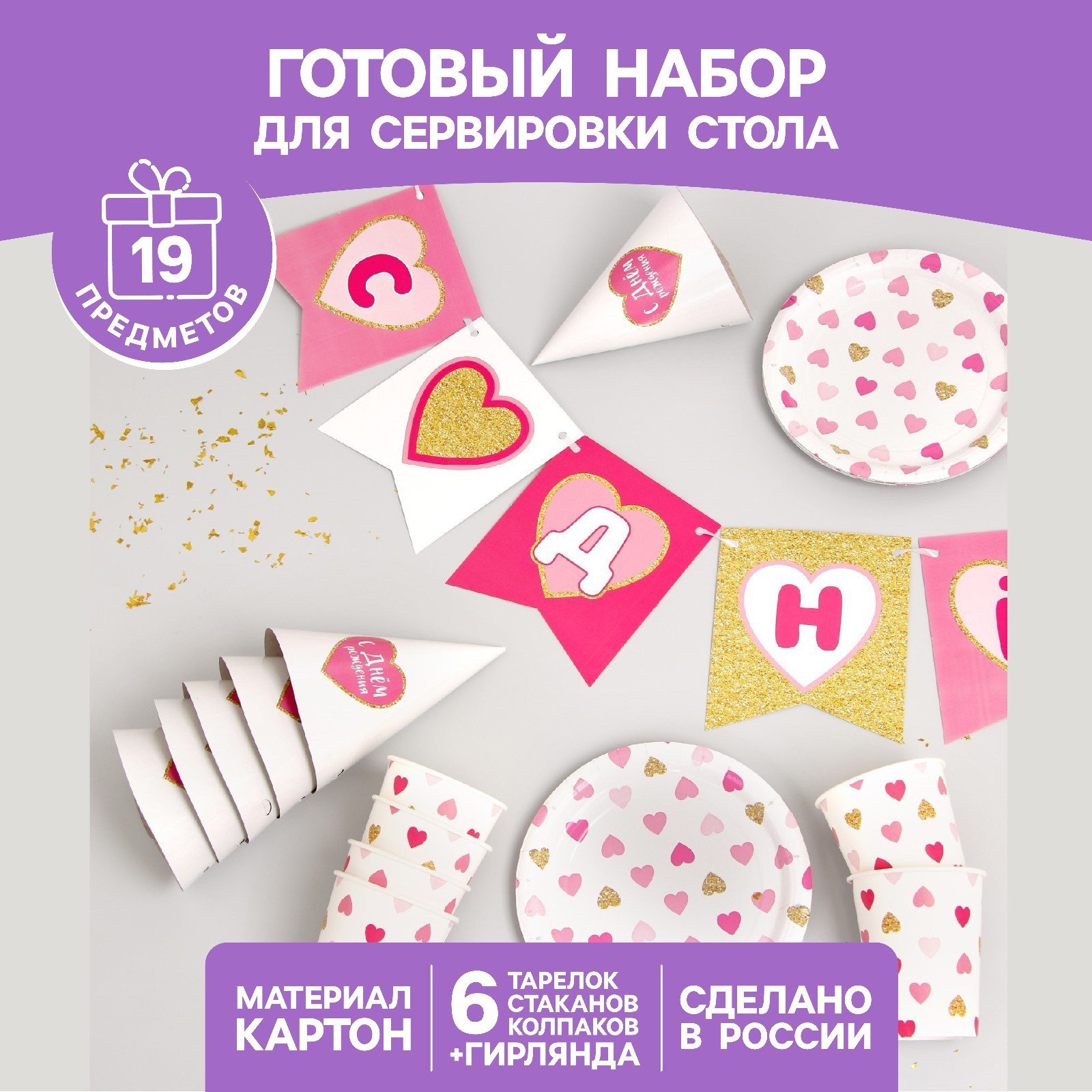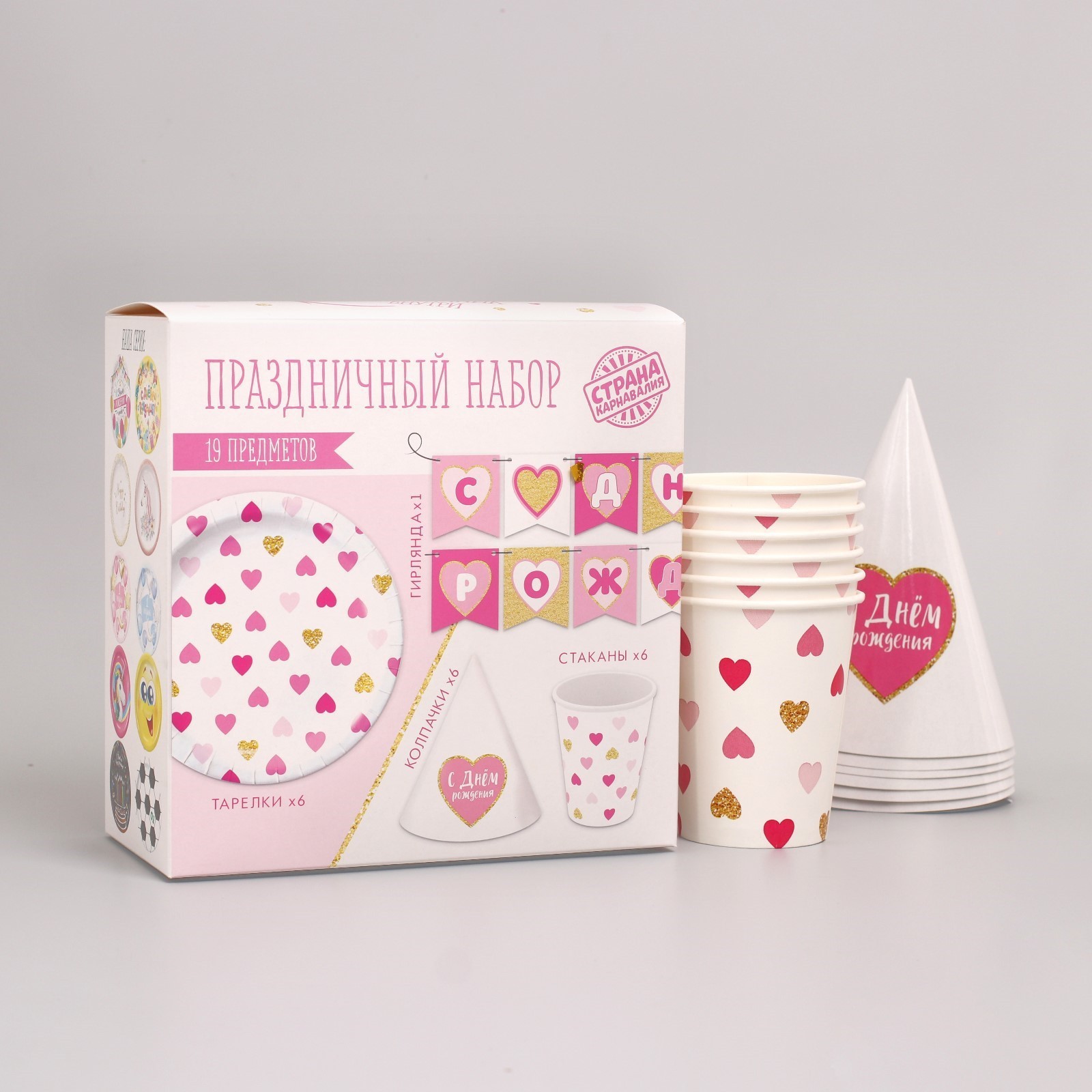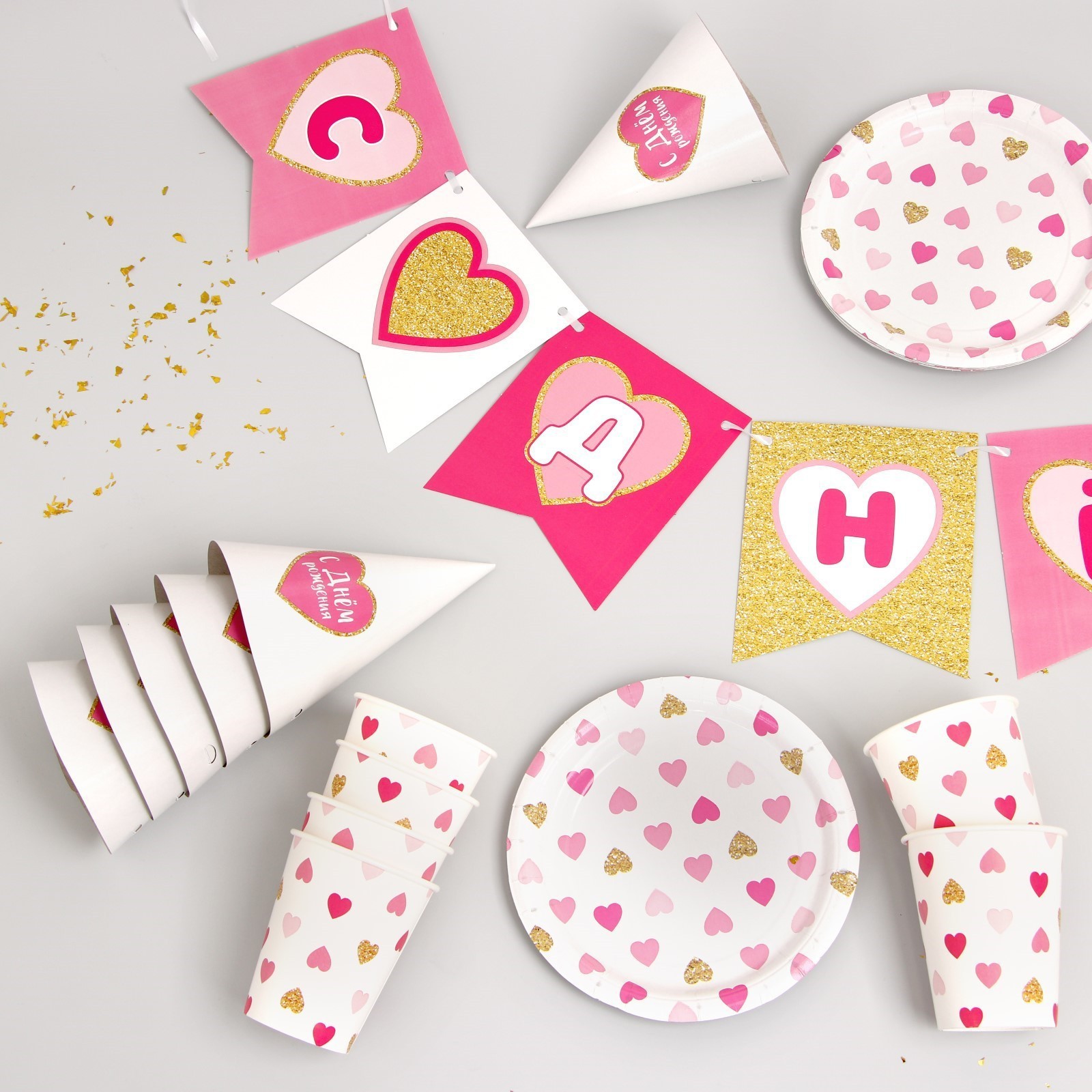 Набор бумажной посуды одноразовый с днём рождения, сердечки», 6 тарелок , 1 гирлянда , 6 стаканов, 6 колпаков