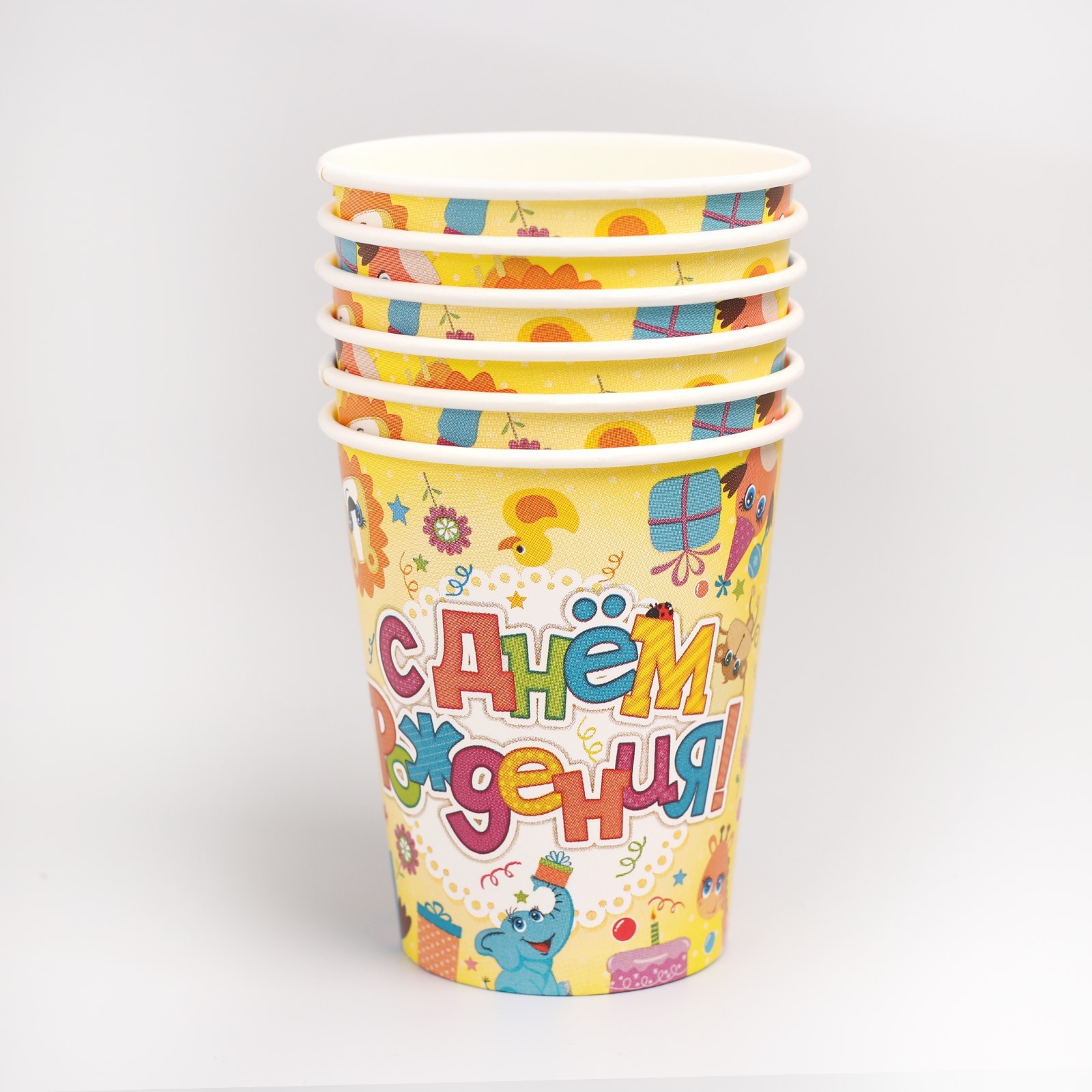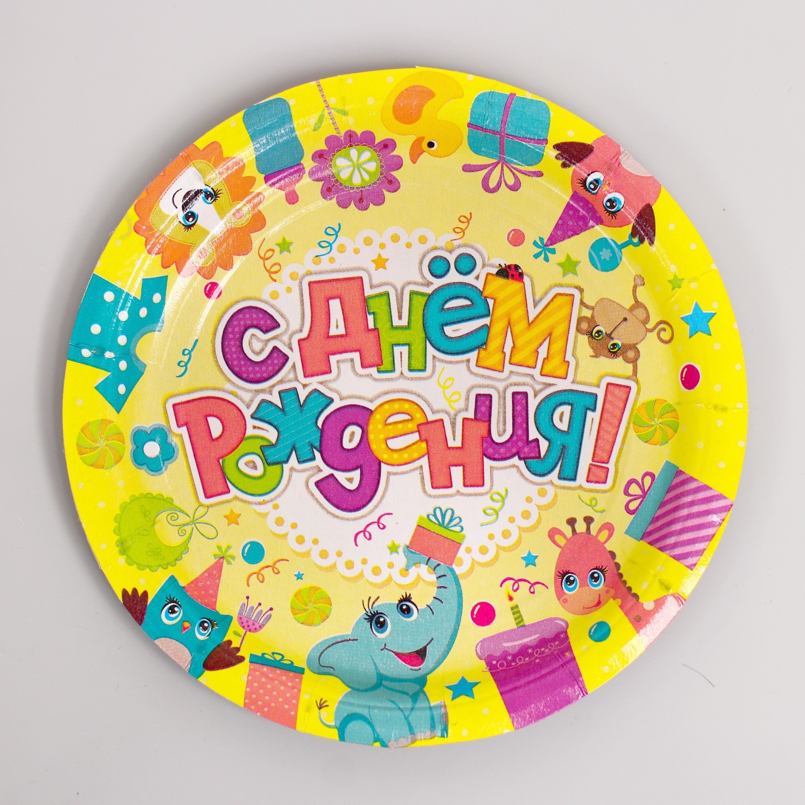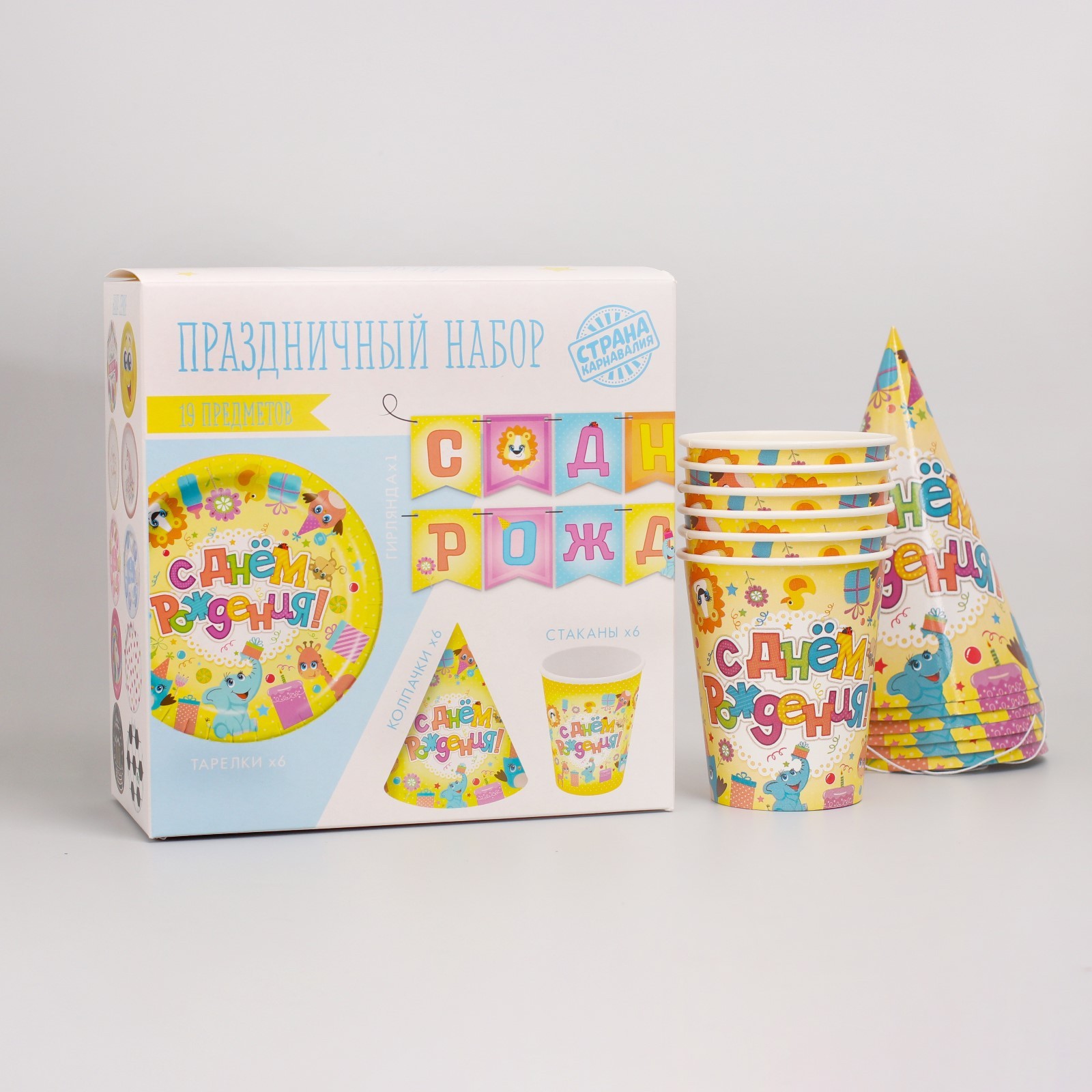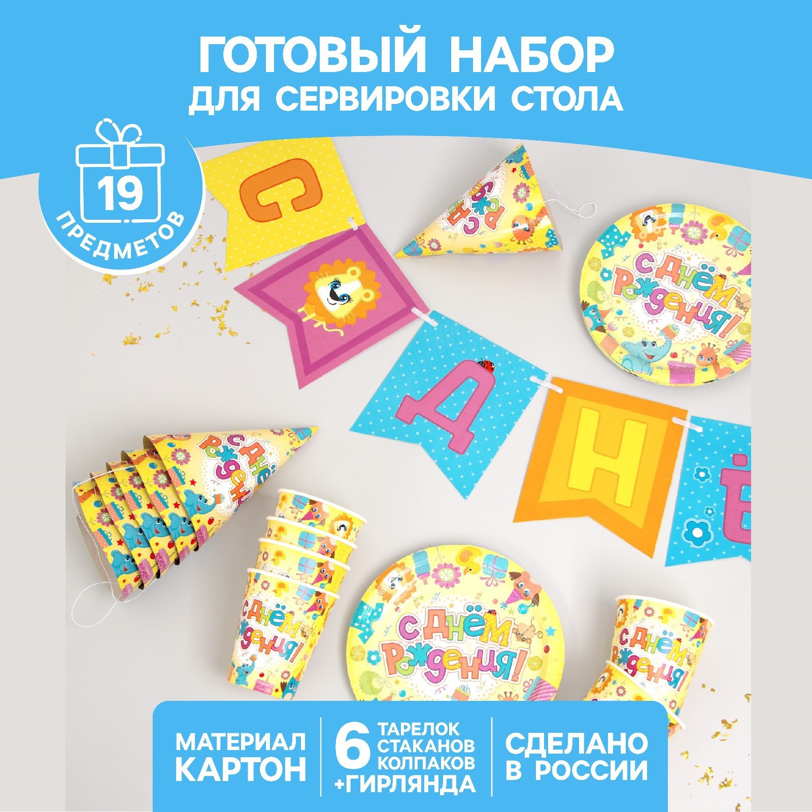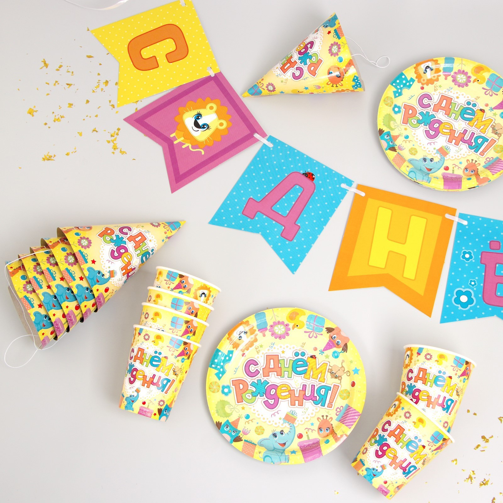 Набор бумажной посуды одноразовый весёлые животные», 6 тарелок , 1 гирлянда , 6 стаканов, 6 колпаков