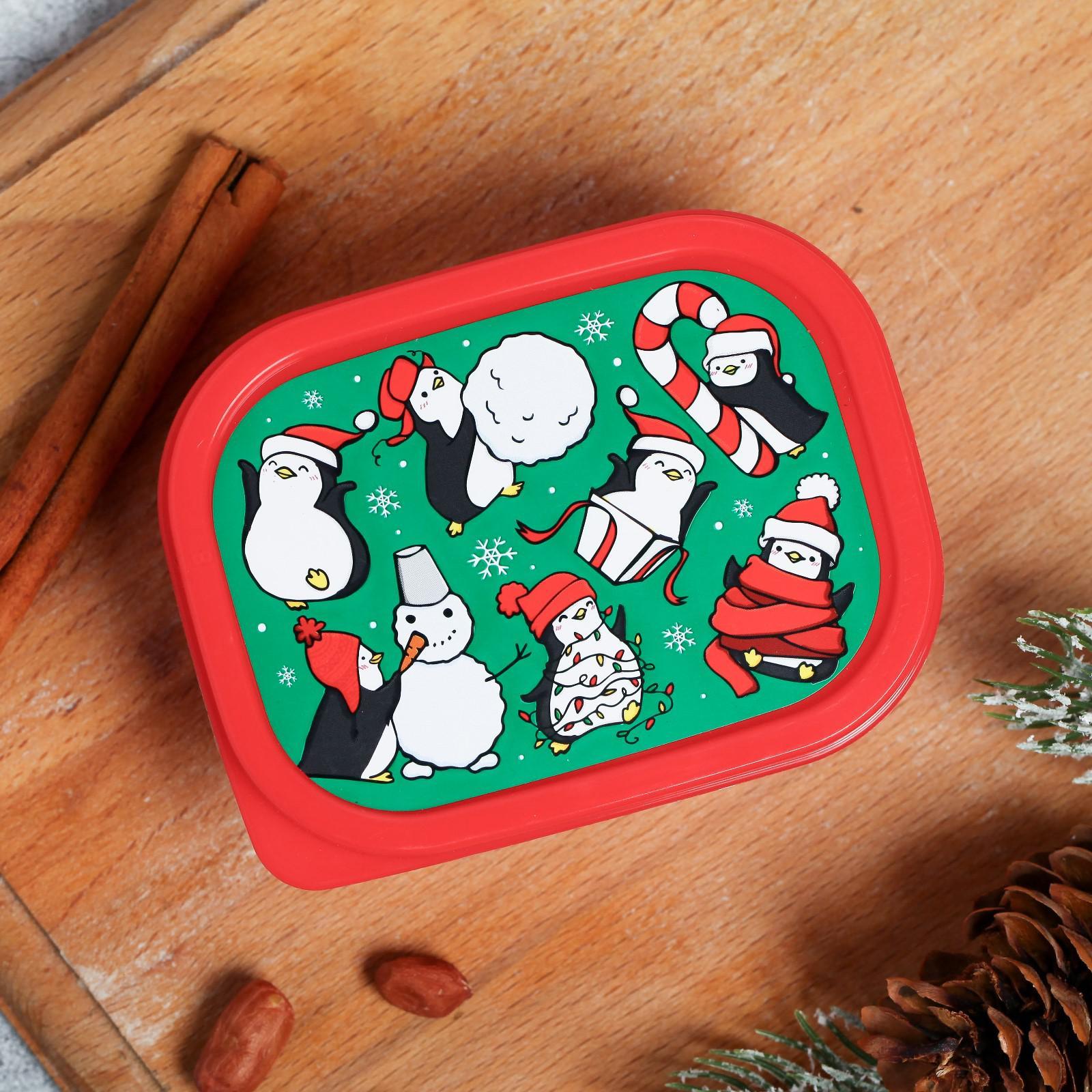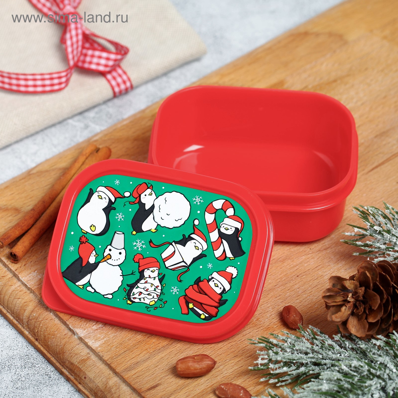 Ланч - бокс новогодний «пингвиненок», 150 мл. Ланч-бокс «Пингвинёнок» — идеальный подарок для ваших близких! Этот стильный и функциональный ланч-бокс станет незаменимым помощником в организации здорового питания. Преимущества: Компактный размер: легко помещается в сумку или рюкзак, не занимая много места.Ёмкость 150 мл: достаточно для одного полноценного приёма пищи.Прочный материал: изготовлен из высококачественного пищевого пластика, безопасного для здоровья.Герметичная крышка: обеспечивает сохранность продуктов и отсутствие неприятных запахов.Оригинальный дизайн: яркий новогодний принт поднимет настроение и добавит праздничной атмосферы.Ланч-бокс «Пингвинёнок» — отличный выбор для тех, кто заботится о своём здоровье и хочет наслаждаться вкусной едой в любое время года. Порадуйте себя и своих близких этим замечательным подарком! Набор:Нет|Цвет:Красный|Объём, л:0.15|Время сохранения тепла/холода, ч:1|Объём, мл:150|Рисунок:Да|Символ года:Нет|Тематика праздника:Новый год|Материал:Полипропилен|Герметичная крышка:Да|Наличие столовых приборов:Нет|Можно мыть в посудомоечной машине:Да|Можно использовать в СВЧ-печи:Да|Цвет крышки:Зелёный|Особенности :Герметичный|Страна:Россия  развернуть описание ▼