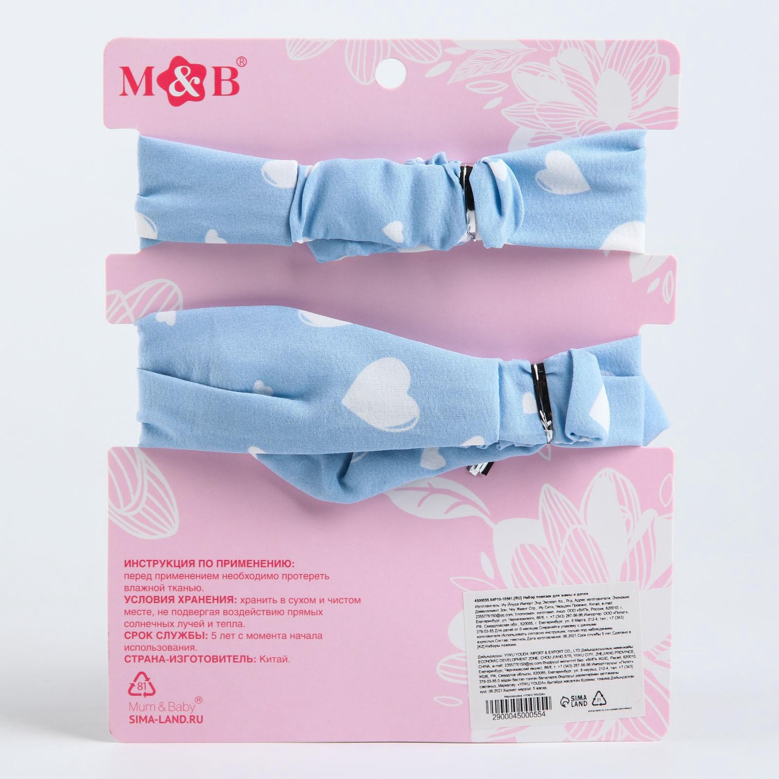 Повязка на голову для мамы и дочки m&b «family look: сердечки» 2 шт., голубой. Обхват головы повязки для малышки: минимум - 43 см, максимум - 56 см Обхват повязки для взрослого: минимум - 53 максимум - 67 смНабор:Да|Цвет:Голубой|Для кого:Для девочки|Для кого:Для женщины|Назначение:Повседневная|Возраст:От 0 месяцев|В наборе, шт.:2|Сезон:Всесезонный|Вид упаковки:Пакет|Тематика праздника:Универсальная тематика|Материал:Текстиль|Составляющие набора:Повязка|Возраст:0-1 мес|Размер, см:34-36|Размер, см:36-38|Страна:Китай  развернуть описание ▼
