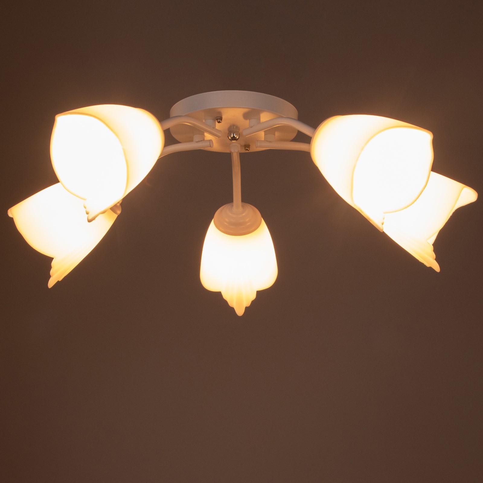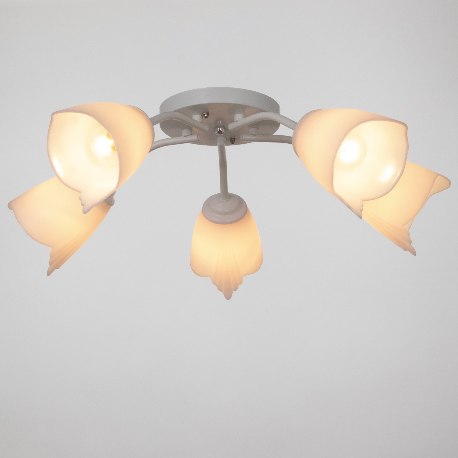 Люстра легко монтируется на планку и подходит даже для натяжных потолков при использовании светодиодных ламп. Направленные в стороны плафоны обеспечивают равномерное освещение без слепящих бликов. Отсутствие пульта управления позволяет интегрировать светильник в существующую систему выключателей.