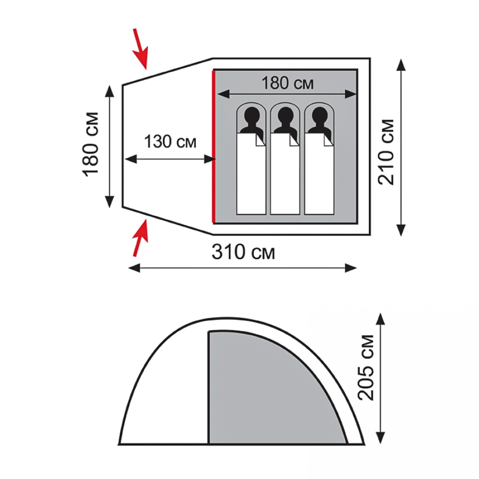 Комплектация: стальные колышки, оттяжки;Материал Каркаса: Fiberglass;Каркас: Fiberglass 9, 5/11мм;Количество слоев: 2;Колличество входов: 2;Количество мест: 3;Материал дна: армированный полиэтилен (терпаулинг);Материал тента: 100% полиэстер 75D/190T Taffeta;Материал внутренняя палатка: 100% дышащий полиэстер;Москитные сетки на входе в спальные отделения: Да;Проклейка швов: Да;Снежная юбка: Нет;Стойки козырька: Нет;Водостойкость тента: 2000 мм;Водостойкость дна: 10000 мм.
