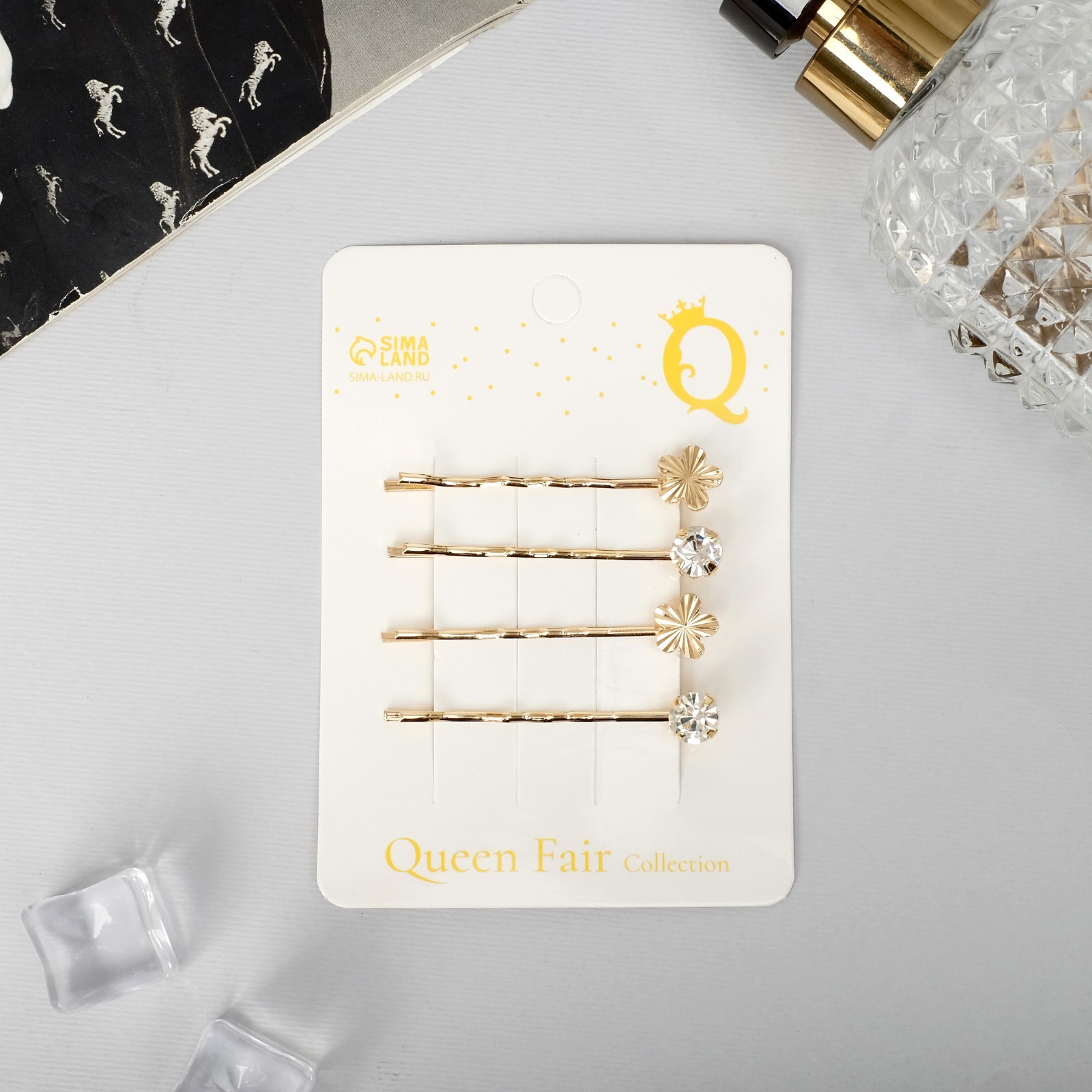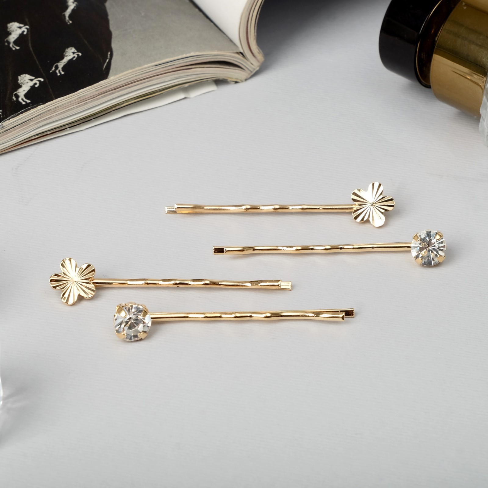 Невидимки для волос «кварта», 5 см, набор 4 шт., цветочки страза, золото