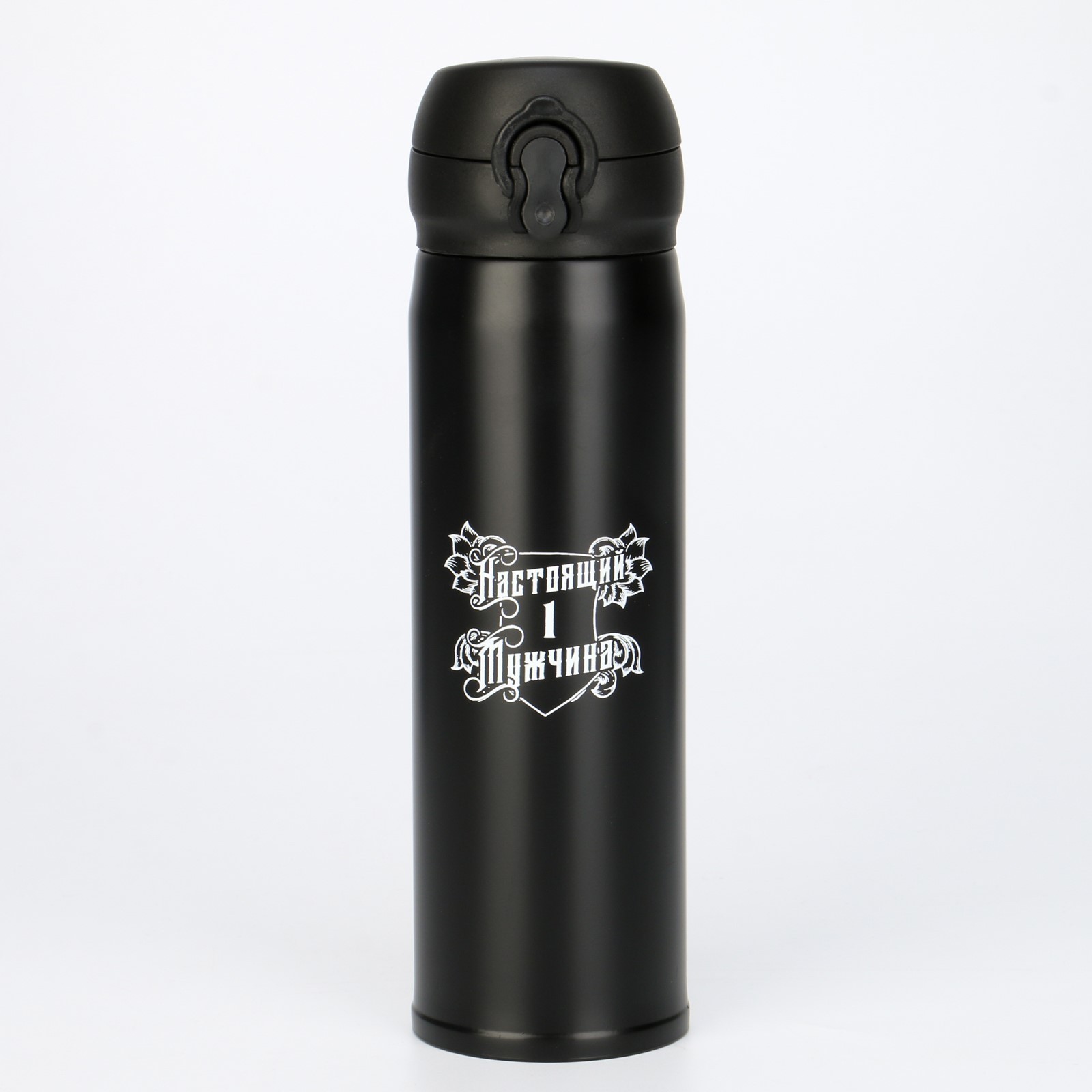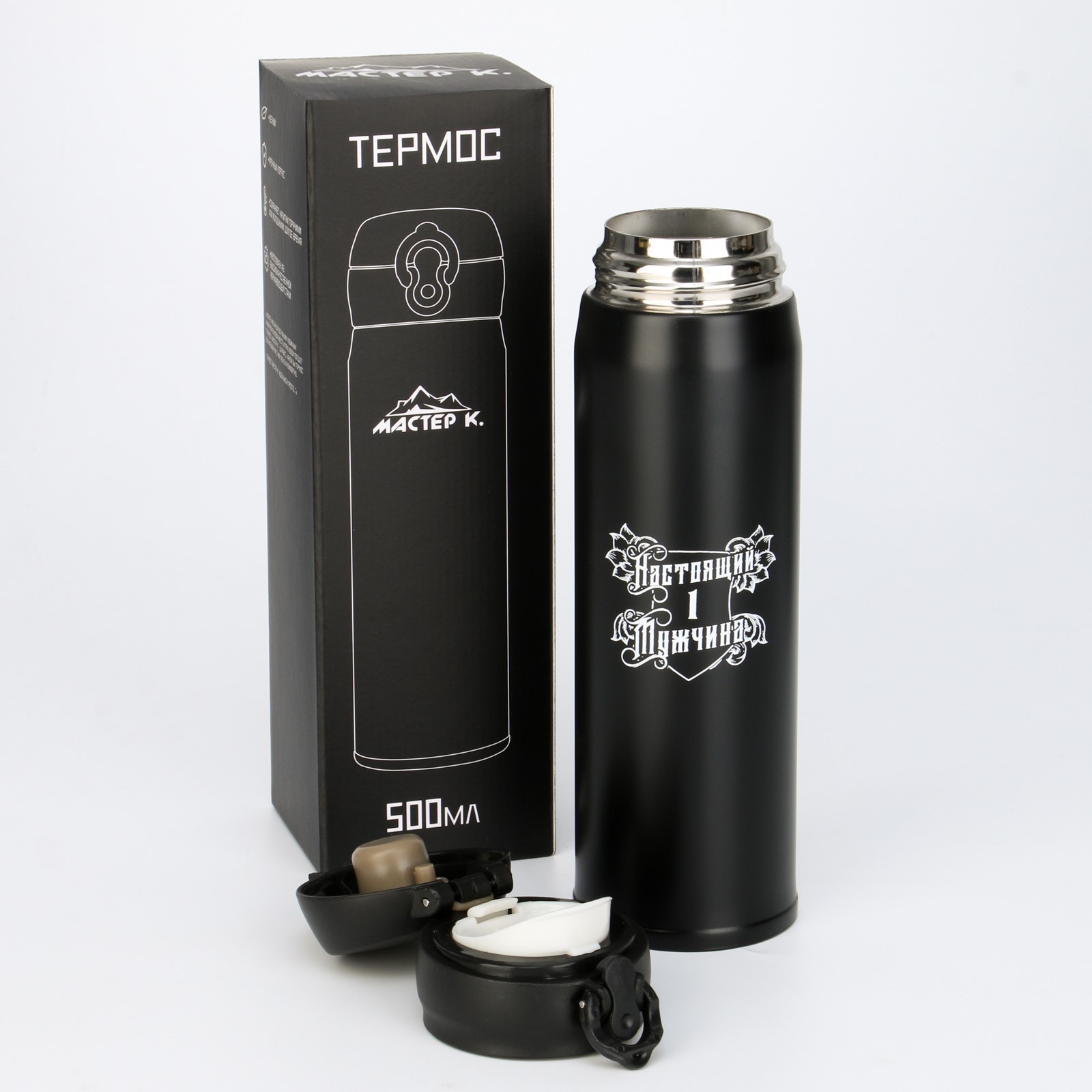 Термос, 420 мл, топ "мастер к. настоящий мужчина", сохраняет тепло 8 ч, 7х26 см. Термос (термокружка) для кофе и чая "Мастер К" идеален для офиса, автомобиля, длительных прогулок и детям в школу. Термос отлично подходит для автомобильных держателей. Благодаря специальному покрытию, надежно лежит в руке. Компактный, экологичный, стильный. Термосы этой серии пользуются большой популярностью у активных и динамичных пользователей, а так же у любителей охоты и рыбалки, так как они, сохраняют прочность и термоустойчивость, легки и компактны. Этот термос просто идеально подойдет для тех, кто ценит свое время и хочет наслаждаться свежим и горячим кофе, чаем или другими любимыми напитками в любой ситуации. Термос "Мастер К" 500 мл (0. 5 л) это яркое решение для любителей чая, кофе, травяных, ягодных и фруктовых заварок. Летом данный термос станет приятным спутником на пляж и в жаркий день, так как он сохраняет напиток холодным. Термос "Мастер К" - это стильный аксессуар и отличный подарок на новый год, другу, подруге, брату, сестре, девушке, папе, маме, мужу, жене, бабушке и дедушке на день рождения, 23 февраля, 8 марта, 14 февраля. Термос (термокружка) сделан из нержавеющей стали 18/8, сконструирован по вакуумной технологии, с двойной стенкой, следовательно, долго держит тепло и не проливается. Снабжен откидывающейся крышкой, изготовленной из экологичного пищевого пластика, имеется кнопка, позволяющая с легкостью использовать термос одной рукой. Удобно: открывать и закрывать одной рукойдержать одной рукой за счет эргономичного дизайнаставить в автомобильный подстаканникпомещать в сумку, рюкзакпить, имеется эргономичный поильник Цвет: Чёрный Для кого: Для мужчины parts count: 0 Объём, л: 0.5 Время сохранения тепла/холода, ч: 8 tnved: 9617000001 Материал корпуса: Нержавеющая сталь Материал: Силикон Материал: Нержавеющая сталь Материал: Пластик Тип горлышка: Стандартное С ручкой: Нет Назначение: Для напитков Материал колбы: Металл Особенности: С кнопкой Особенности: Вакуумный  развернуть описание ▼
