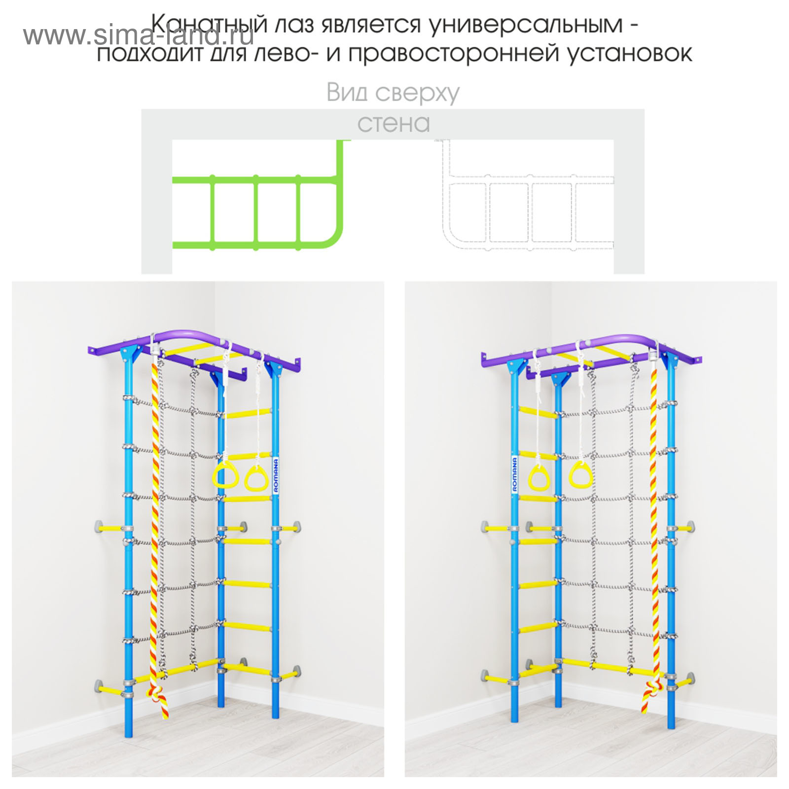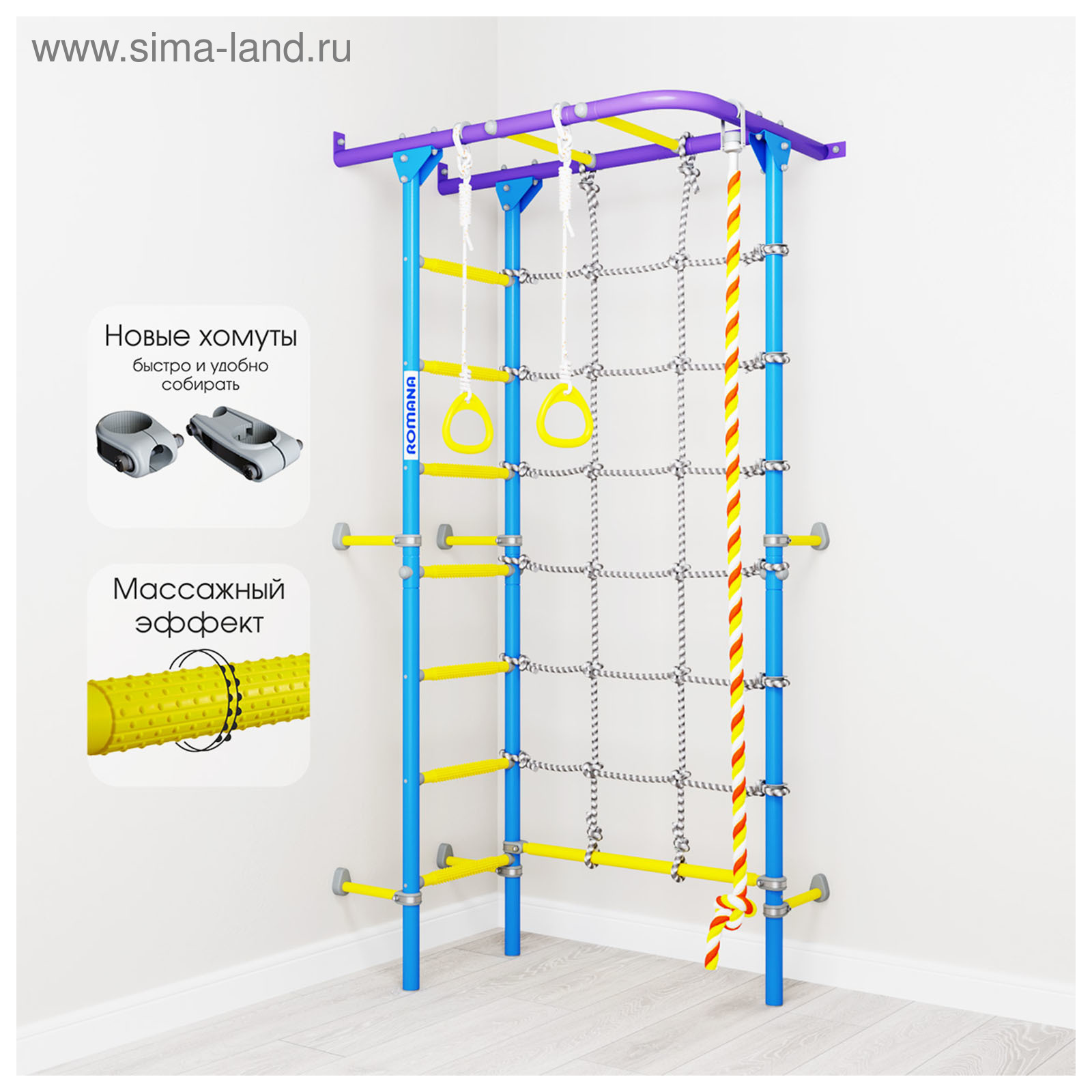 Детский спортивный комплекс s4, цвет сиреневый/голубой. У детского спортивного комплекса ROMANA S4 оригинальная конструкция и расположение элементов. На рукоходе можно разместить разнообразное навесное оборудование. В комплекте предусмотрены канат, кольца и канатный лаз шириной 80 см из крепкого шнура. Конструкция выдерживает вес до 100 кг (нагрузка при испытаниях — 200 кг). Ступени лестницы обладают массажным эффектом, развивая мелкую моторику. Характеристики: Габаритные размеры: 1123 x 700 мм;Высота: 2180 мм;Допустимая нагрузка на комплекс: 100 кг;Тип ступени: Массажная;Расстояние между стойками: 410 мм;Вид крепления: к стене;Упаковка: картонная коробка. Возраст: От 3 лет Maксимальная нагрузка, кг: 100 Глубина комплекса, мм: 700 Ширина комплекса, мм: 1123 Материал: Сталь Тип крепления: К стене Комплектация: Комплекс Комплектация: Кольца Комплектация: Канат Комплектация: Сетка Высота комплекса, мм: 2180 Тип ступеней: Массажные Температурное ограничение: Нет  развернуть описание ▼