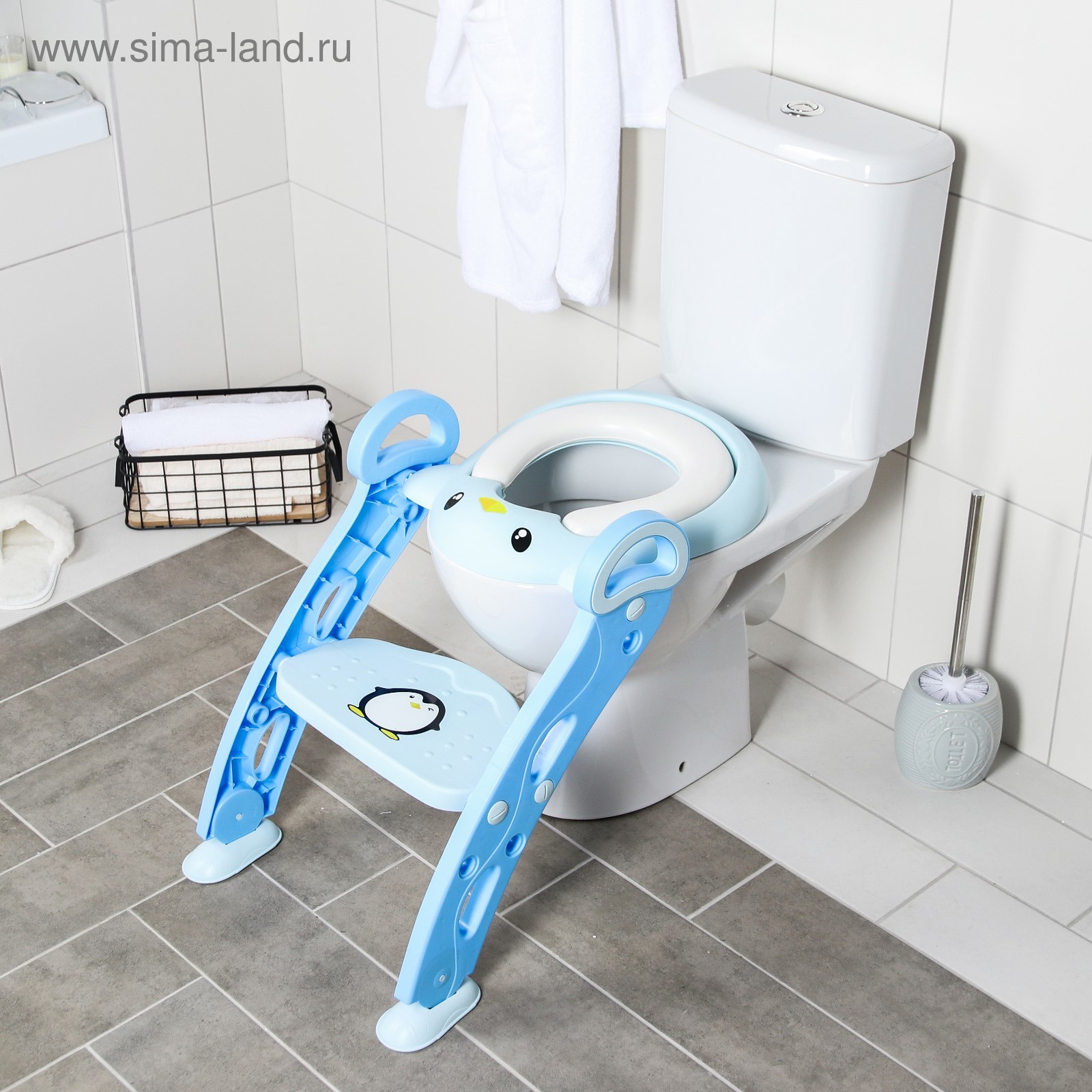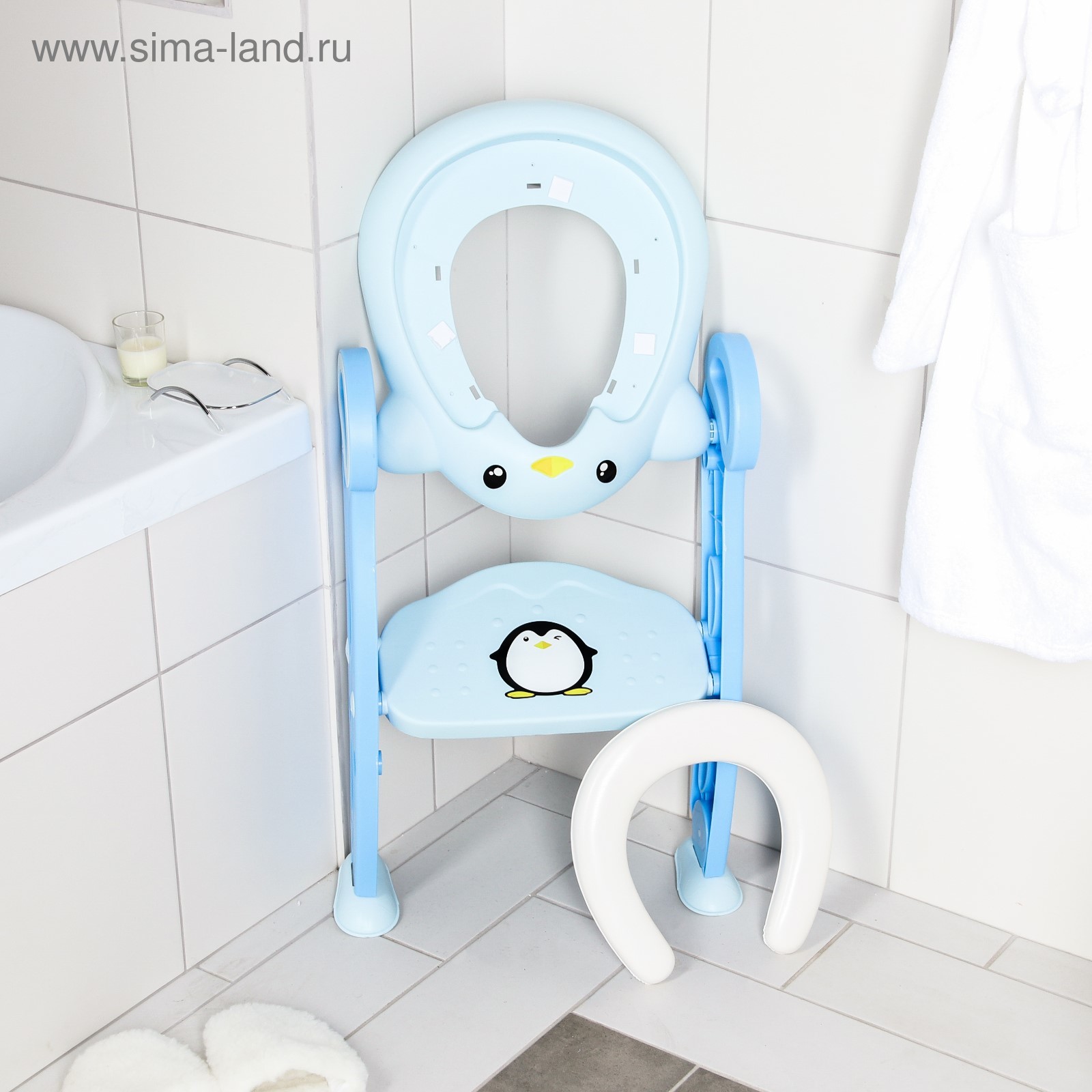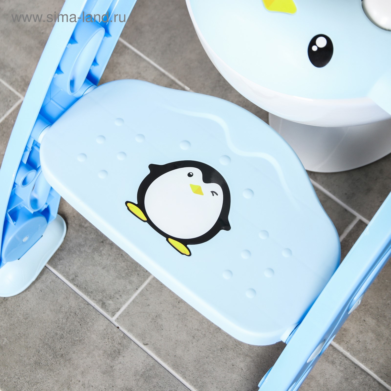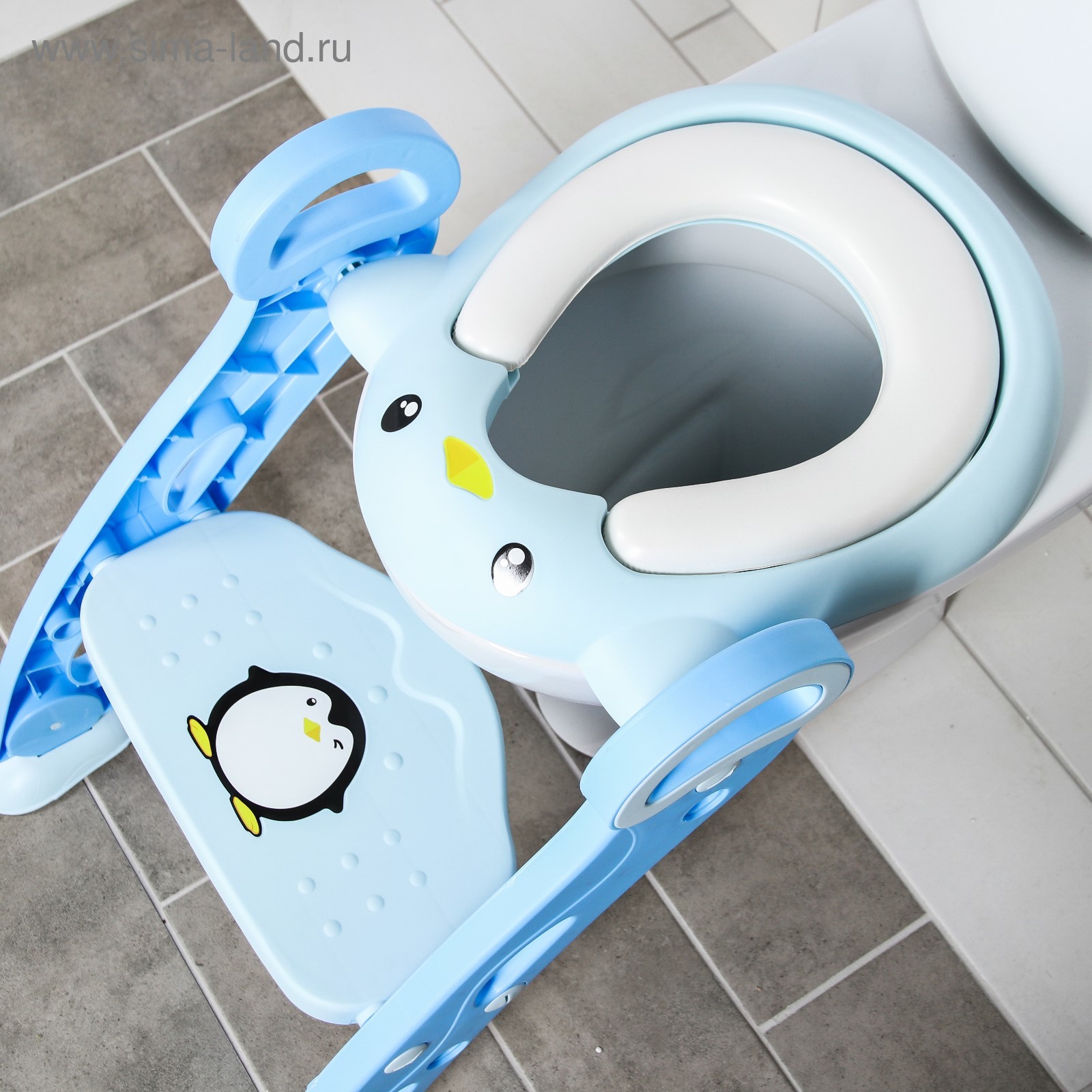 Детская накладка - сиденье на унитаз «пингвин», цвет голубой. Задача этого сиденья - заинтересовать ребенка самостоятельно пользоваться туалетом, а также обеспечить гигиену. Ребенок может легко придвинуть к унитазу сиденье-приставку и сесть, а после использования спуститься и сложить. Конструкция имеет удобные поручни, поэтому ребенок может самостоятельно садиться на унитаз и слезать с него. Кроме того, ступенька служит подставкой для ног, когда малыш сидит на унитазе. В сложенном виде конструкция легко займет минимальное место в углу туалетной комнаты. Широкие нескользящие ножки придают устойчивость всей конструкции а обтекаемые края защитят малыша от повреждений. Цвет: Голубой Для кого: Для мальчика Размер, см: 59 х 39 С ручками: Да Высота, см: 52 Возраст: От 1 года parts count: 0 Материал: Пластик Антискользящие накладки: Да Тип: Детские сиденья Со ступенькой: Да Температурное ограничение: Нет Мягкая накладка: Нет Регулируемая ступенька: Да Размер отверстия, см: 25 х 16  развернуть описание ▼