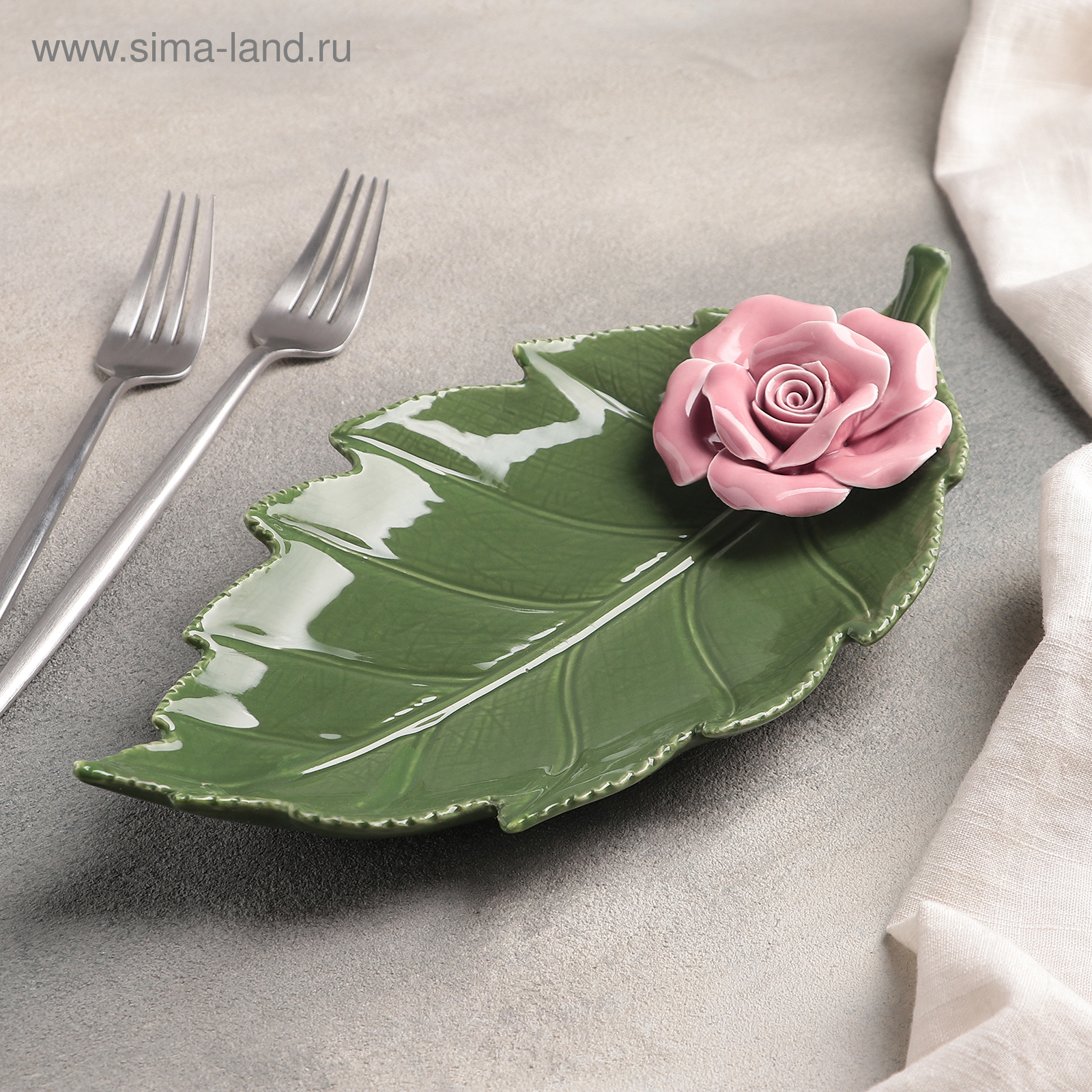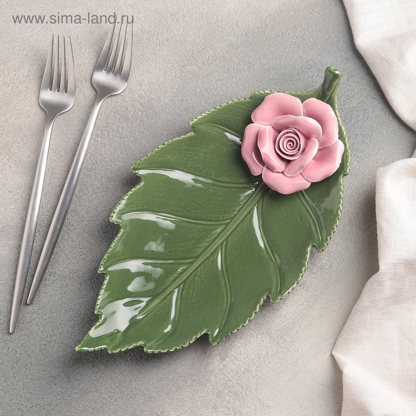 Блюдо керамическое сервировочное «лист с розой», 27x14x4,5 см, цвет зелёно-розовый