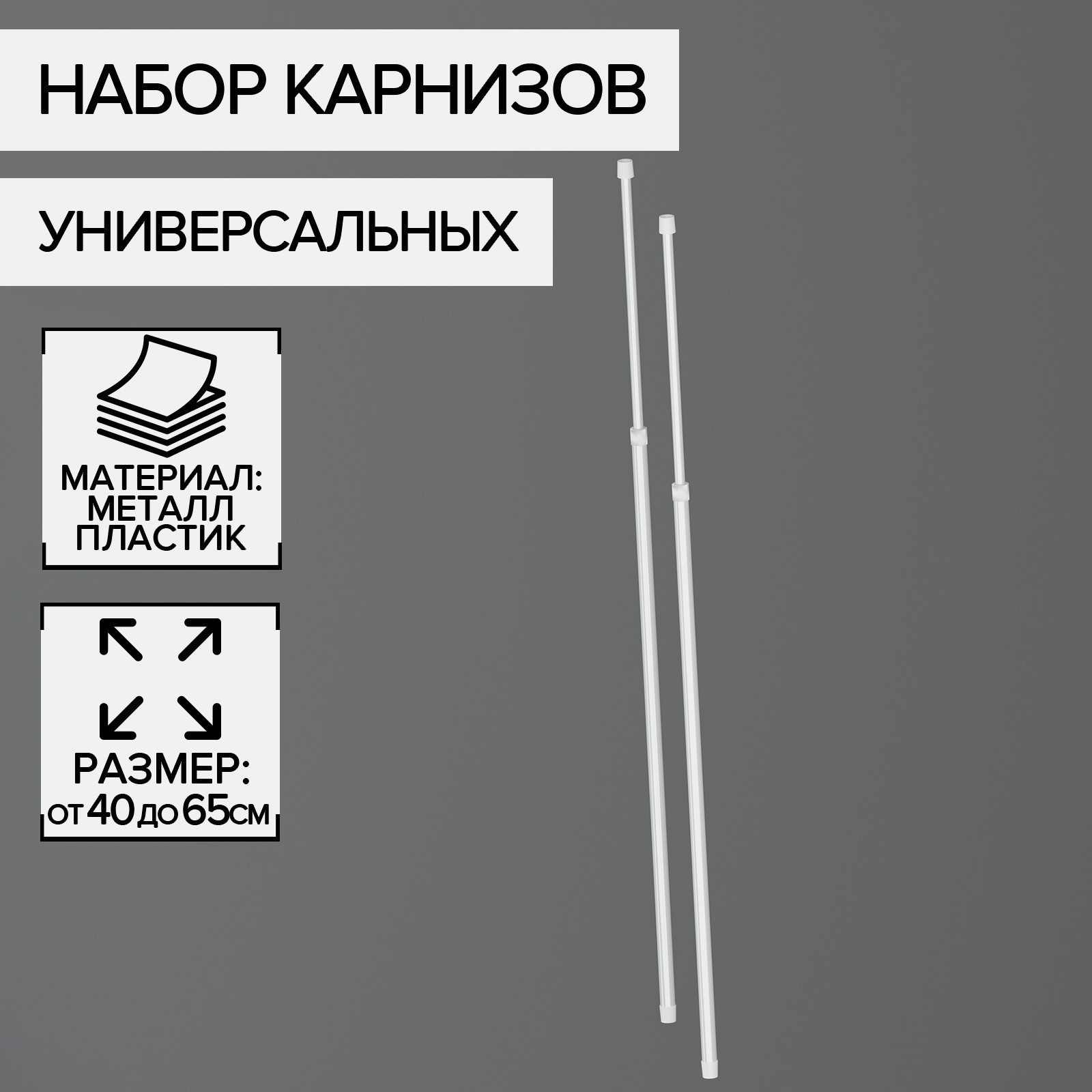 Набор карнизов универсальных 40-65 см, 2 шт, цвет белый. Цвет: Белый Материал: Металл Тип: Карниз Вид карниза: Телескопический Кольца в комплекте: Нет  развернуть описание ▼