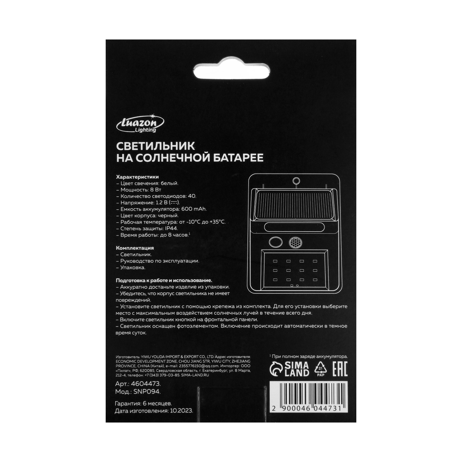 Садовый светильник, уличный, на солнечной батарее с датчиком движения, накладной, 40 Led, свечение белое