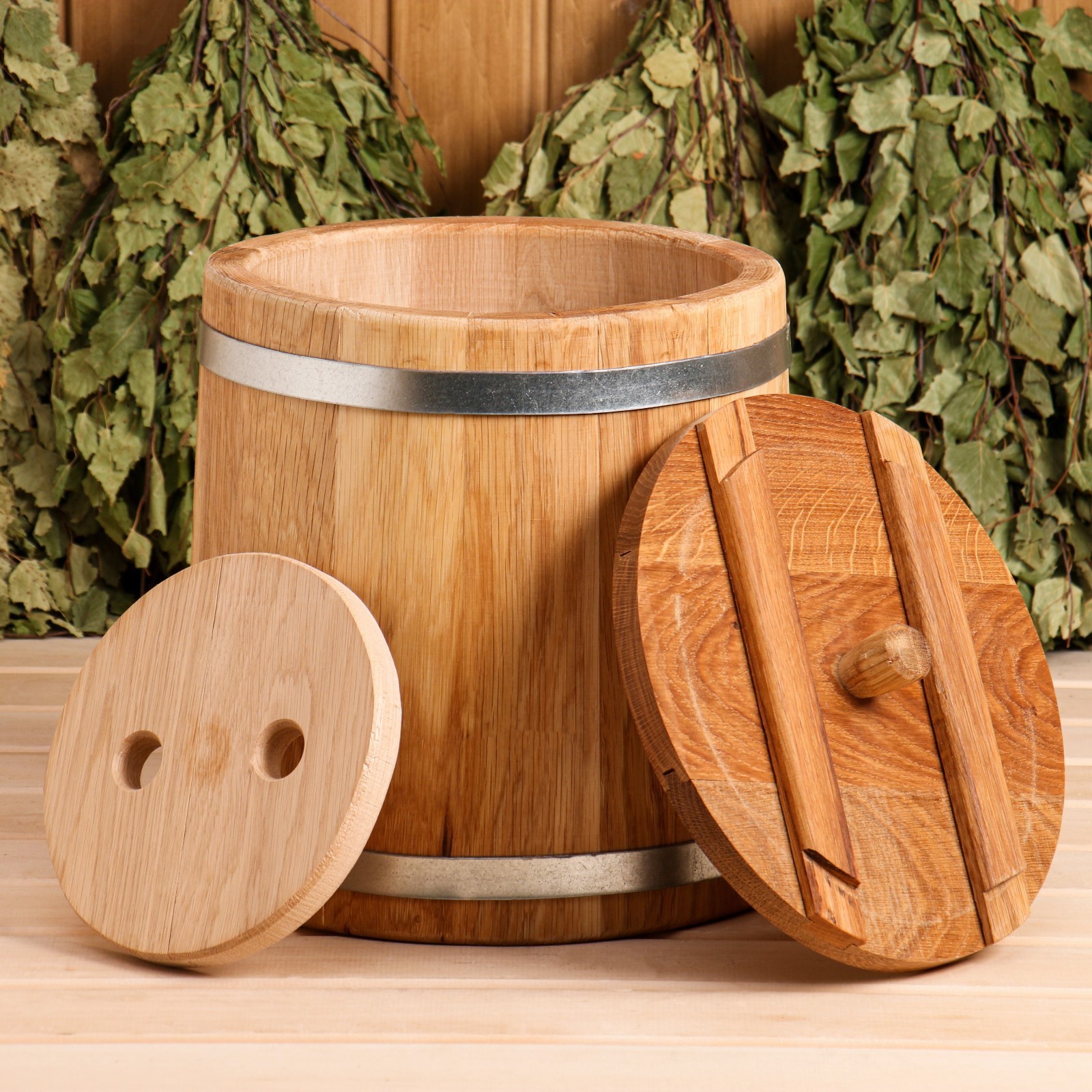 Кадка дубовая, 10л, нержавеющий обруч, с крышкой, с гнетом