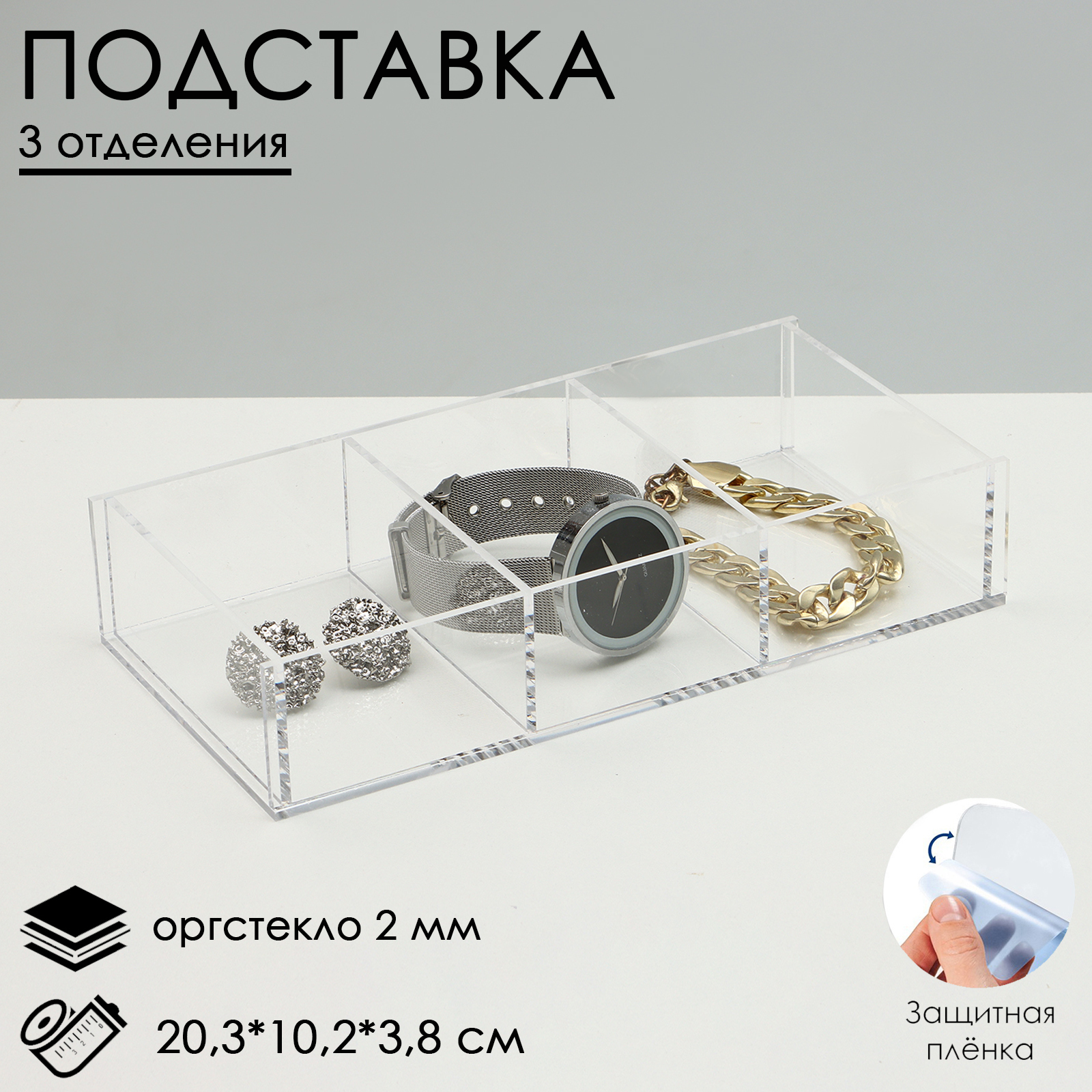 Подставка для презентации, 3 ячейки, 20,3x10,2x3,8 см, оргстекло 2 мм, в защитной плёнке