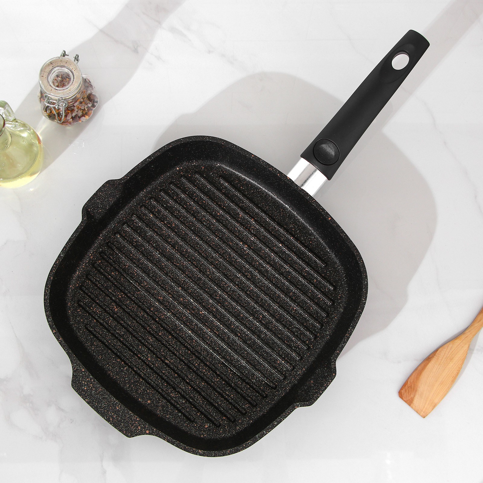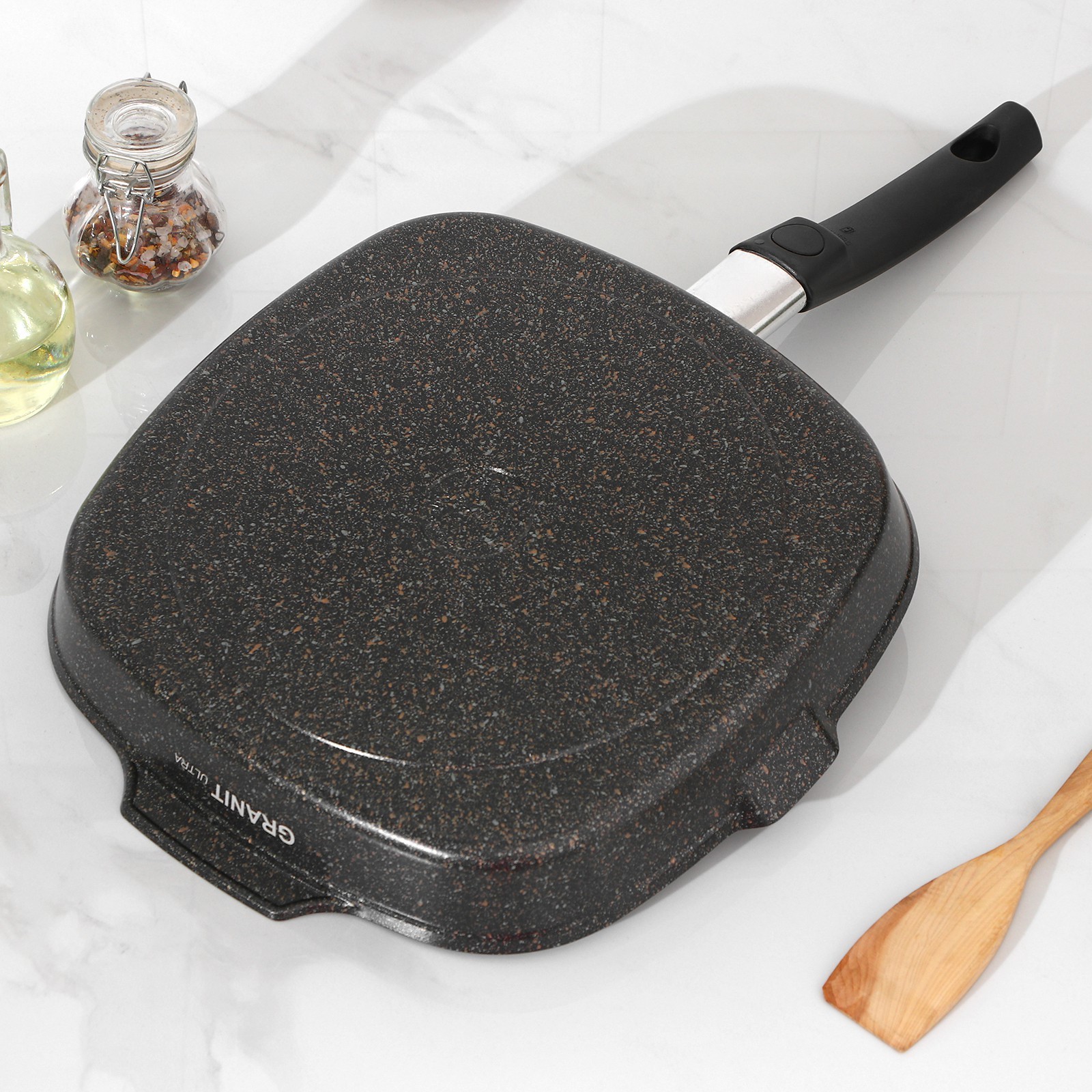 Сковорода-гриль квадратная Granit Ultra, 28x28 см, съёмная ручка, стеклянная крышка, антипригарное покрытие, цвет чёрный