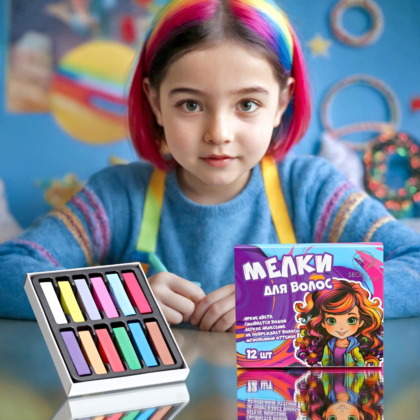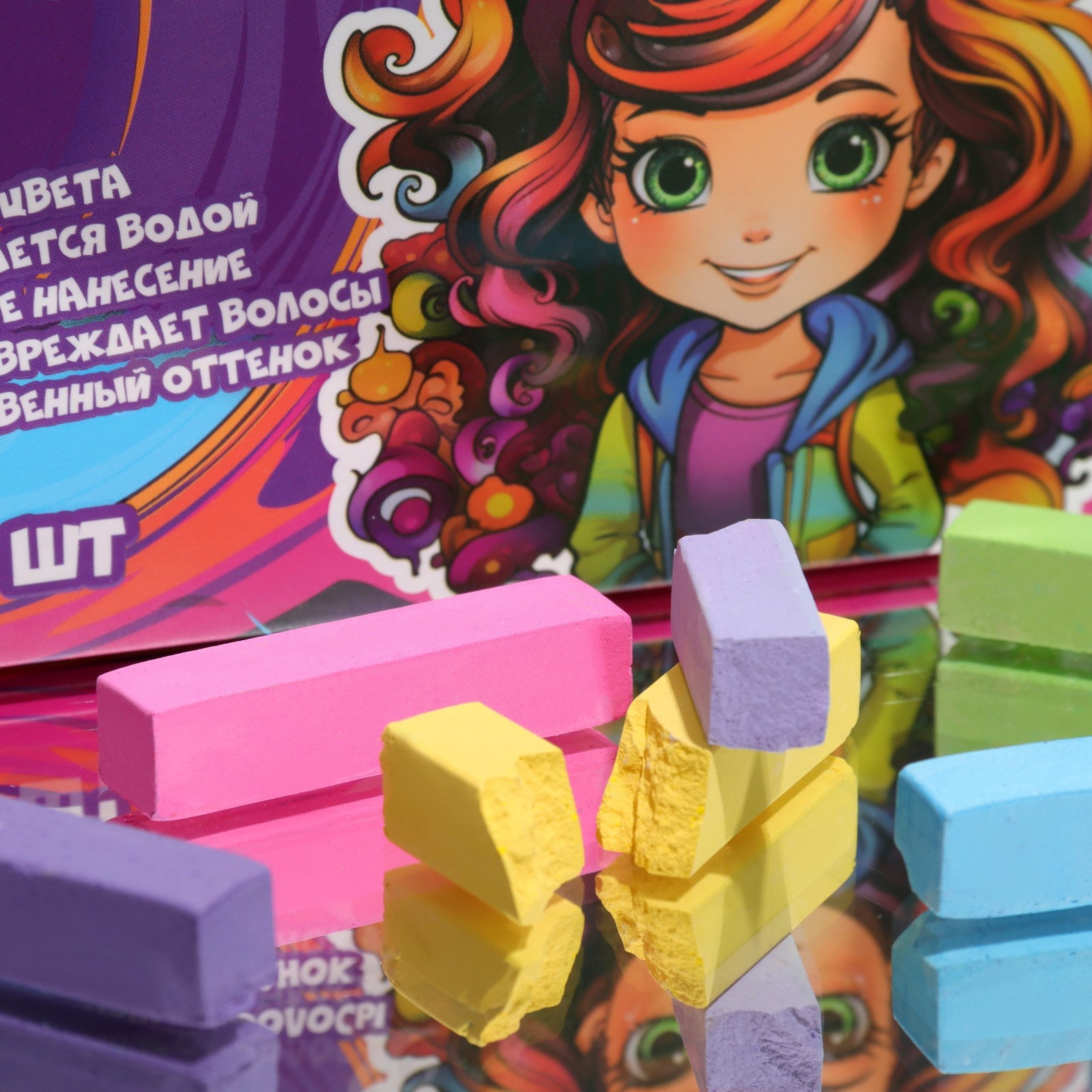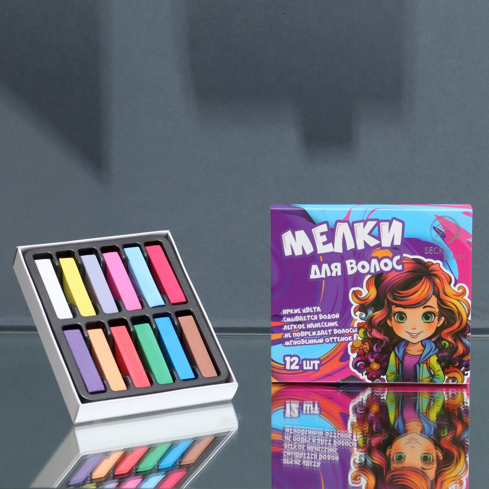 Мелки для волос, 12 шт.. Мелки для волос — то, что нужно юной девчонке или подростку, чтобы подчеркнуть свою индивидуальность. Разноцветные прядки ярких или пастельных оттенков помогут не только ненадолго сменить имидж, но и поднять настроение. С помощью этого средства, юная принцесса, будет блистать своей красотой, радоваться и любоваться собой перед зеркалом. Способ применения: Положи сухое полотенце на плечи, чтобы защитить одежду, или просто надень старую футболку.Смочи немного волосы водой, чтоб мел лучше впитался в волосы.Води выбранным мелком по волосам сверху вниз и закручивай вокруг прядей.Мел впитается лучше, если выпрямить волосы утюжком или завить плойкой.Для дополнительной фиксации, обработай пряди лаком для волос.Не расчесывай пряди после нанесения мела, во избежание его вычесывания.Чтобы смыть цвет, просто вымой голову с шампунем. Светлые волосы, возможно, потребуется вымыть 2 раза.Внимание: под дождем и от воздействия воды мел может попасть на одежду. Состав: talc, synthetic fluorphlogopite, silicon silicate, magnesium stearate, silicone, polybutene, pigment. Возраст применения: с 3-х лет. Набор:Да|Цвет:МИКС|Для кого:Для девочки|Для кого:Для женщины|Тематика праздника:Универсальная тематика|Составляющие набора:Мел для волос|Количество цветов в наборе:12|Страна:Китай  развернуть описание ▼
