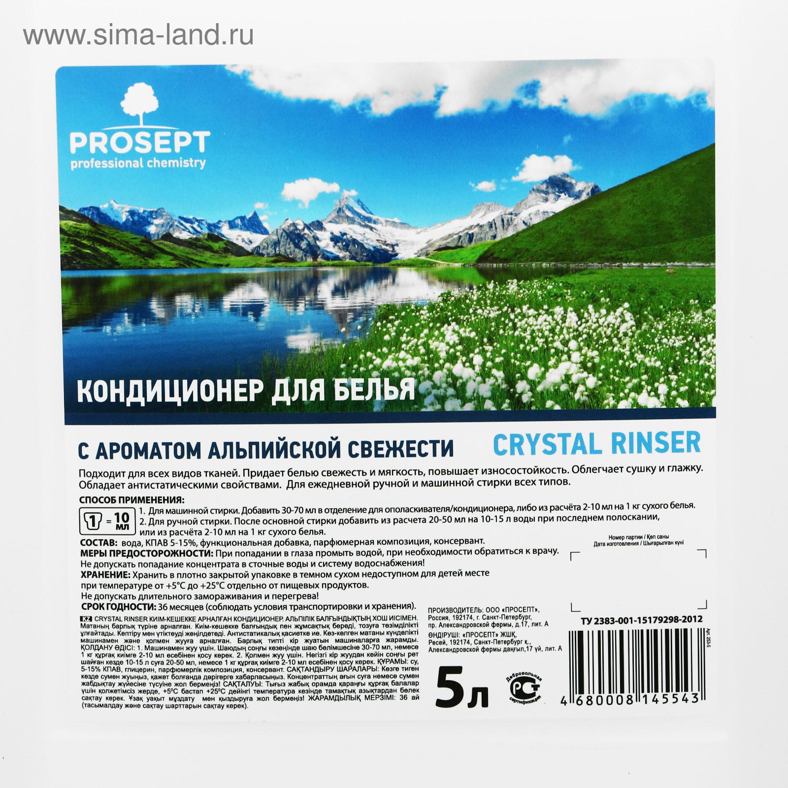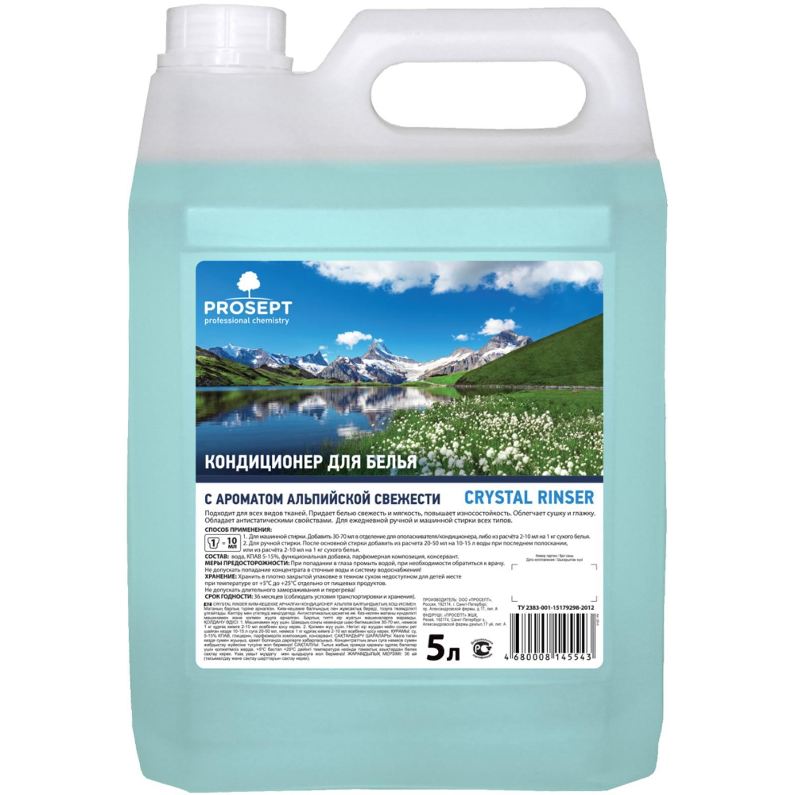 Кондиционер для белья crystal rinser "альпийская свежесть", концентрат, 5 л. Кондиционер для белья, для всех видов тканей. Придает белью свежесть и мягкость, повышает износостойкость. Облегчает сушку и глажку. Обладает антистатическими свойствами. Для ежедневной машинной и ручной стирки любых тканей. Подходит для стиральных машин всех типов. Способ применения: добавить 30-70 мл в отделение ополаскивателя при последнем цикле полоскания, либо из расчета 2-10 мл на 1 кг сухого белья. Для ручной стирки добавить из расчета 20-50 мл на 10-15 л воды при последнем полоскании, или из расчета 2-10 мл на 1 кг сухого белья. Меры предосторожности: при попадании в глаза промыть большим количеством воды. При необходимости обратиться к врачу. Не допускать длительного замораживания перегрева. Состав: вода, кпав 5-15%, глицерин, парфюмерная композиция , консервант. parts count: 0 Объём, л: 5 Аромат: Свежесть Назначение: Для белых тканей Назначение: Для всех видов тканей : 0 Температурное ограничение: Нет Особенности средства: Концентрат  развернуть описание ▼