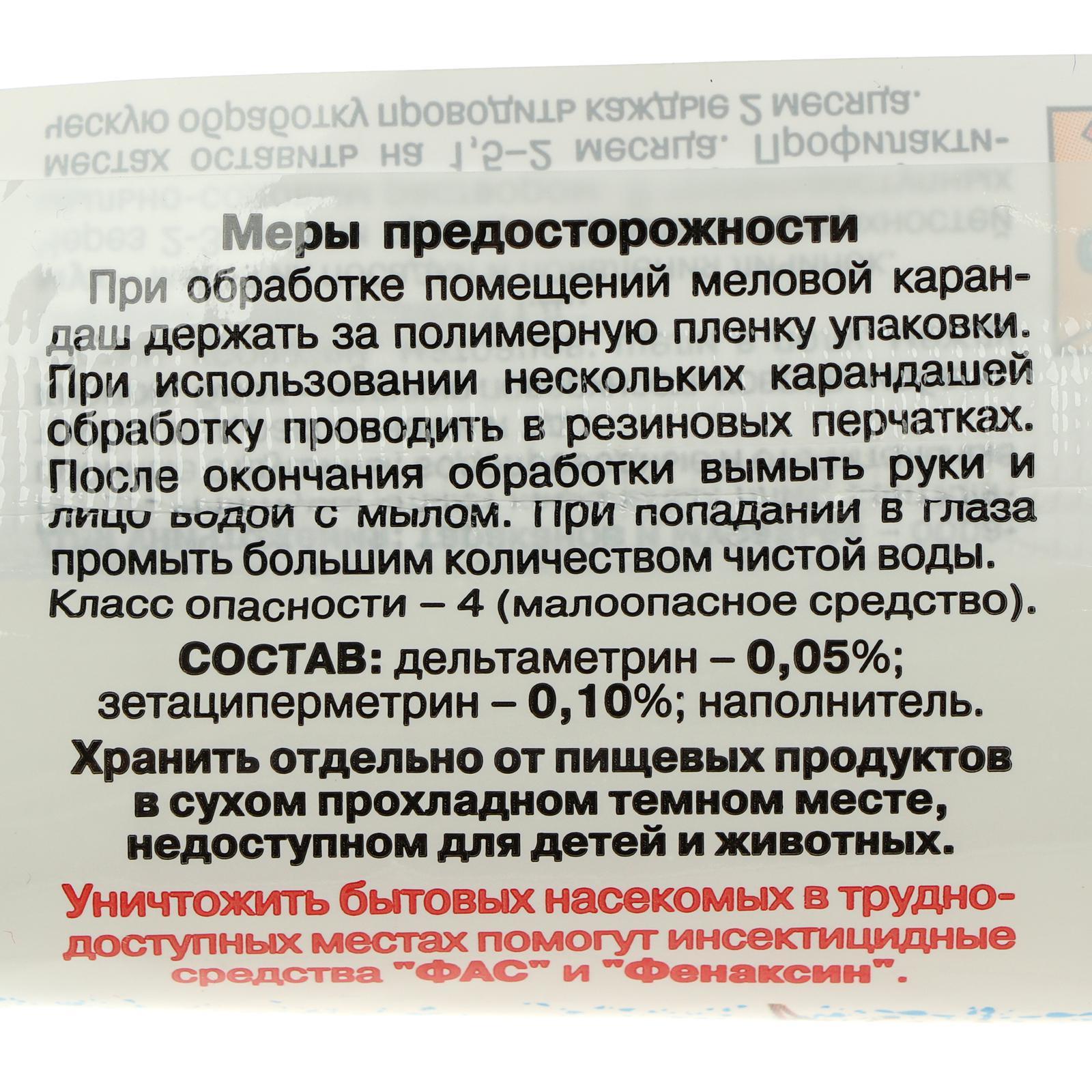 Мелок от тараканов "машенька" серебряная, 20г. Средство предназначено для уничтожения тараканов, муравьев, клопов, блох и обработки мест посадки мух на объектах различных категорий как персоналом организаций, имеющих право заниматься дезинфекционной деятельностью, так и населению в быту. СОСТАВЗетациперметрин – 0, 1%, дельтаметрин – 0, 05%, гипс, мел. СПОСОБ ПРИМЕНЕНИЯОсвободите часть карандаша из упаковки и, держа за полиэтилен, нанесите несколько полос шириной 2-4см на поверхности, которые могут быть местами передвижения, скопления или обитания насекомых. Повторные обработки проводят по энтомологическим показаниям (при появлении насекомых). Норма расхода 1 карандаша (массой 20-30г) на 20-30м2 обрабатываемой поверхности. синатропные тараканы: мелком наносят полосы по поверхностям плинтусов, дверных коробок, вентиляционных решеток, по задним стенкам шкафов, столов, тумб, по трубам водопроводной и отопительной систем (особенно в местах их ввода и вывода). Обрабатывают поверхности в местах сбора мусора и нижнюю часть раковин. Обработку проводят одновременно во всех помещениях, где обнаружены тараканы а также смежных помещениях, чтобы предотвратить их заселение. рыжие домовые муравьи: мелком обрабатывают места их скопления и пути передвижения «дорожки». постельные клопы: средство наносят полосами на места обнаружения или возможного обитания насекомых таких, как картины, мебель и задняя поверхность ковров. блохи: мелком обрабатывают плинтусы и стены на высоту не более 1м, а также проводят полосы вдоль щелей в полу, между стенами и плинтусами. комнатные мухи: мелком проводят полосы по стыкам стекол и рам, по верхним частям дверей, шкафов, кухонной мебели и другим местам вероятной посадки. Вид средства: Мелок Температурное ограничение: Нет  развернуть описание ▼